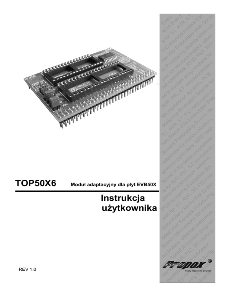 TOP50X6 Moduł adaptacyjny dla płyt EVB50X Instrukcja użytkownika REV 1.0 u rd ST, ta- rve l a a , S e Ev Bo VR ers b S d l n io 1, A trol We mo t i a ‘5 in ron ed r c fo cro dd s M the e s d i m mb oar rs, e peC E B S PI its ng rolle gh r K pi nt Hi fo r y o rte tot roc FID ers s o r Pr mic s, R mm lle rs or ler gra tro f ol n o s pr oco CB e ntr l u o m icr s, P for c e t t m s s ne Sy T stem ard In , S sy Bo trol C ed PI or ion on b s , c e R ce luat cro W V o A pr va mi ed idd ro E ic ng PIC be ds m M ni T, m r , ig , S s E oa ers s B t de VR Ki ng troll h i r , A rte typ on Hig 1 c ‘5 Sta oto ro ID r e ic F rs P le rs or m s, R mm ve s f ller gra ntrl r Se ule tro pro oco od con ms icr s, m ni net ste T m stem y S y r he In S C, r s Bo t e d PI eso tion ice , e R oc ua m Sp AV opr val IC e r fo icr g E T, P mb rs s M nin , S E s ing r ig t R i e l ol des , AV er K typ B `51 tart roto roS s P mic , PC for s s ller er for lers d ar tro erw les trol on b S du con ram c ro We imo et rog o n p n ed Mi her m roc d d ds et ste ic ar rs, Sy T m r o B olle In , S so tr ed IC oce ign P s co Spe R, opr De V cr B Rion h t ig r A Mi PC lua H f o rs , s oneasolution e Many ideas s er roll em Ev ds m nt st ng oar y o c S ni B Wprowadzenie Moduł TOP50X6 stanowi rozszerzenie dla płyt EVB50X pozwalające na obsługę mikrokontrolerów rodziny ’51 w obudowach DIP40 z zewnętrzną pamięcią programu EPROM/FLASH w obudowie DIP28 lub DIP32. Moduł posiada również miejsce na rezonator kwarcowy używany przez wewnętrzny oscylator zegarowy mikrokontrolera, rezonator przyłączany jest do wyprowadzeń mikrokontrolera przy pomocy zworek. Instalacja modułu w płytach EVB50X Prosimy o zwrócenie szczególnej uwagi podczas instalacji i demontażu modułów adaptacyjnych TOP50XX. Prawidłowe umieszczenie i demontaż modułu w płytach EVB50X pokazano na rysunku 1. Rysunek 1 Instalacja i demontaż modułów adaptacyjnych TOP50XX Obsługiwane układy Moduł obsługuje następujące mikrokontrolery: 80C31, 80C32, 87C51, 87C52, DS80C320, DS, 80C520, AT89C51, AT89C52, AT89C55, AT89S53, AT89S8252 oraz wszystkie mikrokontrolery z wyprowadzeniami zgodnymi z mikrokontrolerem 8051 Moduł obsługuje następujące pamięci programu: 27C128, 27C256, 27C512, 27C010, 27C020, 27C040, 28F256, 28F512, 28F010, 28F020, 29C256, 29C512, 29C010, 29C020 2 Opis modułu Moduł TOP50X6 posiada podstawkę oznaczoną jako `51 pod kontrolery rodziny `51 w obudowach DIP40. Mikrokontrolery mogą współpracować z zewnętrzną pamięcią programu w obudowach DIP28 lub DIP32 umieszczoną w podstawce oznaczonej jako EPROM/FLASH. W wypadku użycia pamięci w obudowie DIP28, powinna ona być maksymalnie dosunięta do końca podstawki. Źródło sygnału zegarowego Moduł umożliwia wybór źródła sygnału zegarowego mikrokontrolerów poprzez ustawienie zworki XTAL. Źródłem sygnału zegarowego może być wewnętrzny oscylator płyty EVB503 lub rezonator kwarcowy oznaczony na module jako CRYSTAL. Ustawienia zworki XTAL oraz źródło sygnału zegarowego pokazano na kolejnym rysunku. Rezonator kwarcowy Oscylator płyty EVB503 3 Sygnały /WR, /RD Sygnały płyty EVB50X /WR ,/RD mogą być połączone z odpowiadającymi im sygnałami modułu adaptacyjnego poprzez zamknięcie zworek WR, RD co pokazano na kolejnym rysunku. Sygnał EA Otwarcie zworki EA powoduje podanie stanu wysokiego na wyprowadzenie EA mikrokontrolera co powoduje ustawienie trybu pracy z wewnętrzną pamięcią programu mikrokontrolera. Zamknięcie zworki powoduje (kolejny rysunek) podanie stanu niskiego na wyprowadzanie EA mikrokontrolera i wymusza tryb pracy z zewnętrzną pamięcią programu. Zewnętrzna pamięć programu Minimoduł współpracuje z pamięciami EPROM lub Flash w obudowach DIP28 lub DIP32. W wypadku użycia pamięci w obudowach DIP28 pamięć powinna być umieszczona w taki sposób aby koniec układu scalonego pokrywał się z końcem podstawki. Dla niektórych pamięci Flash/EEPROM o pojemności mniejszej od 64kB konieczne jest odpowiednie ustawienie zworki P3, która przełącza wyprowadzenie 3 podstawki DIP32 między sygnałem adresowym A15 a napięciem zasilania VTG. Dla pamięci o pojemności większej od 64kB konieczne jest umieszczenie programu w odpowiedniej lokacji pamięci 4 wynikającej z wymuszonych stanów podanych na linie adresowe A16, A17,A18. Stany podane na linie adresowe pokazano na schemacie. Schemat CRYSTAL ADC0 ADC1 ADC2 ADC3 ADC4 ADC5 ADC6 ADC7 AGND AGND AREF AVCC PB0 PB1 PB2 PB3 PB4 PB5 PB6 PB7 PD0 PD1 PD2 PD3 PD4 PD5 PD6 PD7 /RESET CLOCK GND VTG CLOCK VTG OSC1 OSC2 10k 1 2 3 VTG VTG /RESET BC 557 2k7 RESET 100n 100n 10k WR PD6 /WR RD PD7 /RD PB0 PB1 PB2 PB3 PB4 PB5 PB6 PB7 VTG 10k PD0 PD1 PD2 PD3 PD4 PD5 PD6 PD7 RESET ALE PSEN ALE 1 2 3 4 5 6 7 8 10 11 12 13 14 15 16 17 9 30 29 31 20 1 2 3 VTG P1.0/T2 P1.1/T2EX P1.2/RXD1 P1.3/TXD1 P1.4/INT2 P1.5/INT3 P1.6/INT4 P1.7/INT5 P3.0/RXD0 P3.1/TXD0 P3.2/INT0 P3.3/INT1 P3.4/T0 P3.5/T1 P3.6/WR P3.7/RD RST ALE PSEN EA VCC AD0 AD1 AD2 AD3 AD4 AD5 AD6 AD7 P2.0/A8 P2.1/A9 P2.2/A10 P2.3/A11 P2.4/A12 P2.5/A13 P2.6/A14 P2.7/A15 X1 X2 40 39 38 37 36 35 34 33 32 21 22 23 24 25 26 27 28 PA0 PA1 PA2 PA3 PA4 PA5 PA6 PA7 PC0 PC1 PC2 PC3 PC4 PC5 PC6 PC7 19 18 OSC1 OSC2 GND `51 PC7 2 3 4 5 6 7 8 9 PA7 PA6 PA5 PA4 PA3 PA2 PA1 PA0 11 1 ALE 19 18 17 16 15 14 13 12 Q1 Q2 Q3 Q4 Q5 Q6 Q7 Q8 GND A7 A6 A5 A4 A3 A2 A1 A0 2 4 6 8 10 12 14 16 18 20 22 24 26 28 30 32 34 36 38 40 42 44 46 48 50 52 54 56 58 60 62 PA0 PA1 PA2 PA3 PA4 PA5 PA6 PA7 PC0 PC1 PC2 PC3 PC4 PC5 PC6 PC7 /WR /RD ALE MODULES C OC 74HC573 VTG A0 A1 A2 A3 A4 A5 A6 A7 PC0 PC1 PC2 PC3 PC4 PC5 PC6 PSEN VTG D1 D2 D3 D4 D5 D6 D7 D8 1 3 5 7 9 11 13 15 17 19 21 23 25 27 29 31 33 35 37 39 41 43 45 47 49 51 53 55 57 59 61 12 11 10 9 8 7 6 5 27 26 23 25 4 28 29 3 24 31 22 32 A0 A1 A2 A3 A4 A5 A6 A7 A8 A9 A10 A11 A12 A13 A14 A15 I/O0 I/O1 I/O2 I/O3 I/O4 I/O5 I/O6 I/O7 OE WE CE VCC DIP32 (AT29C512) 13 14 15 17 18 19 20 21 PA0 PA1 PA2 PA3 PA4 PA5 PA6 PA7 A0