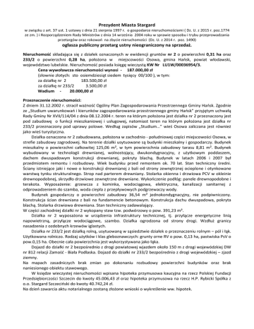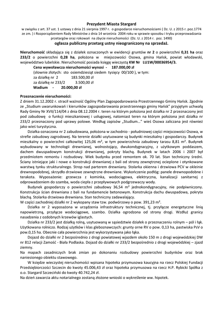 Prezydent Miasta Stargard w związku z art. 37 ust. 1 ustawy z dnia 21 sierpnia 1997 r. o gospodarce nieruchomościami ( Dz. U. z 2015 r. poz.1774 ze zm. ) i Rozporządzeniem Rady Ministrów z dnia 14 września 2004 roku w sprawie sposobu i trybu przeprowadzania przetargów oraz rokowań na zbycie nieruchomości (Dz. U. z 2014 r. poz. 1490) ogłasza publiczny przetarg ustny nieograniczony na sprzedaż. Nieruchomość składająca się z działek oznaczonych w ewidencji gruntów nr 2 o powierzchni 0,31 ha oraz 233/2 o powierzchni 0,28 ha, położona w miejscowości Osowa, gmina Hańsk, powiat włodawski, województwo lubelskie. Nieruchomość posiada księgę wieczystą KW Nr LU1W/00036954/3. Cena wywoławcza nieruchomości wynosi - 187.000,00 zł (słownie złotych: sto osiemdziesiąt siedem tysięcy 00/100 ), w tym: za działkę nr 2 183.500,00 zł za działkę nr 233/2 3.500,00 zł Wadium 20.000,00 zł Przeznaczenie nieruchomości: Z dniem 31.12.2002 r. stracił ważność Ogólny Plan Zagospodarowania Przestrzennego Gminy Hańsk. Zgodnie ze „Studium uwarunkowań i kierunków zagospodarowania przestrzennego gminy Hańsk” przyjętym uchwałą Rady Gminy Nr XVII/114/04 z dnia 08.12.2004 r. teren na którym położona jest działka nr 2 przeznaczony jest pod zabudowę o funkcji mieszkaniowej i usługowej, natomiast teren na którym położona jest działka nr 233/2 przeznaczony pod uprawy polowe. Według zapisów „Studium…” wieś Osowa zaliczana jest również jako wieś turystyczna. Działka oznaczona nr 2 zabudowana, położona w zachodnio - południowej części miejscowości Osowa, w strefie zabudowy zagrodowej. Na terenie działki usytuowane są budynki mieszkalny i gospodarczy. Budynek mieszkalny o powierzchni całkowitej 125,06 m², w tym powierzchnia zabudowy tarasu 8,81 m². Budynek wybudowany w technologii drewnianej, wolnostojący, dwukondygnacyjny, z użytkowym poddaszem, dachem dwuspadowym konstrukcji drewnianej, pokryty blachą. Budynek w latach 2006 i 2007 był przedmiotem remontu i rozbudowy. Wiek budynku przed remontem ok. 70 lat. Stan techniczny średni. Ściany istniejące jaki i nowe o konstrukcji drewnianej z bali od strony zewnętrznej ocieplone i otynkowane warstwą tynku strukturalnego. Strop nad parterem drewniany. Stolarka okienna i drzwiowa PCV w okleinie drewnopodobnej, skrzydło drzwiowe zewnętrzne drewniane. Wykończenie podłóg: panele drewnopodobne i terakota. Wyposażenie: grzewcza z kominka, wodociągowa, elektryczna, kanalizacji sanitarnej z odprowadzeniem do szamba, woda ciepła z przepływowych podgrzewaczy wody. Budynek gospodarczy o powierzchni zabudowy 36,54 m² jednokondygnacyjny, nie podpiwniczony. Konstrukcja ścian drewniana z bali na fundamencie betonowym. Konstrukcja dachu dwuspadowa, pokryta blachą. Stolarka drzwiowa drewniana. Stan techniczny zadawalający. W części zachodniej działki nr 2 wykopany staw tzw. podwórzowy o pow. 391,23 m². Działka nr 2 wyposażona w urządzenia infrastruktury technicznej, tj. przyłącze energetyczne linią napowietrzną, przyłącze wodociągowe, szambo. Działka ogrodzona od strony drogi. Wzdłuż granicy nasadzenia z ozdobnych krzewów iglastych. Działka nr 233/2 jest działką rolną, usytuowaną w sąsiedztwie działek o przeznaczeniu rolnym – pól i łąk. Użytkowana rolniczo. Rodzaj użytków i klas gleboznawczych: grunty orne RV o pow. 0,13 ha, pastwiska PsV o pow.0,15 ha. Obecnie cała powierzchnia jest wykorzystywana jako łąka. Dojazd do działki nr 2 bezpośrednio z drogi powiatowej wjazdem około 150 m z drogi wojewódzkiej DW nr 812 relacji Zamość - Biała Podlaska. Dojazd do działki nr 233/2 bezpośrednio z drogi wojewódzkiej – zjazd ziemny. Na mapach zasadniczych brak zmian po dokonaniu rozbudowy powierzchni budynków oraz brak naniesionego obiektu stawowego. W księdze wieczystej nieruchomości wpisana hipoteka przymusowa kaucyjna na rzecz Polskiej Fundacji Przedsiębiorczości Szczecin do kwoty 45.006,43 zł oraz hipoteka przymusowa na rzecz H.P. Rybicki Spółka z o.o. Stargard Szczeciński do kwoty 40.742,24 zł. Na dzień zawarcia aktu notarialnego zostaną złożone wnioski o wykreślenie ww. hipotek. UWAGA: 1. Przetarg odbędzie się w siedzibie Stargardzkiego TBS - ul. Struga 29 w Stargardzie w sali przetargów - o godz. 13,30 ; dnia 16 stycznia 2017 r. r. 2. Wadium w wyżej określonej wysokości winno wpłynąć na konto Stargardzkiego TBS Sp. z o.o. w Banku PEKAO S.A. I O/Stargard Nr 10124039011111000042204466 najpóźniej w dniu 11 stycznia 2017 r. 3. O wysokości postąpienia decydują uczestnicy przetargu, z tym że wysokość postąpienia nie może być niższa niż 1 % ceny wywoławczej. 4. Wyniki przetargu podlegają zatwierdzeniu przez Prezydenta Miasta Stargard . 5. Wpłacone wadium przez uczestnika, który wygra przetarg zalicza się na poczet ceny nabycia nieruchomości, pozostałym uczestnikom wpłacone wadium zostanie zwrócone w terminie 3 dni od dnia zamknięcia przetargu z zastrzeżeniem, że dniem zwrotu wadium jest dzień obciążenia rachunku bankowego Stargardzkiego TBS Sp. z o.o. 6. Organizator przetargu zawiadomi osobę ustaloną jako nabywcę nieruchomości o miejscu i terminie zawarcia umowy notarialnej. Jeżeli osoba ustalona jako nabywca nieruchomości nie stawi się bez usprawiedliwienia w miejscu i terminie podanym w zawiadomieniu, organizator przetargu odstąpi od zawarcia umowy, a wpłacone wadium nie podlega zwrotowi. 7. Nabywca przejmuje nieruchomość w stanie istniejącym. 8. Nieruchomość oglądać można po wcześniejszym uzgodnieniu terminu pod nr tel. 515 980 803 9. Koszty zawarcia aktu notarialnego w całości ponosi nabywca nieruchomości. 10.Prezydent Miasta Stargard ma prawo odwołania przetargu w przypadku uzasadnionej przyczyny. Niniejsze ogłoszenie o przetargu zostało wywieszone w terminie od dnia 01.12.2016 r. do 16.01.2017 r. na tablicach ogłoszeń Urzędu Miejskiego i Stargardzkiego TBS Sp. z o.o. oraz za