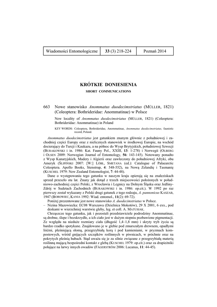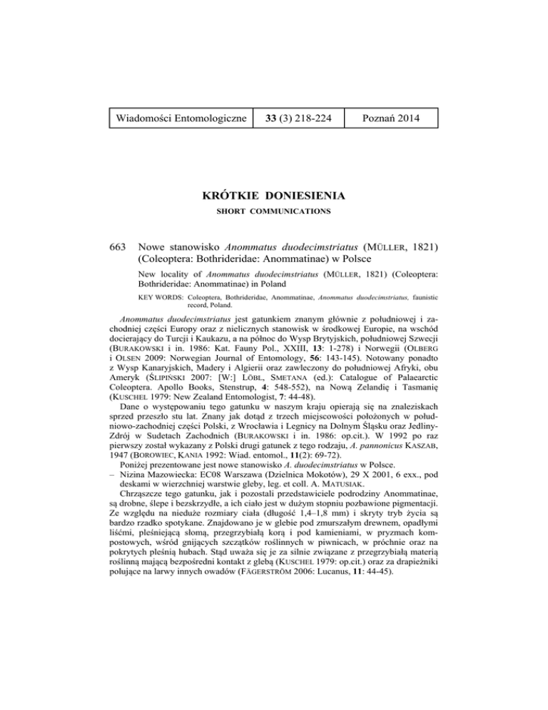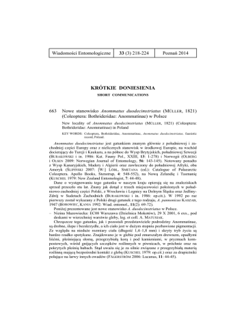 Wiadomości Entomologiczne 33 (3) 218-224 Poznań 2014 KRÓTKIE DONIESIENIA SHORT COMMUNICATIONS 663 Nowe stanowisko Anommatus duodecimstriatus (MÜLLER, 1821) (Coleoptera: Bothrideridae: Anommatinae) w Polsce New locality of Anommatus duodecimstriatus (MÜLLER, 1821) (Coleoptera: Bothrideridae: Anommatinae) in Poland KEY WORDS: Coleoptera, Bothrideridae, Anommatinae, Anommatus duodecimstriatus, faunistic record, Poland. Anommatus duodecimstriatus jest gatunkiem znanym głównie z południowej i zachodniej części Europy oraz z nielicznych stanowisk w środkowej Europie, na wschód docierający do Turcji i Kaukazu, a na północ do Wysp Brytyjskich, południowej Szwecji (BURAKOWSKI i in. 1986: Kat. Fauny Pol., XXIII, 13: 1-278) i Norwegii (OLBERG i OLSEN 2009: Norwegian Journal of Entomology, 56: 143-145). Notowany ponadto z Wysp Kanaryjskich, Madery i Algierii oraz zawleczony do południowej Afryki, obu Ameryk (ŚLIPIŃSKI 2007: [W:] LÖBL, SMETANA (ed.): Catalogue of Palaearctic Coleoptera. Apollo Books, Stenstrup, 4: 548-552), na Nową Zelandię i Tasmanię (KUSCHEL 1979: New Zealand Entomologist, 7: 44-48). Dane o występowaniu tego gatunku w naszym kraju opierają się na znaleziskach sprzed przeszło stu lat. Znany jak dotąd z trzech miejscowości położonych w południowo-zachodniej części Polski, z Wrocławia i Legnicy na Dolnym Śląsku oraz JedlinyZdrój w Sudetach Zachodnich (BURAKOWSKI i in. 1986: op.cit.). W 1992 po raz pierwszy został wykazany z Polski drugi gatunek z tego rodzaju, A. pannonicus KASZAB, 1947 (BOROWIEC, KANIA 1992: Wiad. entomol., 11(2): 69-72). Poniżej prezentowane jest nowe stanowisko A. duodecimstriatus w Polsce. – Nizina Mazowiecka: EC08 Warszawa (Dzielnica Mokotów), 29 X 2001, 6 exx., pod deskami w wierzchniej warstwie gleby, leg. et coll. A. MATUSIAK. Chrząszcze tego gatunku, jak i pozostali przedstawiciele podrodziny Anommatinae, są drobne, ślepe i bezskrzydłe, a ich ciało jest w dużym stopniu pozbawione pigmentacji. Ze względu na nieduże rozmiary ciała (długość 1,4–1,8 mm) i skryty tryb życia są bardzo rzadko spotykane. Znajdowano je w glebie pod zmurszałym drewnem, opadłymi liśćmi, pleśniejącą słomą, przegrzybiałą korą i pod kamieniami, w pryzmach kompostowych, wśród gnijących szczątków roślinnych w piwnicach, w próchnie oraz na pokrytych pleśnią hubach. Stąd uważa się je za silnie związane z przegrzybiałą materią roślinną mającą bezpośredni kontakt z glebą (KUSCHEL 1979: op.cit.) oraz za drapieżniki polujące na larwy innych owadów (FÄGERSTRÖM 2006: Lucanus, 11: 44-45). WIAD. ENTOMOL., 33 (3): POZNAŃ 2014 – KRÓTKIE DONIESIENIA 219 A. duodecimstriatus znajduje się na „Czerwonej liście zwierząt ginących i zagrożonych w Polsce” z kategorią DD (zbyt mało danych), obejmującą gatunki bardzo rzadkie o niedostatecznie poznanym rozmieszczeniu, ekologii i stopniu zagrożenia. Adam BYK, Kat. Ochr. Lasu i Ekol. SGGW, Warszawa Andrzej MATUSIAK, Warszawa 664 Nowe stanowisko Semblis phalenoides (LINNAEUS, 1758) (Trichoptera: Phryganeidae) w północno-wschodniej Polsce New locality of Semblis phalenoides (LINNAEUS, 1758) (Trichoptera: Phryganeidae) in Northeastern Poland KEY WORDS: Trichoptera. Phryganeidae, Semblis phalenoides. new localities, Słoja, NE Poland. Pierwsze doniesienia na temat występowania Semblis phalenoides (LINNAEUS, 1758) pochodzą z Pojezierza Pomorskiego, Mazurskiego i Gór Świętokrzyskich (TOMASZEWSKI 1965: Katalog fauny Polski, Chruściki (Trichoptera), Warszawa), PRÜFFER 1922: Historiae Naturalis, 1 (2-3): 147-148.). Bardziej współczesne doniesienia dotyczące występowania tego gatunku w Polsce pochodzą z północno-wschodniej Polski (CZACHOROWSKI i FRACKIEL 2003: Wiad. entomol., 22: 169-172; WANAT 2004: Wiad. entomol., 23: 172-173; SACHANOWICZ 2005: Wiad. entomol., 24: 252). Nowe stanowisko Semblis phalenoides (L.): – FD69 dolina rzeki Słoja, około 2 km na północ od miejscowości Lipowy Most, 5 V 2012, 1♂, nadrzeczne trzcinowiska, wypłoszony w dzień. Jest to kolejne stanowisko tego gatunku w Polsce północno-wschodniej w okolicach Białegostoku. Brak współczesnych danych o występowaniu Semblis phalenoides (L.) z pozostałych rejonów Polski wskazuje na regresję jego zasięgu w kierunku północno – wschodnim zasięgu tego gatunku. W ostatnim wydaniu „Polskiej czerwonej księgi zwierząt – Bezkręgowce” (GŁOWACIŃSKI i NOWACKI (red.): 2004. Instytut Ochrony Przyrody PAN, Kraków. 446 ss.). Semblis phalenoides (L.) nie został uwzględniony z powodu przypuszczenia że gatunek ten już w Polce nie występuje. W „Czerwonej liście zwierząt Polski” Semblis phalenoides (L.) został opisany w kategorii (VU) (SZCZĘSNY 2002: Chruściki Trichoptera. (s. 76-79). [W:] Z. GŁOWACIŃSKI (red.) Czerwona lista zwierząt ginących i zagrożonych w Polsce. Instytut Ochrony Przyrody PAN, Kraków. 155 ss.) Okaz dowodowy znajduje się w zbiorach pierwszego autora. Krzysztof GÓRECKI, Kat. Entomol. i Ochr. Środ. UP, Poznań Jarosław BUSZKO, Kat. Ekol. i Biogeog. UMK, Toruń 220 665 WIAD. ENTOMOL., 33 (3): POZNAŃ 2014 – KRÓTKIE DONIESIENIA Nowe stanowiska Pyrausta falcatalis GUENÉE, 1854 (Lepidoptera: Crambidae) w Polsce południowo-wschodniej New records of Pyrausta falcatalis GUENÉE, 1854 (Lepidoptera: Crambidae) from south-eastern Poland KEY WORDS: Lepidoptera, Crambidae, Pyrausta falcatalis, new records, south-eastern Poland. Rodzaj Pyrausta SCHRANK reprezentowany jest w Polsce przez 11 gatunków motyli, na ogół szeroko rozsiedlonych na terenie naszego kraju. Część gatunków ma jednak ograniczony zasięg w skali kraju, a wśród nich Pyrausta falcatalis GUENÉE jest najrzadziej spotykanym gatunkiem. Poniżej prezentujemy dane o występowaniu tego motyla w południowo-wschodniej Polsce, przy czym jest on po raz pierwszy wykazany z Kotliny Sandomierskiej oraz Bieszczadów Zachodnich. – Kotlina Sandomierska: FA25 Łapajówka, V