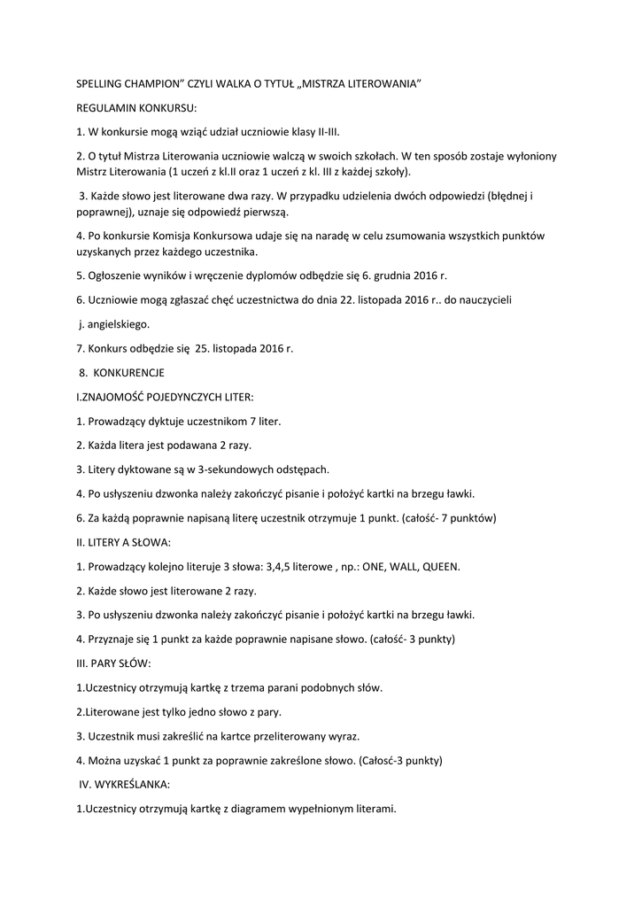 SPELLING CHAMPION” CZYLI WALKA O TYTUŁ „MISTRZA LITEROWANIA” REGULAMIN KONKURSU: 1. W konkursie mogą wziąć udział uczniowie klasy II-III. 2. O tytuł Mistrza Literowania uczniowie walczą w swoich szkołach. W ten sposób zostaje wyłoniony Mistrz Literowania (1 uczeń z kl.II oraz 1 uczeń z kl. III z każdej szkoły). 3. Każde słowo jest literowane dwa razy. W przypadku udzielenia dwóch odpowiedzi (błędnej i poprawnej), uznaje się odpowiedź pierwszą. 4. Po konkursie Komisja Konkursowa udaje się na naradę w celu zsumowania wszystkich punktów uzyskanych przez każdego uczestnika. 5. Ogłoszenie wyników i wręczenie dyplomów odbędzie się 6. grudnia 2016 r. 6. Uczniowie mogą zgłaszać chęć uczestnictwa do dnia 22. listopada 2016 r.. do nauczycieli j. angielskiego. 7. Konkurs odbędzie się 25. listopada 2016 r. 8. KONKURENCJE I.ZNAJOMOŚĆ POJEDYNCZYCH LITER: 1. Prowadzący dyktuje uczestnikom 7 liter. 2. Każda litera jest podawana 2 razy. 3. Litery dyktowane są w 3-sekundowych odstępach. 4. Po usłyszeniu dzwonka należy zakończyć pisanie i położyć kartki na brzegu ławki. 6. Za każdą poprawnie napisaną literę uczestnik otrzymuje 1 punkt. (całość- 7 punktów) II. LITERY A SŁOWA: 1. Prowadzący kolejno literuje 3 słowa: 3,4,5 literowe , np.: ONE, WALL, QUEEN. 2. Każde słowo jest literowane 2 razy. 3. Po usłyszeniu dzwonka należy zakończyć pisanie i położyć kartki na brzegu ławki. 4. Przyznaje się 1 punkt za każde poprawnie napisane słowo. (całość- 3 punkty) III. PARY SŁÓW: 1.Uczestnicy otrzymują kartkę z trzema parani podobnych słów. 2.Literowane jest tylko jedno słowo z pary. 3. Uczestnik musi zakreślić na kartce przeliterowany wyraz. 4. Można uzyskać 1 punkt za poprawnie zakreślone słowo. (Całosć-3 punkty) IV. WYKREŚLANKA: 1.Uczestnicy otrzymują kartkę z diagramem wypełnionym literami. 2. Prowadzący czyta w kolejności litery, które powinny zostać skreślone z diagramu. 3.Uczestnicy skreślają usłyszane litery, zostawiając te, które nie zostały wyczytane. Pozostałe litery dają hasło. 4. Uczestnicy zapisują powstałe hasło w odpowiednim miejscu na karcie pracy. Za poprawnie napisane słowo otrzymują 5 punktów.