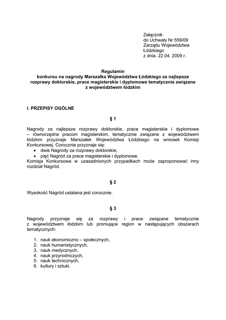Załącznik do Uchwały Nr 559/09 Zarządu Województwa Łódzkiego z dnia. 22.04. 2009 r. Regulamin konkursu na nagrody Marszałka Województwa Łódzkiego za najlepsze rozprawy doktorskie, prace magisterskie i dyplomowe tematycznie związane z województwem łódzkim I. PRZEPISY OGÓLNE §1 Nagrody za najlepsze rozprawy doktorskie, prace magisterskie i dyplomowe – równorzędne pracom magisterskim, tematycznie związane z województwem łódzkim przyznaje Marszałek Województwa Łódzkiego na wniosek Komisji Konkursowej. Corocznie przyznaje się: • dwie Nagrody za rozprawy doktorskie, • pięć Nagród za prace magisterskie i dyplomowe. Komisja Konkursowa w uzasadnionych przypadkach może zaproponować inny rozdział Nagród. §2 Wysokość Nagród ustalana jest corocznie. §3 Nagrody przyznaje się za rozprawy i prace związane tematycznie z województwem łódzkim lub promujące region w następujących obszarach tematycznych: 1. 2. 3. 4. 5. 6. nauk ekonomiczno – społecznych, nauk humanistycznych, nauk medycznych, nauk przyrodniczych, nauk technicznych, kultury i sztuki. §4 Przedmiotem oceny są rozprawy i prace obronione w roku kalendarzowym poprzedzającym przyznanie Nagrody. §5 Ogłoszenie o rozpoczęciu kolejnej edycji konkursu podaje się do wiadomości publicznej poprzez : • ogłoszenie zamieszczone w prasie codziennej o zasięgu wojewódzkim, • ogłoszenie na stronie internetowej Urzędu Marszałkowskiego • ogłoszenia zamieszczone w publicznych wyższych uczelniach na terenie miasta Łodzi, • w sposób zwyczajowo przyjęty w Urzędzie Marszałkowskim w Łodzi, Al. M. J. Piłsudskiego 8 oraz w Departamencie Kultury i Edukacji Urzędu Marszałkowskiego w Łodzi, ul. Traugutta 25, XV piętro. §6 1. Rozprawy i prace dotychczas nie nagradzane w innych konkursach zgłaszają uczelnie do dnia 30 czerwca danego roku – decyduje data wpływu. 2. Rozprawy i prace w jednym egzemplarzu wraz z wnioskiem zgłoszeniowym należy składać w Kancelarii Ogólnej Urzędu Marszałkowskiego w Łodzi, Al. M. J. Piłsudskiego 8, IV piętro, pokój 403. II. ZASADY PRACY I SKŁAD KOMISJI KONKURSOWEJ §7 Wnioski o przyznanie Nagród rozpatruje i do Nagrody typuje Komisja Konkursowa. §8 W skład komisji konkursowej wchodzą przedstawiciele następujących wyższych uczelni: 1. Uniwersytetu Łódzkiego, 2. Politechniki Łódzkiej, 3. Uniwersytetu Medycznego w Łodzi, 4. Państwowej Wyższej Szkoły Filmowej, Telewizyjnej i Teatralnej w Łodzi, 5 Akademii Muzycznej w Łodzi, 6. Akademii Sztuk Pięknych w Łodzi oraz 1. Marszałek Województwa Łódzkiego lub upoważniona przez niego osoba, 2. Przewodniczący Sejmiku Województwa Łódzkiego, 3. Przewodniczący Komisji Nauki, Kultury i Sportu Sejmiku Województwa Łódzkiego, 4. Dyrektor Departamentu Kultury i Edukacji Urzędu Marszałkowskiego, 5. Zastępca Dyrektora Departamentu Kultury i Edukacji Urzędu Marszałkowskiego §9 1. Komisję Konkursową powołuje, w drodze Zarządzenia, Marszałek Województwa Łódzkiego. 2. Legitymację do uczestnictwa w pracach Komisji stanowią imienne upoważnienia wydane przez organy desygnujące przedstawicieli. § 10 1. Posiedzenie Komisji Konkursowej zwołuje Marszałek Województwa Łódzkiego. 2.Członkowie Komisji Konkursowej wybierają Przewodniczącego, który kieruje pracami Komisji i powiadamia członków o terminach posiedzeń. Do czasu jego wyboru pracami Komisji kieruje osoba wskazana przez Marszałka Województwa Łódzkiego. 3. Obsługę administracyjną i kancelaryjną prac Komisji zapewnia Departament Kultury i Edukacji Urzędu Marszałkowskiego w Łodzi. § 11 Prace Komisji Konkursowej mogą być prowadzone, jeżeli w posiedzeniu bierze udział co najmniej 50 % składu Komisji. § 12 1. W sprawach nie rozstrzygniętych w niniejszym Regulaminie decyduje Komisja. 2. W kwestiach spornych Przewodniczący Komisji zarządza jawne głosowanie. W przypadku równej ilości głosów rozstrzyga głos Przewodniczącego. III. PRZEBIEG KONKURSU § 13 Procedura konkursu: 1. identyfikacja osób, które zgłoszono się do konkursu, 2. sprawdzenie spełniania przez rozprawy i prace wymogów formalnych, 3. dopuszczenie do konkursu rozpraw i prac spełniających wymogi formalne, 4. zapoznanie się z rozprawami i pracami zgłoszonymi do konkursu, 5. postępowanie oceniające rozprawy i prace, 6. głosowanie: a) głosowanie dla rozpraw doktorskich, b) głosowanie dla prac magisterskich i dyplomowych, c) członkowie Komisji dokonują wyboru poprzez postawienie znaku „X” przy maksymalnie tylu kandydatach, ile Nagród przewidzianych jest w danej kategorii, d) głos jest nieważny w razie postawienia większej liczby znaków „X” niż przewidziana liczba Nagród, oraz gdy przy żadnym z nazwisk kandydatów nie umieszczono znaku „X”, e) odbywa się zwykłą większością głosów. 7. ustalenie końcowego wyniku. III. ZAKOŃCZENIE PRAC KOMISJI § 14 Z prac Komisji Konkursowej sporządza się jeden protokół, który podpisują wszyscy członkowie Komisji biorący udział w jej obradach. § 15 Przewodniczący Komisji – po zakończeniu prac przez Komisję przekazuje protokół z określonym wynikiem konkursu Marszałkowi Województwa Łódzkiego. § 16 Termin wręczania Nagród ustala Marszałek Województwa. § 17 Prace nagrodzone w konkursie są przekazywane do Wojewódzkiej i Miejskiej Biblioteki Publicznej im. Marszałka J. Piłsudskiego w Łodzi zgodnie z uchwałą Nr 687/2001 Zarządu Województwa Łódzkiego z dnia 27 listopada 2001 roku.