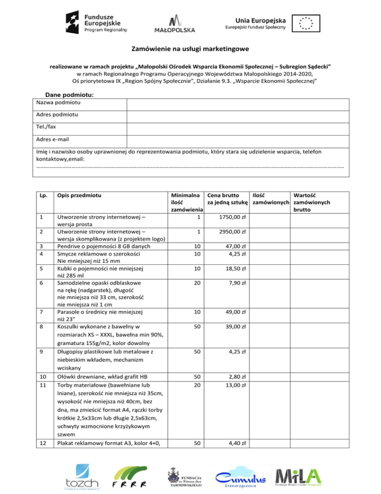 Zamówienie na usługi marketingowe realizowane w ramach projektu „Małopolski Ośrodek Wsparcia Ekonomii Społecznej – Subregion Sądecki” w ramach Regionalnego Programu Operacyjnego Województwa Małopolskiego 2014-2020, Oś priorytetowa IX „Region Spójny Społecznie”, Działanie 9.3. „Wsparcie Ekonomii Społecznej” Dane podmiotu: Nazwa podmiotu Adres podmiotu Tel./fax Adres e-mail Imię i nazwisko osoby uprawnionej do reprezentowania podmiotu, który stara się udzielenie wsparcia, telefon kontaktowy,email: ……………………………………………………………………………………………………………………………………………………………………………………….. Lp. Opis przedmiotu 1 Utworzenie strony internetowej – wersja prosta Utworzenie strony internetowej – wersja skomplikowana (z projektem logo) Pendrive o pojemności 8 GB danych Smycze reklamowe o szerokości Nie mniejszej niż 15 mm Kubki o pojemności nie mniejszej niż 285 ml Samodzielne opaski odblaskowe na rękę (nadgarstek), długość nie mniejsza niż 33 cm, szerokość nie mniejsza niż 1 cm Parasole o średnicy nie mniejszej niż 23” Koszulki wykonane z bawełny w rozmiarach XS – XXXL, bawełna min 90%, gramatura 155g/m2, kolor dowolny Długopisy plastikowe lub metalowe z niebieskim wkładem, mechanizm wciskany Ołówki drewniane, wkład grafit HB Torby materiałowe (bawełniane lub lniane), szerokość nie mniejsza niż 35cm, wysokość nie mniejsza niż 40cm, bez dna, ma zmieścić format A4, rączki torby krótkie 2,5x33cm lub długie 2,5x63cm, uchwyty wzmocnione krzyżykowym szwem Plakat reklamowy format A3, kolor 4+0, 2 3 4 5 6 7 8 9 10 11 12 Minimalna Cena brutto Ilość Wartość ilość za jedną sztukę zamówionych zamówionych zamówienia brutto 1 1750,00 zł 1 2950,00 zł 10 10 47,00 zł 4,25 zł 10 18,50 zł 20 7,90 zł 10 49,00 zł 50 39,00 zł 50 4,25 zł 50 20 2,80 zł 13,00 zł 50 4,40 zł 13 14 15 16 17 18 19 20 21 papier kreda mat/błysk lub papier offset + folia UV na całości, granulacja papieru 135 g; Ulotka reklamowa format A5 złamana do DL, kolor 4+4, papier kreda mat/błysk lub papier offset + folia UV na całości, gramatura papieru 135 g; Teczka kartonowa na dokumenty, format A4, zamykana na gumkę, papier 350 g, Wizytówka dwustronna o wymiarach 90x50 mm, kolor 4+0, papier kreda mat/błysk; Kalendarz format A4, jedno-stronnicowy, projekt graficzny wskazany przez Podmiot Ekonomii Społecznej, wydruk kolor 4+4, papier kreda mat/błysk lub papier offset + folia UV na całości, gramatura papieru 135 g; Kalendarz biurkowy format A5, 12 pełnokolorowych stron z dowolną grafiką lub zdjęciem, kalendarium 1 miesiąc na stronie dopasowane do zdjęć, druk 4+0 lub 4+4, spirala biała lakierowana, podstawka z zadrukiem lub bez, karton 270 g Notes format A5 – o ilości 80 kartek w kratkę lub czyste, papier 80 g; Baner reklamowy o wymiarach 200x100cm, laminowany, PCV, gramatura nie mniejsza niż 510g; Rollup jednostronny z nadrukiem 4+0 zgodnie z wytycznymi zamawiającego o wymiarach 100x200 cm Tabliczka informacyjna PES-projekt w formatach JPG, PNG, PSD, EPS, PDF, SVG oraz AI lub CDR, na podstawie tekstu, materiałów wyjściowych, wytycznych PES i wykonanie tabliczki PCV, format A3, kolor 4+0. 300 3,85 zł 100 4,50 zł 200 0,90 zł 100 5,80 zł 100 21,50 zł 20 12,85 zł 1 285,00 zł 1 450,00 zł 1 240,00 zł RAZEM ………………………….. miejscowość, data …………………………………………….... pieczęć podmiotu ………………….…….………..………………… pieczątka i podpis osoby/ób uprawnionej/ych do reprezentacji podmiotu, zgodnie z KRS