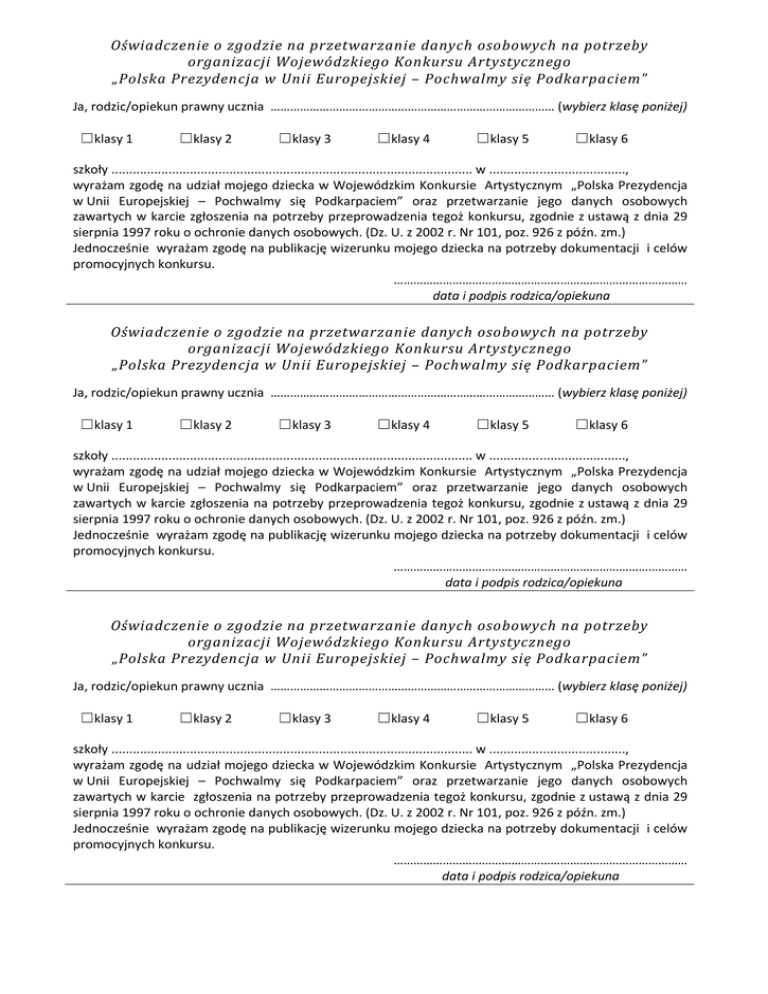 Oświadczenie o zgodzie na przetwarzanie danych osobowych na potrzeby organizacji Wojewódzkiego Konkursu Artystycznego „Polska Prezydencja w Unii Europejskiej – Pochwalmy się Podkarpaciem” Ja, rodzic/opiekun prawny ucznia …………………………………………………………………………… (wybierz klasę poniżej) ☐klasy 1 ☐klasy 2 ☐klasy 3 ☐klasy 4 ☐klasy 5 ☐klasy 6 szkoły ..................................................................................................... w ......................................, wyrażam zgodę na udział mojego dziecka w Wojewódzkim Konkursie Artystycznym „Polska Prezydencja w Unii Europejskiej – Pochwalmy się Podkarpaciem” oraz przetwarzanie jego danych osobowych zawartych w karcie zgłoszenia na potrzeby przeprowadzenia tegoż konkursu, zgodnie z ustawą z dnia 29 sierpnia 1997 roku o ochronie danych osobowych. (Dz. U. z 2002 r. Nr 101, poz. 926 z późn. zm.) Jednocześnie wyrażam zgodę na publikację wizerunku mojego dziecka na potrzeby dokumentacji i celów promocyjnych konkursu. ……………………………………………………………………………… data i podpis rodzica/opiekuna Oświadczenie o zgodzie na przetwarzanie danych osobowych na potrzeby organizacji Wojewódzkiego Konkursu Artystycznego „Polska Prezydencja w Unii Europejskiej – Pochwalmy się Podkarpaciem” Ja, rodzic/opiekun prawny ucznia …………………………………………………………………………… (wybierz klasę poniżej) ☐klasy 1 ☐klasy 2 ☐klasy 3 ☐klasy 4 ☐klasy 5 ☐klasy 6 szkoły ..................................................................................................... w ......................................, wyrażam zgodę na udział mojego dziecka w Wojewódzkim Konkursie Artystycznym „Polska Prezydencja w Unii Europejskiej – Pochwalmy się Podkarpaciem” oraz przetwarzanie jego danych osobowych zawartych w karcie zgłoszenia na potrzeby przeprowadzenia tegoż konkursu, zgodnie z ustawą z dnia 29 sierpnia 1997 roku o ochronie danych osobowych. (Dz. U. z 2002 r. Nr 101, poz. 926 z późn. zm.) Jednocześnie wyrażam zgodę na publikację wizerunku mojego dziecka na potrzeby dokumentacji i celów promocyjnych konkursu. ……………………………………………………………………………… data i podpis rodzica/opiekuna Oświadczenie o zgodzie na przetwarzanie danych osobowych na potrzeby organizacji Wojewódzkiego Konkursu Artystycznego „Polska Prezydencja w Unii Europejskiej – Pochwalmy się Podkarpaciem” Ja, rodzic/opiekun prawny ucznia …………………………………………………………………………… (wybierz klasę poniżej) ☐klasy 1 ☐klasy 2 ☐klasy 3 ☐klasy 4 ☐klasy 5 ☐klasy 6 szkoły ..................................................................................................... w ......................................, wyrażam zgodę na udział mojego dziecka w Wojewódzkim Konkursie Artystycznym „Polska Prezydencja w Unii Europejskiej – Pochwalmy się Podkarpaciem” oraz przetwarzanie jego danych osobowych zawartych w karcie zgłoszenia na potrzeby przeprowadzenia tegoż konkursu, zgodnie z ustawą z dnia 29 sierpnia 1997 roku o ochronie danych osobowych. (Dz. U. z 2002 r. Nr 101, poz. 926 z późn. zm.) Jednocześnie wyrażam zgodę na publikację wizerunku mojego dziecka na potrzeby dokumentacji i celów promocyjnych konkursu. ……………………………………………………………………………… data i podpis rodzica/opiekuna