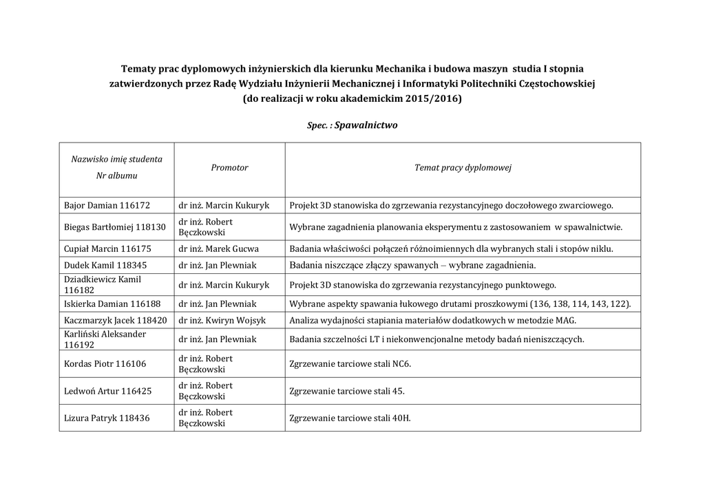 Tematy prac dyplomowych inżynierskich dla kierunku Mechanika i budowa maszyn studia I stopnia zatwierdzonych przez Radę Wydziału Inżynierii Mechanicznej i Informatyki Politechniki Częstochowskiej (do realizacji w roku akademickim 2015/2016) Spec. : Spawalnictwo Nazwisko imię studenta Nr albumu Promotor Temat pracy dyplomowej Bajor Damian 116172 dr inż. Marcin Kukuryk Projekt 3D stanowiska do zgrzewania rezystancyjnego doczołowego zwarciowego. Biegas Bartłomiej 118130 dr inż. Robert Bęczkowski Wybrane zagadnienia planowania eksperymentu z zastosowaniem w spawalnictwie. Cupiał Marcin 116175 dr inż. Marek Gucwa Badania właściwości połączeń różnoimiennych dla wybranych stali i stopów niklu. Dudek Kamil 118345 dr inż. Jan Plewniak Badania niszczące złączy spawanych – wybrane zagadnienia. dr inż. Marcin Kukuryk Projekt 3D stanowiska do zgrzewania rezystancyjnego punktowego. dr inż. Jan Plewniak Wybrane aspekty spawania łukowego drutami proszkowymi (136, 138, 114, 143, 122). dr inż. Kwiryn Wojsyk Analiza wydajności stapiania materiałów dodatkowych w metodzie MAG. dr inż. Jan Plewniak Badania szczelności LT i niekonwencjonalne metody badań nieniszczących. Kordas Piotr 116106 dr inż. Robert Bęczkowski Zgrzewanie tarciowe stali NC6. Ledwoń Artur 116425 dr inż. Robert Bęczkowski Zgrzewanie tarciowe stali 45. Lizura Patryk 118436 dr inż. Robert Bęczkowski Zgrzewanie tarciowe stali 40H. Dziadkiewicz Kamil 116182 Iskierka Damian 116188 Kaczmarzyk Jacek 118420 Karliński Aleksander 116192 Macherzyński Michał 116206 Mierzejewski Łukasz 118414 dr inż. Kwiryn Wojsyk Charakterystyka spoin pachwinowych wykonywanych w różnych pozycjach metodą 135. dr inż. Kwiryn Wojsyk Technologia niskoodkształceniowego spawania wybranych naczep samochodowych. Murawski Adam 118087 dr inż. Robert Bęczkowski Analiza spawania drutem proszkowym z rdzeniem metalicznym. Nabiałek Mateusz 116211 dr inż. Robert Bęczkowski Wykorzystanie spawania laserowego. Psuj Patryk 116216 dr inż. Marek Gucwa Analiza właściwości połączeń ze stali nierdzewnych wykonanych metodami niskoenergetycznymi. Skrobarczyk Łukasz 116222 dr inż. Robert Bęczkowski Wymagania norm serii PN EN 1090 stawiane procesom cięcia termicznego w ujęciu praktycznym. Wróbel Piotr 111833 dr inż. Marek Gucwa Charakterystyka złączy ze stali walcowanych termomechanicznie. Zyzik Dariusz 116239 dr inż. Marek Gucwa Analiza właściwości warstw napawanych przetapianych metodą TIG.