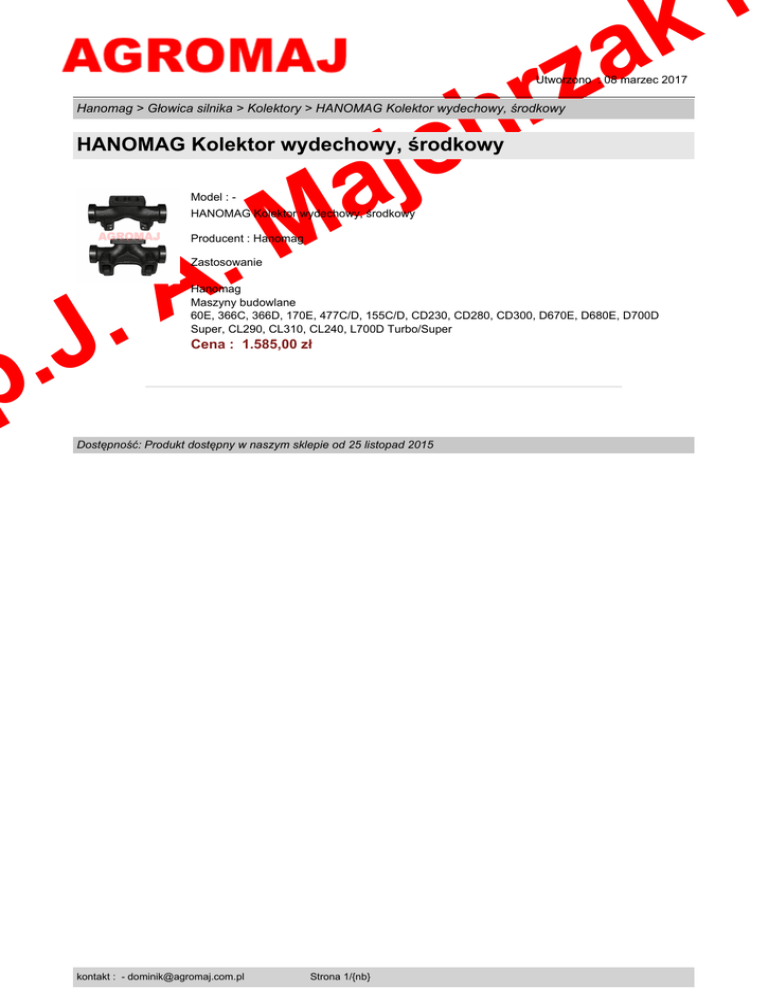 i k a z r h Utworzono : 08 marzec 2017 c j a Hanomag > Głowica silnika > Kolektory > HANOMAG Kolektor wydechowy, środkowy HANOMAG Kolektor wydechowy, środkowy M . Model : - HANOMAG Kolektor wydechowy, środkowy Producent : Hanomag A . Zastosowanie J . p Hanomag Maszyny budowlane 60E, 366C, 366D, 170E, 477C/D, 155C/D, CD230, CD280, CD300, D670E, D680E, D700D Super, CL290, CL310, CL240, L700D Turbo/Super Cena : 1.585,00 zł Dostępność: Produkt dostępny w naszym sklepie od 25 listopad 2015 kontakt : - [email protected] Strona 1/{nb}
