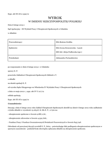 Sygn. akt III AUa 1339/12 WYROK W IMIENIU RZECZYPOSPOLITEJ POLSKIEJ Dnia 6 lutego 2013 r. Sąd Apelacyjny - III Wydział Pracy i Ubezpieczeń Społecznych w Gdańsku w składzie: Przewodniczący: SSA Bożena Grubba Sędziowie: SSA Iwona Krzeczowska - Lasoń SSO del. Alicja Podlewska (spr.) Protokolant: Aleksandra Portaszkiewicz po rozpoznaniu w dniu 6 lutego 2013 r. w Gdańsku sprawy E. P. przeciwko Zakładowi Ubezpieczeń Społecznych Oddział w T. o składki na skutek apelacji E. P. od wyroku Sądu Okręgowego we Włocławku IV Wydziału Pracy i Ubezpieczeń Społecznych z dnia 10 maja 2012 r., sygn. akt IV U 217/12 oddala apelację. Sygn. akt III AUa 1339/12 Uzasadnienie: Decyzją z dnia 6 lutego 2012 roku Zakład Ubezpieczeń Społecznych określił na dzień 6 lutego 2012 roku zadłużenie z tytułu składek w wysokości 15.265,67 zł. dla E. P., w tym na: - ubezpieczenie społeczne w kwocie 9.887,17zł., - ubezpieczenie zdrowotne w kwocie 4.532,76zł., - Fundusz Pracy i Fundusz Gwarantowanych Świadczeń Pracowniczych w kwocie 845,74zł. Odwołanie od powyższej decyzji wywiódł E. P., który - potwierdzając fakt podlegania ubezpieczeniom społecznym w spornym czasookresie - podniósł brak obowiązku opłacania składek na ubezpieczenie społeczne. W odpowiedzi na odwołanie Zakład Ubezpieczeń Społecznych podtrzymał całkowicie zaskarżoną decyzję i wniósł o oddalenie odwołania. Sąd Okręgowy we Włocławku – Wydział IV Pracy i Ubezpieczeń Społecznych wyrokiem z dnia 10 maja 2012 r. , sygn.. akt IV U 217/12, oddalił odwołanie ubezpieczonego. Sąd Okręgowy orzekał w oparciu o następujące ustalenia faktyczne i rozważania prawne. Decyzją Zakładu Ubezpieczeń Społecznych z dnia 17 listopada 2009 roku stwierdzono, że E. P. podlegał obowiązkowo, z tytułu prowadzenia pozarolniczej działalności gospodarczej, ubezpieczeniom społecznym, tj. emerytalnemu, rentowemu , wypadkowemu w okresach: od 7 maja 2007 roku do 22 czerwca 2007 roku, od 4 lipca 2007 roku do 27 września 2007 roku, od 4 października 2007 roku do 3 grudnia 2007 roku, od 7 kwietnia 2008 roku do 27 czerwca 2008 roku, od 6 lipca 2008 roku do 30 września 2008 roku, od 1 listopada 2008 roku do 31 grudnia 2008 roku, od 10 kwietnia 2009 roku do 29 czerwca 2009 roku, od 6 lipca 2009 roku do 29 września 2009 roku. Odwołanie wywiedzione przez E. P. od powyższej decyzji zostało oddalone wyrokiem Sądu Okręgowego we Włocławku z dnia 9 lipca 2010 roku. Prezentując okoliczności faktyczne, jakie legły u podstaw wydania wyroku Sąd rozpoznający sprawę wskazał, że wnioskodawca od dnia 3 czerwca 1993 roku rozpoczął prowadzenie działalności rolniczej w gospodarstwie rolnym o pow. 3,15 ha fizycznych (4,82 ha przeliczeniowych). W dniu 14 kwietnia 2005 roku E. P. rozpoczął prowadzenie pozarolniczej działalności gospodarczej pod nazwą Zakład (...) w zakresie cięcia, formowania i wykonywania kamienia ozdobnego i kamienia dla budownictwa oraz produkcji pozostałych wyrobów betonowych, cementowych i gipsowych (wpis do ewidencji działalności gospodarczej prowadzonej przez Wójta Gminy O. pod nr (...)). Od tego czasu E. P. zgłosił w Urzędzie Skarbowym w R. obowiązek podatkowy w zryczałtowanym podatku od przychodów ewidencjonowanych. Aktem notarialnym z dnia 14 kwietnia 2006 roku (Rep. (...)) E. P.przekazał swoje gospodarstwo rolne synowi celem nabycia renty strukturalnej. Od dnia 1 lipca 2006 roku ustało ubezpieczenie społeczne rolników E. P.. Od dnia 14 kwietnia 2006 roku E. P. ma przyznane prawo do renty strukturalnej. W okresach od 10 listopada 2006 roku do 6 maja 2007 roku, od 23 czerwca 2007 roku do 3 lipca 2007 roku, od 28 września 2007 roku do 3 października 2007 roku, od 4 grudnia 2007 roku do 6 kwietnia 2008 roku, od 28 czerwca 2008 roku do 5 lipca 2008 roku, od 26 września 2008 roku do 5 października 2008 roku, od 18 grudnia 2008 roku 3 marca 2009 roku, od 1 kwietnia 2009 roku do 9 kwietnia 2009 roku, od 30 czerwca 2009 roku do 5 lipca 2009 roku, od 30 września 2009 roku do 30 kwietnia 2010 roku E. P. dokonał zawieszenia w prowadzeniu pozarolniczej działalności. W okresach zawieszenia wykonywania działalności gospodarczej E. P. podlegał ubezpieczeniu społecznemu rolników. Poczynione ustalenia i rozważania Sądu Okręgowego zostały w pełni zaaprobowane przez Sąd Apelacyjny w Gdańsku, co skutkowało oddaleniem apelacji E. P. wyrokiem z dnia 22 marca 2011 roku. Dysponując prawomocnym wyrokiem Sądu Okręgowego organ rentowy z uwagi na brak reakcji płatnika sporządził z urzędu dokumentację rozliczeniową i po ustaleniu wysokości zaległości w dniu 6 lutego 2012 roku wydał decyzję, na mocy, której określił dla E. P. zadłużenie z tytułu składek w łącznej wysokości 15.265,67zł, w tym na: ubezpieczenie społeczne, ubezpieczenie zdrowotne, Fundusz Pracy i Fundusz Gwarantowanych Świadczeń Pracowniczych. Sąd Okręgowy wskazał, że powyżej ustalony stan faktyczny ustalił w oparciu o dokumenty zgromadzone w aktach organu rentowego. Okoliczności zaś dotyczące prowadzonej przez wnioskodawcę działalności i czasookresów podlegania z tego tytułu ubezpieczeniom społecznym zostały poczynione na podstawie dokumentów zgromadzonych w aktach sprawy IVU 16/10. Na podstawie takich dokumentów jak: odwołanie, wyrok, jego uzasadnienie i apelacja Sąd meriti był w stanie ustalić, z jakiego tytułu wnioskodawca podlegał ubezpieczeniu społecznemu i w jakich ramach czasowych prowadził ową działalność rodzącą obowiązek ubezpieczeniowy. Co więcej, ustalony stan faktyczny był co do zasady bezsporny, strony jednakże z tak ustalonego stanu sprawy wywodziły odmienne skutki prawne. W ocenie E. P. podlega on ubezpieczeniu społecznemu, jednakże nie ma on obowiązku płacenia z tego tytułu składek na ubezpieczenie społeczne. Organ rentowy z kolei podniósł, że konsekwencją objęcia wnioskodawcy ubezpieczeniem społecznym jest zobowi