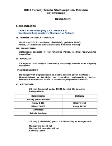 XXII Turniej Tenisa Stołowego im. Mariana Gajewskiego REGULAMIN I. ORGANIZATOR TKKF TYTAN Police przy Z.Ch. POLICE S.A. Uczniowski klub sportowy Champion w Policach II. TERMIN I MIEJSCE TURNIEJU 26-27 maj 2012 r. (sobota, niedziela); godzina 10.00; Police, ul. Siedlecka (Hala Sportowa Chemika Police) III. ZGŁOSZENIA Zgłoszenia osobiste w Hali Chemika Police, w dniu rozgrywania zawodów. IV. NAGRODY Za zajęcie I-III miejsca zawodnicy otrzymają medale oraz nagrody rzeczowe. V.UCZESTNICTWO Do rozgrywek dopuszczone są osoby zdrowe (brak kontuzji); Uczestnictwo w turnieju ma charakter dobrowolny, kaŜdy biorący w nim udział czyni to na własną odpowiedzialność; VI. KATEGORIE 26 maj (sobota) godz. 10.00 turniej dla dzieci w kategoriach: Dziewczęta Chłopcy Szkoły podstawowe Klasy I-III Klasy I-III Klasy IV-VI Klasy IV-VI Gimnazja Szkoły średnie 27 maj ( niedziela) godz. 10.00 turniej w kategoriach: MęŜczyźni do 40 lat MęŜczyźni powyŜej 40 lat Kobiety Open VII. PRZEPISY GRY W czasie rozgrywek obowiązują przepisy gry w tenisa stołowego PZTS z niŜej wymienionymi wyjątkami: VIII.SYSTEM ROZGRYWEK System rozgrywek w poszczególnych kategoriach: I tura – w grupach kaŜdy z kaŜdym do dwóch wygranych setów II tura – system pucharowy do dwóch przegranych meczy ( mecze w systemie pucharowym rozgrywane będą do trzech wygranych setów ) Turniej rozgrywany będzie na stołach Tibhar i Tornado; UWAGA: Organizator zastrzega sobie moŜliwość zamiany systemu rozgrywek ze względów organizacyjnych. IX. DYSKWALIFIKACJE I WYKLUCZENIA Zawody zostaną zweryfikowane jako przegrana bez gry (walkower) w przypadku gdy: Zawodnik z własnej winy nie stawił się do rozgrywek lub spóźni się więcej niŜ 5 minut; Zawodnik wzbrania się grać pod kierunkiem wyznaczonego sędziego; Zawodnik odchodzi od stołu przed zakończeniem spotkania – w tym przypadku przeciwnikowi dopisuje się punkty potrzebne do wygrania seta; X. PROTESTY I ODWOŁANIA Wszystkie protesty i odwołania powinny być składane pisemnie, opatrzone szczegółowym opisem i czytelnym podpisem osoby składającej protest. Procedura ta powinna nastąpić bezpośrednio po zakończeniu spotkania po uprzednim poinformowaniu arbitra o zamiarze wniesienia uwag do protokołu spotkania. XI. UWAGI KOŃCOWE 1. Wymagane jest obuwie na zmianę oraz strój sportowy ( spodenki i koszulka). 2. Zawodnicy biorący udział w turnieju obowiązani są do przestrzegania postanowień regulaminu i przepisów gry; 3. Zawodnicy ponoszą pełną odpowiedzialność materialną za szkody wyrządzone przez siebie; 4. Zawodnicy biorący udział w turnieju grają na własną odpowiedzialność; 5. Odbiór i przyjęcie zasad regulaminu potwierdzony jest zgłoszeniem się do turnieju 6. Organizator nie ponosi odpowiedzialności prawnej za szkody powstałe w wyniku utraty mienia w trakcie trwania rozgrywek; 7. Nad poprawnością przebiegu turnieju czuwa Organizator z ramienia TKKF TYTAN i UKS Champion XII. POZSTAŁE POSTANOWIENIA 1. Prawo do interpretacji regulaminu turnieju zastrzega sobie Organizator; 2. W kwestiach nie objętych regulaminem ostateczną decyzję podejmuje Organizator; Informacje moŜna uzyskać pod numerem tel. 505 063 587. ZAPRASZMY SERDECZNIE