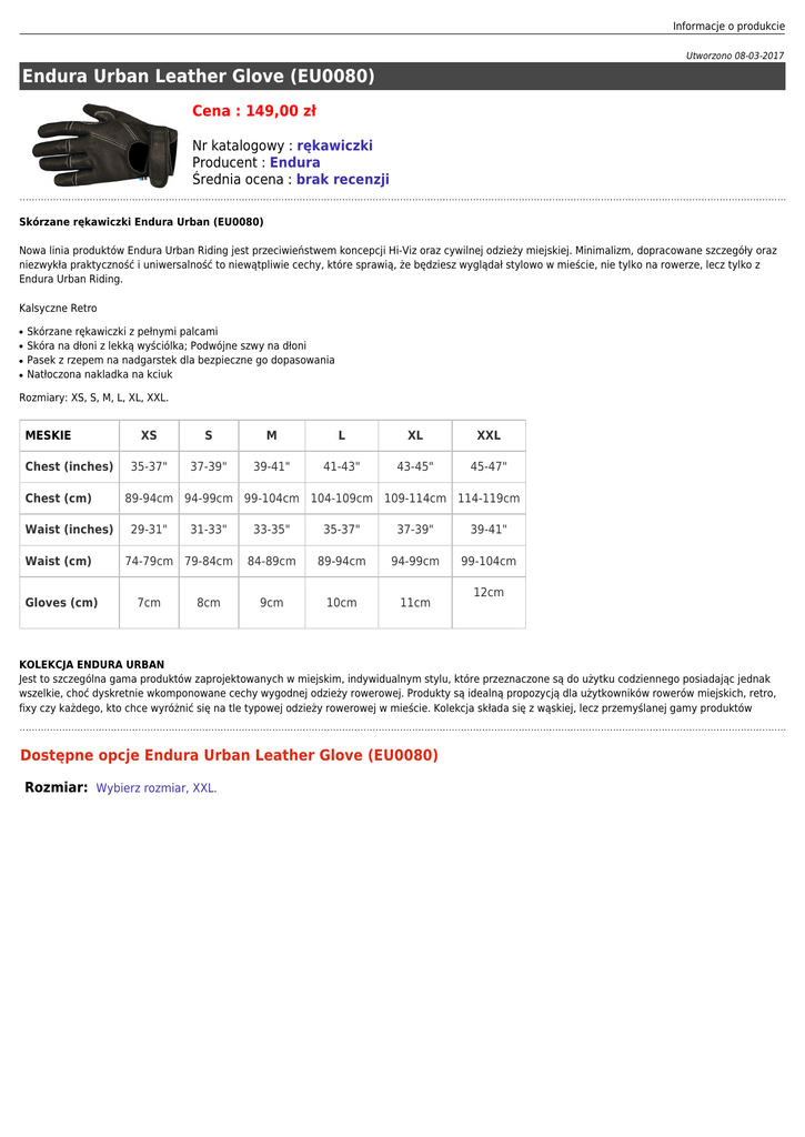 Informacje o produkcie Utworzono 08-03-2017 Endura Urban Leather Glove (EU0080) Cena : 149,00 zł Nr katalogowy : rękawiczki Producent : Endura Średnia ocena : brak recenzji Skórzane rękawiczki Endura Urban (EU0080) Nowa linia produktów Endura Urban Riding jest przeciwieństwem koncepcji Hi-Viz oraz cywilnej odzieży miejskiej. Minimalizm, dopracowane szczegóły oraz niezwykła praktyczność i uniwersalność to niewątpliwie cechy, które sprawią, że będziesz wyglądał stylowo w mieście, nie tylko na rowerze, lecz tylko z Endura Urban Riding. Kalsyczne Retro ● ● ● ● Skórzane rękawiczki z pełnymi palcami Skóra na dłoni z lekką wyściólka; Podwójne szwy na dłoni Pasek z rzepem na nadgarstek dla bezpieczne go dopasowania Natłoczona nakladka na kciuk Rozmiary: XS, S, M, L, XL, XXL. MESKIE Chest (inches) Chest (cm) Waist (inches) Waist (cm) Gloves (cm) XS S M L XL XXL 35-37" 37-39" 39-41" 41-43" 43-45" 45-47" 89-94cm 94-99cm 99-104cm 104-109cm 109-114cm 114-119cm 29-31" 31-33" 74-79cm 79-84cm 7cm 8cm 33-35" 35-37" 37-39" 39-41" 84-89cm 89-94cm 94-99cm 99-104cm 9cm 10cm 11cm 12cm KOLEKCJA ENDURA URBAN Jest to szczególna gama produktów zaprojektowanych w miejskim, indywidualnym stylu, które przeznaczone są do użytku codziennego posiadając jednak wszelkie, choć dyskretnie wkomponowane cechy wygodnej odzieży rowerowej. Produkty są idealną propozycją dla użytkowników rowerów miejskich, retro, fixy czy każdego, kto chce wyróżnić się na tle typowej odzieży rowerowej w mieście. Kolekcja składa się z wąskiej, lecz przemyślanej gamy produktów Dostępne opcje Endura Urban Leather Glove (EU0080) Rozmiar: Wybierz rozmiar, XXL.