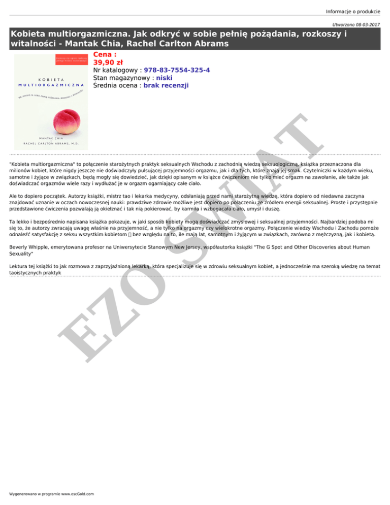 Informacje o produkcie Utworzono 08-03-2017 Kobieta multiorgazmiczna. Jak odkryć w sobie pełnię pożądania, rozkoszy i witalności - Mantak Chia, Rachel Carlton Abrams Cena : 39,90 zł IA T Nr katalogowy : 978-83-7554-325-4 Stan magazynowy : niski Średnia ocena : brak recenzji "Kobieta multiorgazmiczna" to połączenie starożytnych praktyk seksualnych Wschodu z zachodnią wiedzą seksuologiczną, książka przeznaczona dla milionów kobiet, które nigdy jeszcze nie doświadczyły pulsującej przyjemności orgazmu, jak i dla tych, które znają jej smak. Czytelniczki w każdym wieku, samotne i żyjące w związkach, będą mogły się dowiedzieć, jak dzięki opisanym w książce ćwiczeniom nie tylko mieć orgazm na zawołanie, ale także jak doświadczać orgazmów wiele razy i wydłużać je w orgazm ogarniający całe ciało. ŚW Ale to dopiero początek. Autorzy książki, mistrz tao i lekarka medycyny, odsłaniają przed nami starożytną wiedzę, która dopiero od niedawna zaczyna znajdować uznanie w oczach nowoczesnej nauki: prawdziwe zdrowie możliwe jest dopiero po połączeniu ze źródłem energii seksualnej. Proste i przystępnie przedstawione ćwiczenia pozwalają ją okiełznać i tak nią pokierować, by karmiła i wzbogacała ciało, umysł i duszę. Ta lekko i bezpośrednio napisana książka pokazuje, w jaki sposób kobiety mogą doświadczać zmysłowej i seksualnej przyjemności. Najbardziej podoba mi się to, że autorzy zwracają uwagę właśnie na przyjemność, a nie tylko na orgazmy czy wielokrotne orgazmy. Połączenie wiedzy Wschodu i Zachodu pomoże odnaleźć satysfakcję z seksu wszystkim kobietom bez względu na to, ile mają lat, samotnym i żyjącym w związkach, zarówno z mężczyzną, jak i kobietą. Beverly Whipple, emerytowana profesor na Uniwersytecie Stanowym New Jersey, współautorka książki "The G Spot and Other Discoveries about Human Sexuality" EZ O Lektura tej książki to jak rozmowa z zaprzyjaźnioną lekarką, która specjalizuje się w zdrowiu seksualnym kobiet, a jednocześnie ma szeroką wiedzę na temat taoistycznych praktyk Wygenerowano w programie www.oscGold.com