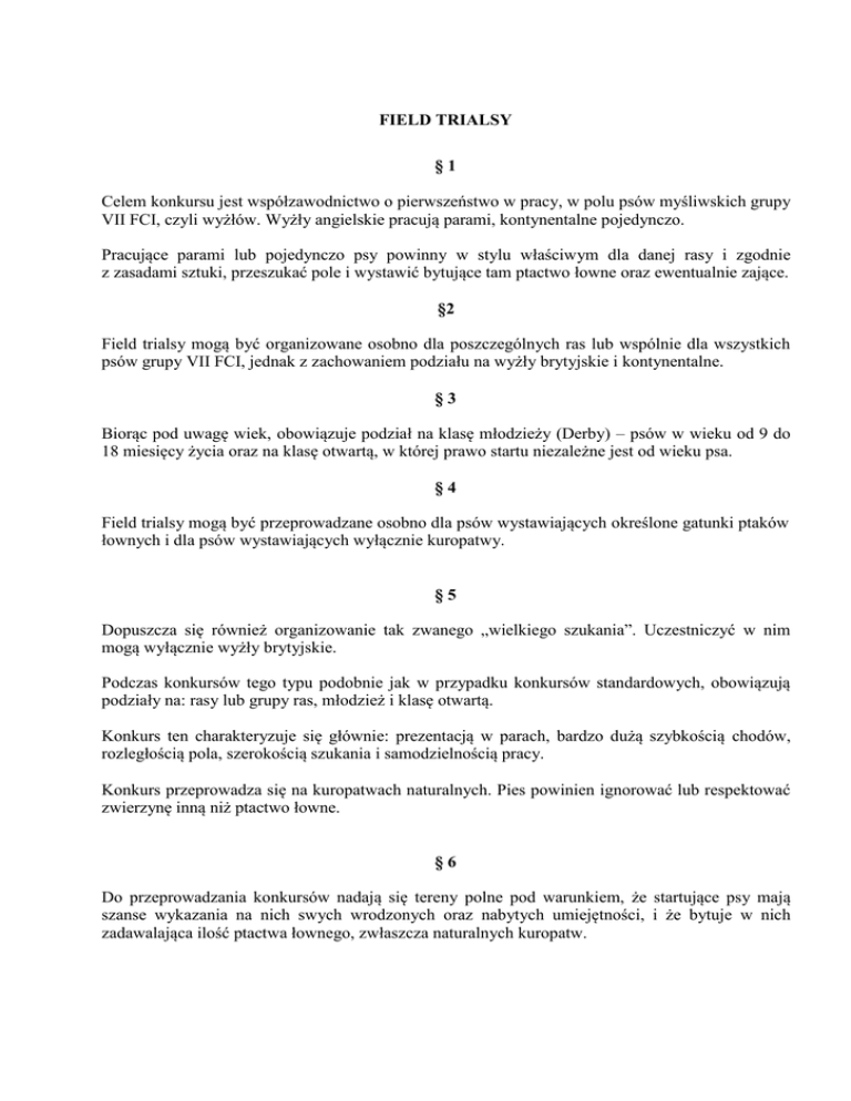 FIELD TRIALSY §1 Celem konkursu jest współzawodnictwo o pierwszeństwo w pracy, w polu psów myśliwskich grupy VII FCI, czyli wyżłów. Wyżły angielskie pracują parami, kontynentalne pojedynczo. Pracujące parami lub pojedynczo psy powinny w stylu właściwym dla danej rasy i zgodnie z zasadami sztuki, przeszukać pole i wystawić bytujące tam ptactwo łowne oraz ewentualnie zające. §2 Field trialsy mogą być organizowane osobno dla poszczególnych ras lub wspólnie dla wszystkich psów grupy VII FCI, jednak z zachowaniem podziału na wyżły brytyjskie i kontynentalne. §3 Biorąc pod uwagę wiek, obowiązuje podział na klasę młodzieży (Derby) – psów w wieku od 9 do 18 miesięcy życia oraz na klasę otwartą, w której prawo startu niezależne jest od wieku psa. §4 Field trialsy mogą być przeprowadzane osobno dla psów wystawiających określone gatunki ptaków łownych i dla psów wystawiających wyłącznie kuropatwy. §5 Dopuszcza się również organizowanie tak zwanego „wielkiego szukania”. Uczestniczyć w nim mogą wyłącznie wyżły brytyjskie. Podczas konkursów tego typu podobnie jak w przypadku konkursów standardowych, obowiązują podziały na: rasy lub grupy ras, młodzież i klasę otwartą. Konkurs ten charakteryzuje się głównie: prezentacją w parach, bardzo dużą szybkością chodów, rozległością pola, szerokością szukania i samodzielnością pracy. Konkurs przeprowadza się na kuropatwach naturalnych. Pies powinien ignorować lub respektować zwierzynę inną niż ptactwo łowne. §6 Do przeprowadzania konkursów nadają się tereny polne pod warunkiem, że startujące psy mają szanse wykazania na nich swych wrodzonych oraz nabytych umiejętności, i że bytuje w nich zadawalająca ilość ptactwa łownego, zwłaszcza naturalnych kuropatw. §7 Dopuszcza się określenie przez organizatora limitu uczestniczących w konkursach psów, pod warunkiem, że ograniczenia te zostaną wcześniej ogłoszone i nie będą dotyczyć ani płci, ani wieku psów. Po zamknięciu przez organizatora listy uczestników konkursów i po jej ogłoszeniu nie można dopisywać już żadnych psów. §8 Field trialsy odbywają się niezależnie od pogody i tylko w wyjątkowych przypadkach mogą być odwołane decyzją zespołu sędziowskiego. Praca psów powinna się odbywać w miarę możliwości organizacyjnych z zachowaniem podobnych warunków terenowych i kierunku wiejącego wiatru. Zasadą jest praca pod wiatr. §9 Godzina i miejsce zbiórki powinny być podane uczestnikom odpowiednio wcześnie. Przewodnicy psów winni być obecni na zbiórce. Po ogłoszeniu listy startowej, przewodnicy i psy pozostają do dyspozycji komisji sędziowskiej i muszą stosować się do ich wskazówek. § 10 Formowanie par i wyznaczanie kolejności ich pracy ustala się w drodze losowania, unikając łączenia psów należących do tego samego właściciela lub prowadzonych przez tego samego przewodnika. § 11 Psy biorące udział w konkursach, mogą być podzielone na kilka grup. Podział ten leży w gestii organizatorów. § 12 Po zakończeniu pierwszych tur, formowanie następnych par i kolejność ich pracy odbywa się według uznania sędziów, którzy powinni uwzględniać zasady, żeby nie łączyć ze sobą psów najlepszych lub posiadających równe szanse. § 13 Pracę psów oceniają 2 - 3 osobowe zespoły sędziowskie, których decyzje są ostateczne. Zgodnie z wytycznymi międzynarodowych regulaminów FCI, dopuszcza się możliwość jednoosobowego sędziowania wyżłów kontynentalnych. Pracę psów podczas tzw. „wielkiego - szukania” oceniają 3 osobowe zespoły sędziowskie. W przypadku sędziowania na konkursie kilku grup wyżłów jeden z sędziów danego zespołu pełni rolę jej przewodniczącego. Przewodniczącego mianuje sędzia główny imprezy. 3 Zadaniem sędziów jest wyłonienie psa, który w tym dniu wykazuje najwięcej zalet w pracy w polu. § 14 Osoby sędziujące dany konkurs nie mogą zgłosić do uczestnictwa w nim swojego psa. Sędzia nie może też oceniać psa, którego w ostatnich 6 miesiącach był właścicielem lub współwłaścicielem czy układał go lub szkolił. § 15 Sędzia, przewodniczący zespołu, w momencie rozpoczęcia konkursu powinien znajdować się pośrodku pola, a pozostali sędziowie po jego bokach w odpowiedniej od niego odległości. O każdym błędzie dyskwalifikującym psa, sędziowie boczni zobowiązani są powiadomić sędziego przewodniczącego, który rozważy zasadność przerwania pracy. Po zakończeniu pracy każdej pary lub pojedynczego psa, sędziowie boczni spotykają się z sędzią przewodniczącym. Każdy z nich podaje swoje uwagi i spostrzeżenia o pracujących psach. W przypadku różnych opinii, decyduje głos sędziego przewodniczącego. § 16 Obserwując i oceniając całokształt pracy, sędziowie przyznają wyróżniającym się psom dyplomy I, II i III stopnia. W konkursach międzynarodowych odpowiednikami przyznawanych dyplomów są stosowane w regulaminach międzynarodowych FCI oceny: doskonały - eccelente, bardzo dobry - molto buono i dobry – buono, które należy wpisać do dyplomów i kart ocen obok wcześniej wpisanych wysokości dyplomów, w myśl zasady: dyplom Iº - eccelente, dyplom IIº - molto buono, dyplom IIIº - buono. Najlepszemu psu klasy otwartej, który zdobył dyplom Iº, przysługuje tytuł „Trialera” oraz sędziowie mogą mu przyznać wniosek CPC. Jeżeli są to konkursy międzynarodowe lub krajowe to dodatkowym wymogiem przyznania CPC jest obecność w danej klasie co najmniej 6 psów, a w przypadku konkursów regionalnych uczestnictwo minimum 10 psów. Jeżeli ze względu na dużą ilość zgłoszonych psów, zostały one podzielone na grupy to sędziowie mogą przyznać CPC każdemu zwycięzcy grupy (niezależnie od ilości grup) pod warunkiem, że zdobył on dyplom Iº, a grupa liczyła co najmniej: w przypadku konkursów krajowych i międzynarodowych 6 p