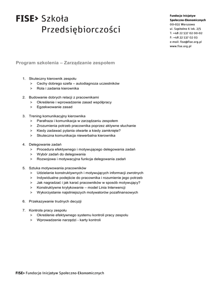 Program szkolenia – Zarządzanie zespołem 1. Skuteczny kierownik zespołu > Cechy dobrego szefa – autodiagnoza uczestników > Rola i zadania kierownika 2. Budowanie dobrych relacji z pracownikami > Określenie i wprowadzenie zasad współpracy > Egzekwowanie zasad 3. Trening komunikacyjny kierownika > Parafraza i komunikacja w zarządzaniu zespołem > Zrozumienia potrzeb pracownika poprzez aktywne słuchanie > Kiedy zadawać pytania otwarte a kiedy zamknięte? > Skuteczna komunikacja niewerbalna kierownika 4. Delegowanie zadań > Procedura efektywnego i motywującego delegowania zadań > Wybór zadań do delegowania > Rozwojowa i motywacyjna funkcja delegowania zadań 5. Sztuka motywowania pracowników > Udzielanie konstruktywnych i motywujących informacji zwrotnych > Indywidualne podejście do pracownika i rozumienie jego potrzeb > Jak nagradzać i jak karać pracowników w sposób motywujący? > Konstruktywne krytykowanie – model Linia Interwencji > Wykorzystanie najsilniejszych motywatorów pozafinansowych 6. Przekazywanie trudnych decyzji 7. Kontrola pracy zespołu > Określenie efektywnego systemu kontroli pracy zespołu > Wprowadzenie narzędzi - karty kontroli