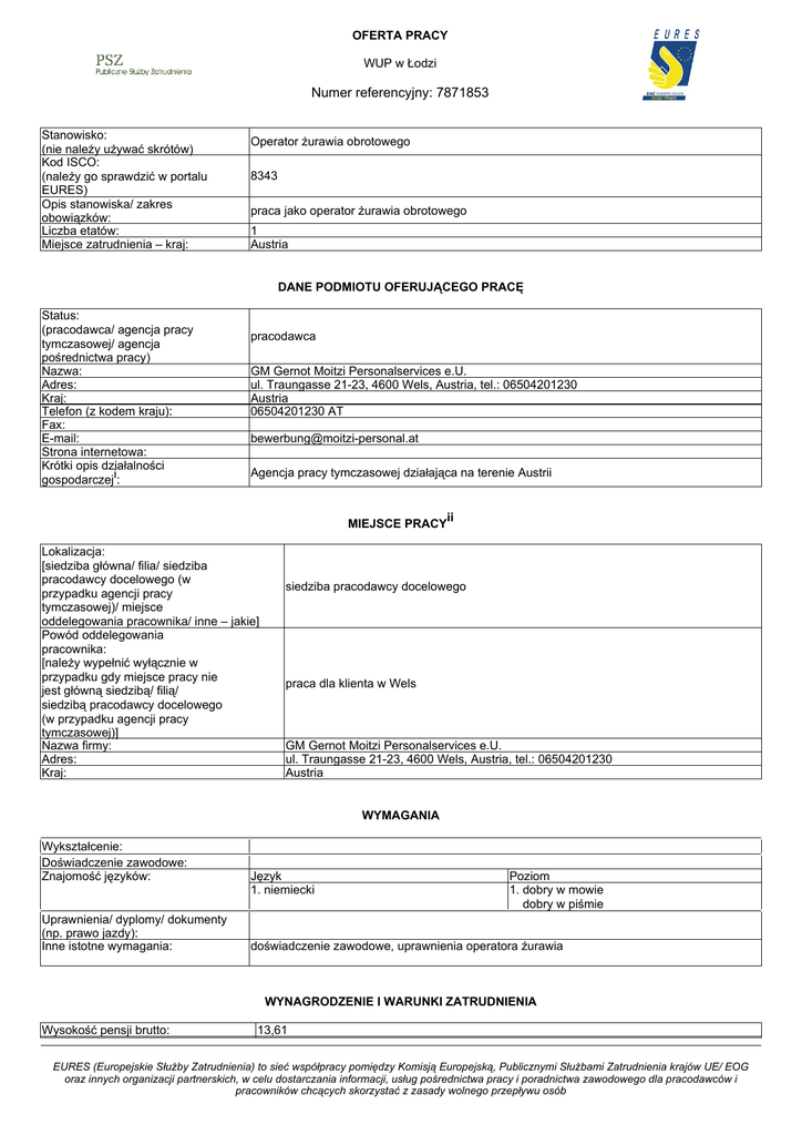 OFERTA PRACY WUP w Łodzi Numer referencyjny: 7871853 Stanowisko: (nie należy używać skrótów) Kod ISCO: (należy go sprawdzić w portalu EURES) Opis stanowiska/ zakres obowiązków: Liczba etatów: Miejsce zatrudnienia – kraj: Operator żurawia obrotowego 8343 praca jako operator żurawia obrotowego 1 Austria DANE PODMIOTU OFERUJĄCEGO PRACĘ Status: (pracodawca/ agencja pracy tymczasowej/ agencja pośrednictwa pracy) Nazwa: Adres: Kraj: Telefon (z kodem kraju): Fax: E-mail: Strona internetowa: Krótki opis działalności gospodarczeji: pracodawca GM Gernot Moitzi Personalservices e.U. ul. Traungasse 21-23, 4600 Wels, Austria, tel.: 06504201230 Austria 06504201230 AT [email protected] Agencja pracy tymczasowej działająca na terenie Austrii MIEJSCE PRACYii Lokalizacja: [siedziba główna/ filia/ siedziba pracodawcy docelowego (w przypadku agencji pracy tymczasowej)/ miejsce oddelegowania pracownika/ inne – jakie] Powód oddelegowania pracownika: [należy wypełnić wyłącznie w przypadku gdy miejsce pracy nie jest główną siedzibą/ filią/ siedzibą pracodawcy docelowego (w przypadku agencji pracy tymczasowej)] Nazwa firmy: Adres: Kraj: siedziba pracodawcy docelowego praca dla klienta w Wels GM Gernot Moitzi Personalservices e.U. ul. Traungasse 21-23, 4600 Wels, Austria, tel.: 06504201230 Austria WYMAGANIA Wykształcenie: Doświadczenie zawodowe: Znajomość języków: Uprawnienia/ dyplomy/ dokumenty (np. prawo jazdy): Inne istotne wymagania: Język 1. niemiecki Poziom 1. dobry w mowie dobry w piśmie doświadczenie zawodowe, uprawnienia operatora żurawia WYNAGRODZENIE I WARUNKI ZATRUDNIENIA Wysokość pensji brutto: 13,61 EURES (Europejskie Służby Zatrudnienia) to sieć współpracy pomiędzy Komisją Europejską, Publicznymi Służbami Zatrudnienia krajów UE/ EOG oraz innych organizacji partnerskich, w celu dostarczania informacji, usług pośrednictwa pracy i poradnictwa zawodowego dla pracodawców i pracowników chcących skorzystać z zasady wolnego przepływu osób Wysokość pensji netto: Waluta, w jakiej wypłacana jest pensja: Rodzaj stawki wynagrodzenia: (godzinowa/ tygodniowa/ miesięczna/ roczna/ inna) Premie: Dodatkowe świadczenia (zakwaterowanie, wyżywienie, koszty związane ze zmianą miejsca zamieszkania, koszty podróży itp.): Nazwa firmy, z którą zostanie podpisana umowa: Rodzaj umowy: (umowa o pracę, umowa zlecenia, wolontariat, praktyka zawodowa/ staż, praca zdalna, agencja pracy tymczasowej, inne): Wymiar czasu pracy (praca na pełen etat/ część etatu): Czas trwania umowy: (nieokreślony/ określony) Liczba godzin tygodniowo: Zmiany i praca w dni wolne: Data rozpoczęcia: Inne informacje: Euro Czasowy ze stawką godzinową brak danych możliwość otrzymania wyższej stawki dla dobrych pracowników GM Gernot Moitzi Personalservices e.U. umowa z agencją - dotyczy pracy tymczasowej pełen etat nieokreślony Data wygaśnięcia umowy (w przypadku umowy na czas określony): 2017-05-24 40,00 brak danych 2016-05-25 termin rozpoczęcia pracy do uzgodnienia, pracodawca oferuje stałe zatrudnienie SPOSÓB SKŁADANIA WNIOSKU Wymagane dokumenty (list motywacyjny, CV itp.): Język, w którym muszą być sporządzone przedkładane dokumenty: Do kogo należy wysłać dokumenty: (do pracodawcy/ doradcy EURES) Gdzie należy wysłać dokumenty: (adres, adres e-mail, nr faksu z kodem kraju itp.) Dane teleadresowe doradcy EURES lub przedstawiciela pracodawcy: (nazwisko, adres, telefon, fax, e-mail itp.) cv niemiecki do agencji email [email protected] tel. do pracodawcy: 0043 650 4201230 DODATKOWE INFORMACJE Agencja pracy tymczasowej GM Gernot Moitzi Personalservices.oświadczyła, że prowadzi działalność zgodnie z przepisami obowiązującymi na terenie Austrii. WAŻNOŚĆ 2016-05-24 Data publikacji: Termin przedkładania podań o pracę / 2016-06-30 zakończenia ważności oferty: Uprzejmie informujemy, że skontaktujemy się wyłącznie z wybranymi kandydatami. UWAGA: 1. Umowa z zagranicznym pracodawcą jest zawierana, co do zasady, zgodnie z prawem kraju zatrudnienia. Oznacza to, że wszystkie roszczenia odnośnie warunków, które obejmuje umowa, można kierować wyłącznie do odpowiedniego sądu w kraju zatrudnienia. Publiczne służby zatrudnienia (EURES) nie mogą pośredniczyć ani reprezentować pracownika w sądzie kraju zatrudnienia w przypadku sporu z pracodawcą. 2. Publiczne służby zatrudnienia (EURES) dokładają wszelkich starań, aby zapewnić rzetelność i wiarygodność ofert pracy zgłoszonych w lokalnym urzędzie pracy. Należy wyjaśnić, że oferta pracy została zgłoszona przez stronę trzecią i EURES nie odpowiada za ewentualne rozbieżności między warunkami pracy określonymi w ofercie pracy i warunkami oferowanymi przez potencjalnego pracodawcę. 3. Publiczne służby zatrudnienia (EURES) informują, że będą zbierać, przetwarzać i przekazywać potencjalnym pracodawcom zgodnie z przepisami dotyczącymi ochrony danych osobowych wszystkie dane osobowe dostarczone przez osoby poszukujące pracy. iInformacje o firmie, takie jak: status prawny, sektor, typ działalności, rodzaj produktów lub świadczonych usług, data rozpoczęcia działalności gospodarczej, liczba pracowników itp. EURES (Europejskie Służby Zatrudnienia) to sieć współpracy pomiędzy Komisją Europejską, Publicznymi Służbami Zatrudnienia krajów UE/ EOG oraz innych organizacji partnerskich, w celu dostarczania informacji, usług pośrednictwa pracy i poradnictwa zawodowego dla pracodawców i pracowników chcących skorzystać z zasady wolnego przepływu osób iiMiejsce, w którym będzie wykonywana praca. Należy wypełnić w przypadku gdy: 1) miejsce wykonywania pracy jest inne niż siedziba podmiotu oferującego pracę, 2) pracę oferuje agencja pośrednictwa pracy/ agencja pracy tymczasowej. EURES (Europejskie Służby Zatrudnienia) to sieć współpracy pomiędzy Komisją Europejską, Publicznymi Służbami Zatrudnienia krajów UE/ EOG oraz