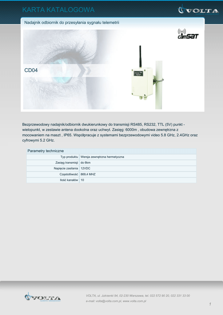 KARTA KATALOGOWA Nadajnik odbiornik do przesyłania sygnału telemetrii CD04 Bezprzewodowy nadajnik/odbiornik dwukierunkowy do transmisji RS485, RS232, TTL (5V) punkt wielopunkt, w zestawie antena dookolna oraz uchwyt. Zasięg: 6000m , obudowa zewnętrzna z mocowaniem na maszt , IP65. Współpracuje z systemami bezprzewodowymi video 5.8 GHz, 2.4GHz oraz cyfrowymi 5.2 GHz. Parametry techniczne Typ produktu Wersja zewnętrzna hermetyczna Zasięg transmisji do 6km Napięcie zasilania 12VDC Częstotliwość 869,4 MHZ Ilość kanałów 10 VOLTA, ul. Jutrzenki 94, 02-230 Warszawa, tel. 022 572 90 20, 022 331 33 00 e-mail: [email protected], www.volta.com.pl 1
