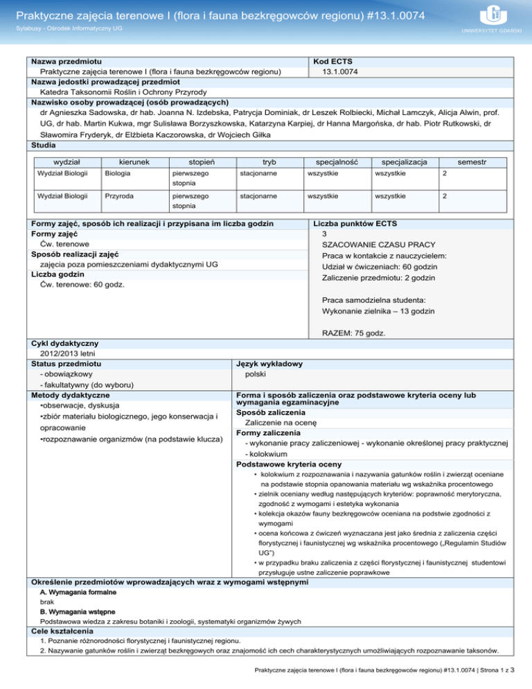 Praktyczne zajęcia terenowe I (flora i fauna bezkręgowców regionu) #13.1.0074 Sylabusy - Ośrodek Informatyczny UG Nazwa przedmiotu Kod ECTS Praktyczne zajęcia terenowe I (flora i fauna bezkręgowców regionu) 13.1.0074 Nazwa jedostki prowadzącej przedmiot Katedra Taksonomii Roślin i Ochrony Przyrody Nazwisko osoby prowadzącej (osób prowadzących) dr Agnieszka Sadowska, dr hab. Joanna N. Izdebska, Patrycja Dominiak, dr Leszek Rolbiecki, Michał Lamczyk, Alicja Alwin, prof. UG, dr hab. Martin Kukwa, mgr Sulisława Borzyszkowska, Katarzyna Karpiej, dr Hanna Margońska, dr hab. Piotr Rutkowski, dr Sławomira Fryderyk, dr Elżbieta Kaczorowska, dr Wojciech Giłka Studia wydział kierunek stopień tryb specjalność specjalizacja semestr Wydział Biologii Biologia pierwszego stopnia stacjonarne wszystkie wszystkie 2 Wydział Biologii Przyroda pierwszego stopnia stacjonarne wszystkie wszystkie 2 Formy zajęć, sposób ich realizacji i przypisana im liczba godzin Formy zajęć Ćw. terenowe Sposób realizacji zajęć zajęcia poza pomieszczeniami dydaktycznymi UG Liczba godzin Ćw. terenowe: 60 godz. Liczba punktów ECTS 3 SZACOWANIE CZASU PRACY Praca w kontakcie z nauczycielem: Udział w ćwiczeniach: 60 godzin Zaliczenie przedmiotu: 2 godzin Praca samodzielna studenta: Wykonanie zielnika – 13 godzin RAZEM: 75 godz. Cykl dydaktyczny 2012/2013 letni Status przedmiotu - obowiązkowy - fakultatywny (do wyboru) Metody dydaktyczne •obserwacje, dyskusja •zbiór materiału biologicznego, jego konserwacja i opracowanie •rozpoznawanie organizmów (na podstawie klucza) Język wykładowy polski Forma i sposób zaliczenia oraz podstawowe kryteria oceny lub wymagania egzaminacyjne Sposób zaliczenia Zaliczenie na ocenę Formy zaliczenia - wykonanie pracy zaliczeniowej - wykonanie określonej pracy praktycznej - kolokwium Podstawowe kryteria oceny • kolokwium z rozpoznawania i nazywania gatunków roślin i zwierząt oceniane na podstawie stopnia opanowania materiału wg wskaźnika procentowego • zielnik oceniany według następujących kryteriów: poprawność merytoryczna, zgodność z wymogami i estetyka wykonania • kolekcja okazów fauny bezkręgowców oceniana na podstwie zgodności z wymogami • ocena końcowa z ćwiczeń wyznaczana jest jako średnia z zaliczenia części florystycznej i faunistycznej wg wskaźnika procentowego („Regulamin Studiów UG”) • w przypadku braku zaliczenia z części florystycznej i faunistycznej studentowi przysługuje ustne zaliczenie poprawkowe Określenie przedmiotów wprowadzających wraz z wymogami wstępnymi A. Wymagania formalne brak B. Wymagania wstępne Podstawowa wiedza z zakresu botaniki i zoologii, systematyki organizmów żywych Cele kształcenia 1. Poznanie różnorodności florystycznej i faunistycznej regionu. 2. Nazywanie gatunków roślin i zwierząt bezkręgowych oraz znajomość ich cech charakterystycznych umożliwiających rozpoznawanie taksonów. Praktyczne zajęcia terenowe I (flora i fauna bezkręgowców regionu) #13.1.0074 | Strona 1 z 3 Praktyczne zajęcia terenowe I (flora i fauna bezkręgowców regionu) #13.1.0074 Sylabusy - Ośrodek Informatyczny UG 3. Umiejętność dobrania i zastosowania odpowiednich metod ilościowej oceny organizmów w terenie. 4. Nabycie umiejętności pracy z kluczem do oznaczania gatunków. Treści programowe Praktyczne rozpoznawanie gatunków roślin naczyniowych i zwierząt bezkręgowych w terenie na podstawie ich cech charakterystycznych. Konstrukcja i posługiwanie się kluczem do oznaczania roślin wyższych i zwierząt bezkręgowych. Obserwacje zwierząt bezkręgowych, techniki zbioru, konserwowania i preparowania materiału. Techniki obserwacji, zbioru, konserwowania i preparowania zwierząt bezkręgowych. Konserwowanie roślin i standardy zakładania zielnika. Poznawanie wybranych elementów biologii obserwowanych gatunków na różnych etapach cyklu życiowego. Zróżnicowanie roślin i zwierząt w wybranych ekosystemach Pomorza (las, łąka, rzeka, jezioro, wydma, plaża i litoral Bałtyku); gatunki chronione, wskaźnikowe, rzadkie oraz gatunki o znaczeniu gospodarczym. Skład flory rodzimej i obcej, ze szczególnym uwzględnieniem gatunków regionalnych. Wymagania siedliskowe gatunków roślin. Wykaz literatury A. Literatura wymagana do ostatecznego zaliczenia zajęć (zdania egzaminu): A.1. wykorzystywana podczas zajęć Pławilszczikow N. 1972. Klucz do oznaczania owadów. PWRiL, Warszawa. Rutkowski L. 2008. Klucz do oznaczania roślin naczyniowych Polski Niżowej. Wyd. Nauk. PWN, Warszawa. Rybak J. I. 2001. Przewodnik do rozpoznawania niektórych bezkręgowych zwierząt słodkowodnych, PWN, Warszawa. Szafer W., Kulczyński S., Pawłowski B. 1988. Rośliny polskie. PWN, Warszawa. A.2. studiowana samodzielnie przez studenta Bogdanowicz W., Chudzicka E., Pilipiuk I., Skibińska E. [red.] 2004, 2007, 2008. Fauna Polski – charakterystyka i wykaz gatunków. T I-III. Muzeum i Instytut Zoologii PAN, Warszawa. Garbarczyk H. [red.] 1983. Świat zwierząt. PWRiL, Warszawa. Głowaciński Z., Nowacki J. [red.] 2005. Polska czerwona księga zwierząt. Bezkręgowce. PAN, Kraków. Rothmaler W., Jäger E., Werner K. 2007. Exkursionsflora von Deutschland. Gefässpflanzen: Atlasband. Spektrum Akademischer Verlag, München. Szafer W., Zarzycki K. (red.) 1977. Szata roślinna Polski. T. 1-2. PWN, Warszawa. B. Literatura uzupełniająca Flora Polska – Rośliny Naczyniowe Polski i Ziem Ościennych. 1919-1980. T. I-XIV. Polska Akademii Umiejętności, Kraków oraz PWN, WarszawaKraków. Gębicki C., Szwedo J. 2010. Owady Polski. Atlas i klucz. Wyd. Kubajak, Kraków. Herczek A., Gorczyca J. 2000. Lądowe ślimaki Polski. Atlas i klucz. Wyd. Kubajak, Kraków. Kościelny S., Sękowski B. 1971. Drzewa i krzewy – klucze do oznaczania. PWRiL, Warszawa. Efekty uczenia się Przedmiot realizuje: Efekty z obszaru nauk przyrodniczych: PlA_W01, PlA_W05, PlA_W07, PlA_W08, P1A_U01, P1A_U06, P1A_U09, P1A_K02, 