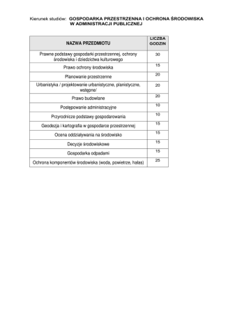 Kierunek studiów: GOSPODARKA PRZESTRZENNA I OCHRONA ŚRODOWISKA W ADMINISTRACJI PUBLICZNEJ NAZWA PRZEDMIOTU LICZBA GODZIN Prawne podstawy gospodarki przestrzennej, ochrony środowiska i dziedzictwa kulturowego 30 Prawo ochrony środowiska 15 Planowanie przestrzenne 20 Urbanistyka / projektowanie urbanistyczne, planistyczne, wstępne/ 20 Prawo budowlane 20 Postępowanie administracyjne 10 Przyrodnicze podstawy gospodarowania 10 Geodezja i kartografia w gospodarce przestrzennej 15 Ocena oddziaływania na środowisko 15 Decyzje środowiskowe 15 Gospodarka odpadami 15 Ochrona komponentów środowiska (woda, powietrze, hałas) 25