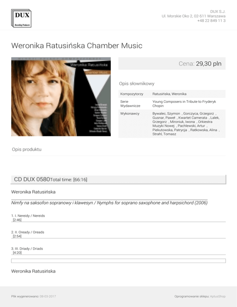 DUX S.J. Ul. Morskie Oko 2, 02-511 Warszawa +48 22 849 11 3 Weronika Ratusińska Chamber Music Cena: 29,30 pln Opis słownikowy Kompozytorzy Ratusińska, Weronika ∎ Serie Wydawnicze Young Composers in Tribute to Fryderyk Chopin Wykonawcy Bywalec, Szymon ∎, Gorczyca, Grzegorz ∎, Gusnar, Paweł ∎, Kwartet Camerata ∎, Lalek, Grzegorz ∎, Mironiuk, Iwona ∎, Orkiestra Muzyki Nowej ∎, Pachlewski, Artur ∎, Piekutowska, Patrycja ∎, Ratkowska, Alina ∎, Strahl, Tomasz ∎ Opis produktu CD DUX 0580Total time: [66:16] Weronika Ratusińska Nimfy na saksofon sopranowy i klawesyn / Nymphs for soprano saxophone and harpsichord (2006) 1. I. Nereidy / Nereids [2:46] 2. II. Oready / Oreads [2:54] 3. III. Driady / Driads [4:20] Weronika Ratusińska Plik wygenerowano: 08-03-2017 Oprogramowanie sklepu: AptusShop DUX S.J. Ul. Morskie Oko 2, 02-511 Warszawa +48 22 849 11 3 Trio na klarnet, wiolonczelę i fortepian / Trio for clarinet, cello and piano (2004) 4. I. Misterioso [4:35] 5. II. Quieto, ad libitum [2:42] 6. III. Appassionato e energico [2:34] Weronika Ratusińska Amarcord ma skrzypce i fortepian / Amarcord for violin and piano (2000) 7. Amarcord ma skrzypce i fortepian / Amarcord for violin and piano (2000) [9:16] Weronika Ratusińska II Kwartet smyczkowy „Ostatnie chwile” / String Quartet No. 2 “The Last Moments” (2003) 8. I. Chwila buntu/ A Moment of Protest [6:46] 9. II. Chwila pożegnania / The Moment of Farewell [5:03] 10. III. Modlitwa / A Camp Prayer [7:23] Weronika Ratusińska Koncert na skrzypce amplifikowane, zespół instrumentalny i taśmę / Concerto for amplified violin, ensemble concerto and tape (2002) 11. Koncert na skrzypce amplifikowane, zespół instrumentalny i taśmę / Concerto for amplified violin, ensemble concerto and tape (2002) [17:53] Plik wygenerowano: 08-03-2017 Oprogramowanie sklepu: AptusShop DUX S.J. Ul. Morskie Oko 2, 02-511 Warszawa +48 22 849 11 3 Wykonawcy: Kwartet Camerata Orkiestra Muzyki Nowej Alina Ratkowska /klawesyn/ Artur Pachlewski /klarnet/ Grzegorz Gorczyca /fortepian/ Grzegorz Lalek /skrzypce/ Iwona Mironiuk /fortepian/ Patrycja Piekutowska /skrzypce/ Paweł Gusnar /saksofon/ Szymon Bywalec /dyrygent/ Tomasz Strahl /wiolonczela/ Plik wygenerowano: 08-03-2017 Powered by TCPDF (www.tcpdf.org) Oprogramowanie sklepu: AptusShop