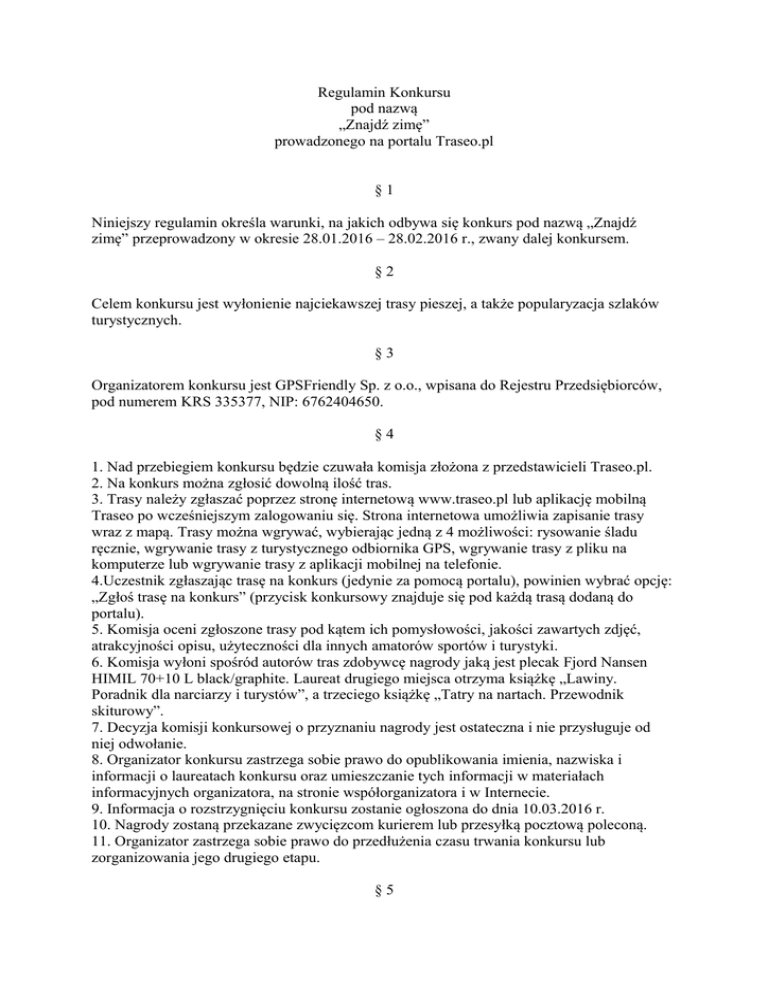 Regulamin Konkursu pod nazwą „Znajdź zimę” prowadzonego na portalu Traseo.pl §1 Niniejszy regulamin określa warunki, na jakich odbywa się konkurs pod nazwą „Znajdź zimę” przeprowadzony w okresie 28.01.2016 – 28.02.2016 r., zwany dalej konkursem. §2 Celem konkursu jest wyłonienie najciekawszej trasy pieszej, a także popularyzacja szlaków turystycznych. §3 Organizatorem konkursu jest GPSFriendly Sp. z o.o., wpisana do Rejestru Przedsiębiorców, pod numerem KRS 335377, NIP: 6762404650. §4 1. Nad przebiegiem konkursu będzie czuwała komisja złożona z przedstawicieli Traseo.pl. 2. Na konkurs można zgłosić dowolną ilość tras. 3. Trasy należy zgłaszać poprzez stronę internetową www.traseo.pl lub aplikację mobilną Traseo po wcześniejszym zalogowaniu się. Strona internetowa umożliwia zapisanie trasy wraz z mapą. Trasy można wgrywać, wybierając jedną z 4 możliwości: rysowanie śladu ręcznie, wgrywanie trasy z turystycznego odbiornika GPS, wgrywanie trasy z pliku na komputerze lub wgrywanie trasy z aplikacji mobilnej na telefonie. 4.Uczestnik zgłaszając trasę na konkurs (jedynie za pomocą portalu), powinien wybrać opcję: „Zgłoś trasę na konkurs” (przycisk konkursowy znajduje się pod każdą trasą dodaną do portalu). 5. Komisja oceni zgłoszone trasy pod kątem ich pomysłowości, jakości zawartych zdjęć, atrakcyjności opisu, użyteczności dla innych amatorów sportów i turystyki. 6. Komisja wyłoni spośród autorów tras zdobywcę nagrody jaką jest plecak Fjord Nansen HIMIL 70+10 L black/graphite. Laureat drugiego miejsca otrzyma książkę „Lawiny. Poradnik dla narciarzy i turystów”, a trzeciego książkę „Tatry na nartach. Przewodnik skiturowy”. 7. Decyzja komisji konkursowej o przyznaniu nagrody jest ostateczna i nie przysługuje od niej odwołanie. 8. Organizator konkursu zastrzega sobie prawo do opublikowania imienia, nazwiska i informacji o laureatach konkursu oraz umieszczanie tych informacji w materiałach informacyjnych organizatora, na stronie współorganizatora i w Internecie. 9. Informacja o rozstrzygnięciu konkursu zostanie ogłoszona do dnia 10.03.2016 r. 10. Nagrody zostaną przekazane zwycięzcom kurierem lub przesyłką pocztową poleconą. 11. Organizator zastrzega sobie prawo do przedłużenia czasu trwania konkursu lub zorganizowania jego drugiego etapu. §5 1. Niniejszy Regulamin jest jedynym dokumentem określającym zasady konkursu. 2. Uczestnik zobowiązany jest do zapoznania się z niniejszym Regulaminem przed przystąpieniem do konkursu. Uczestnik ponosi wyłączną odpowiedzialność za niezastosowanie się do postanowień niniejszego Regulaminu. 3. Uczestnik konkursu zgadza się na przekazanie swojego loginu na Traseo, imienia, nazwiska oraz swojego adresu mailowego współorganizatorowi konkursu w celu przesyłania drogą elektroniczną treści promocyjnych. Sklep Szanti oraz TPN zobowiązuje się wykorzystywać pozyskane dane zgodnie z Ustawą o ochronie danych osobowych z 29 sierpnia 1997 r. z późniejszymi zmianami. 4. Pracownicy GPSFriendly/ TPN / Szanti oraz ich rodziny nie mogą brać udziału w konkursie. 5. Uczestnik poprzez fakt przystąpienia do konkursu akceptuje postanowienia niniejszego Regulaminu. 6. Niniejszy regulamin wchodzi w życie od dnia 28.01.2016 r. ORGANIZATOR GPSFriendly Sp. z o.o.