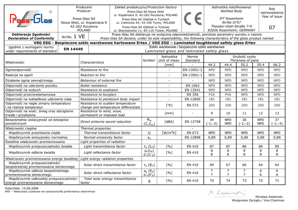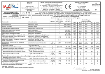 Producent Producer Zakład produkcyjny/Production factory Press-Glas SA Nowa Wieś ul. Kopalniana 9; 42-262 Poczesna; POLAND Nr/No. 1 VE a Rok wprowadzenia Year of issue IFT Rosenheim Nr/No 0757 Theodor-Gietl-Straße 7-9 Press-Glas SA Oddział w Tczewie 07 83026 Rosenheim; GERMANY ul. Skarszewska 11; 83-110 Tczew; POLAND Press-Glas SA deklaruje na wyłączną odpowiedzialność, poniŜsze parametry wyrobu o nazwie Press-Glas SA declare, under its sole responsibility, the following characteristics of the glass product named Press-Glas SA Nowa Wieś, ul. Kopalniana 9 42-262 Poczesna POLAND Deklaracja Zgodności Declaration of Conformity Jednostka notyfikowana/ Notified Body a Press-Glas SA Oddział w Tychach ul. Cielmicka 44; 43-100 Tychy; POLAND a VSG ESG - Bezpieczne szkło warstwowe hartowane Ertex / VSG ESG – Laminated toughtened safety glass Ertex Szkło warstwowe i bezpieczne szkło warstwowe EN 14449 La m i na t ed g l as s a nd l am i n at e d s af ety gl as s zgodnie z wymogami normy under requirements of standard Symbol Jednostka Unit of meas. [mm] Norma Standard - 44.2 Grubość szyby Thickness of pane 44.4 55.2 55.4 66.2 Właściwości Characteristics Ognioodporność Resistance to fire - EN-13501-2 NPD NPD NPD NPD NPD Reakcja na ogień Reaction to fire - EN-13501-1 NPD NPD NPD NPD NPD Działanie ognia zewnętrznego Behaviour of external fire - - NPD NPD NPD NPD NPD Odporność na uderzenie pocisku Odporność na wybuch Odporność przeciwwłamaniowa Odporność na wahadłowe uderzenie ciała Odporność na nagle zmiany temperatury i na róŜnice temperatur Odporność na wiatr, śnieg oraz obciąŜenie trwałe i przyłoŜone Bezpośrednia izolacyjność od dźwięków powietrznych Bullet resistance Resistance to explosion Resistance to burglary Resistance to pendulum body impact Resistance to sudden temperature change and temperature differentials Resistance to wind, snow, permanent or imposed load - EN 1063 EN 13541 EN 356 EN 12600 NPD NPD P2A 1B1 NPD NPD P4A 1B1 NPD NPD NPD 1B1 NPD NPD NPD 1B1 NPD NPD NPD 1B1 [oK] EN 572 200 200 200 200 200 [mm] - 9 10 11 12 13 [dBA] EN 12758 34 (-1;-2) NPD NPD 36 (-1;-2) NPD NPD 37 (-1;-3) Właściwości cieplne Współczynnik przenikania ciepła Współczynnik emisyjności normalnej Świetlne właściwości promieniowania Współczynnik przepuszczalności światła Thermal properties Thermal transmittance factor Normal emissivity factor Light properties of radiation Light transmittance factor NPD 0,89 NPD 0,89 NPD 0,89 NPD 0,89 NPD 0,89 87 8 8 87 8 8 86 8 8 86 8 8 85 8 8 Współczynnik odbicia światła Direct airborne sound reduction Light reflectance factor Właściwości promieniowania energii świetlnej Light energy radiation properties Współczynnik przepuszczalności Solar direct transmittance factor bezpośredniej promieniowania słonecznego Współczynnik odbicia bezpośredniego Solar direct reflectance factor promieniowania słonecznego Współczynnik całkowitej przepuszczalności Total solar energy transmittance energii promieniowania słonecznego factor Rw (C,Ctr) U εn [W/m K] EN 673 EN 12898 τV (LT) [%] EN 410 ρV(LR) ρ’V(L’R) [%] EN 410 τe (ET) [%] EN 410 69 67 66 64 64 ρe (ER) ρ’e(E’R) [%] EN 410 7 7 7 7 7 7 6 6 6 6 g [%] EN 410 75 74 73 72 71 2 Data/Date: 19.08.2008 NPD – Właściwość uŜytkowa nie oznaczona/No performance determined Mirosław Radomski Wiceprezes Zarządu / Vice Chairman Producent Producer Zakład produkcyjny/Production factory Press-Glas SA Nowa Wieś ul. Kopalniana 9; 42-262 Poczesna; POLAND Nr/No. 2 VE a Rok wprowadzenia Year of issue IFT Rosenheim Nr/No 0757 Theodor-Gietl-Straße 7-9 Press-Glas SA Oddział w Tczewie 07 83026 Rosenheim; GERMANY ul. Skarszewska 11; 83-110 Tczew; POLAND Press-Glas SA deklaruje na wyłączną odpowiedzialność, poniŜsze parametry wyrobu o nazwie Press-Glas SA declare, under its sole responsibility, the following characteristics of the glass product named Press-Glas SA Nowa Wieś, ul. Kopalniana 9 42-262 Poczesna POLAND Deklaracja Zgodności Declaration of Conformity Jednostka notyfikowana/ Notified Body a Press-Glas SA Oddział w Tychach ul. Cielmicka 44; 43-100 Tychy; POLAND a VSG ESG - Bezpieczne szkło warstwowe hartowane Ertex / VSG ESG – Laminated safety toughtened glass Ertex Szkło warstwowe i bezpieczne szkło warstwowe EN 14449 La m i na t ed g l as s a nd l am i n at e d s af ety gl as s zgodnie z wymogami normy under requirements of standard Symbol Jednostka Unit of meas. [mm] Norma Standard - 66.4 Grubość szyby Thickness of pane 86.2 88.2 88.4 Właściwości Characteristics Ognioodporność Resistance to fire - EN-13501-2 NPD NPD NPD NPD NPD Reakcja na ogień Reaction to fire - EN-13501-1 NPD NPD NPD NPD NPD Działanie ognia zewnętrznego Behaviour of external fire - - NPD NPD NPD NPD NPD Odporność na uderzenie pocisku Odporność na wybuch Odporność przeciwwłamaniowa Odporność na wahadłowe uderzenie ciała Odporność na nagle zmiany temperatury i na róŜnice temperatur Odporność na wiatr, śnieg oraz obciąŜenie trwałe i przyłoŜone Bezpośrednia izolacyjność od dźwięków powietrznych Bullet resistance Resistance to explosion Resistance to burglary Resistance to pendulum body impact Resistance to sudden temperature change and temperature differentials Resistance to wind, snow, permanent or imposed load - EN 1063 EN 13541 EN 356 EN 12600 NPD NPD NPD 1B1 NPD NPD NPD 1B1 NPD NPD NPD 1B1 NPD NPD NPD 1B1 NPD NPD P2A 1B1 [oK] EN 572 200 200 200 200 200 [mm] - 14 15 17 18 17 [dBA] EN 12758 NPD NPD NPD NPD NPD NPD NPD NPD NPD NPD Właściwości cieplne Współczynnik przenikania ciepła Współczynnik emisyjności normalnej Świetlne właściwości promieniowania Współczynnik przepuszczalności światła Thermal properties Thermal transmittance factor Normal emissivity factor Light properties of radiation Light transmittance factor NPD 0,89 NPD 0,89 NPD 0,89 NPD 0,89 NPD 0,89 85 8 8 86 8 8 83 7 7 83 8 8 84 8 8 Współczyn