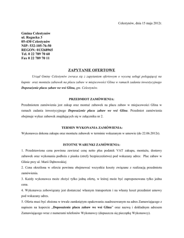 Celestynów, dnia 15 maja 2012r. Gmina Celestynów ul. Regucka 3 05-430 Celestynów NIP: 532-105-76-50 REGON: 013268965 Tel. 0 22 789 70 60 Fax 0 22 789 70 11 ZAPYTANIE OFERTOWE Urząd Gminy Celestynów zwraca się z zapytaniem ofertowym o wycenę usługi polegającej na kupnie oraz montażu zabawek na placu zabaw w miejscowości Glina w ramach zadania inwestycyjnego Doposażenie placu zabaw we wsi Glina, gm. Celestynów. PRZEDMIOT ZAMÓWIENIA: Przedmiotem zamówienia jest zakup oraz montaż zabawek na placu zabaw w miejscowości Glina w ramach zadania inwestycyjnego Doposażenie placu zabaw we wsi Glina. Przedmiot zamówienia obejmuje wykaz zabawek znajdujących się w załączniku nr 2. TERMIN WYKONANIA ZAMÓWIENIA: Wykonawca dokona zakupu oraz montażu zabawek w terminie wskazanym w umowie (do 22.06.2012r). ISTOTNE WARUNKI ZAMÓWIENIA: 1. Przedstawiona cena powinna zawierać cenę netto plus podatek VAT zakupu, montażu, dostawy zabawek oraz wykonania podłoża z piasku (strefy bezpieczeństwa) pod wskazany adres: Plac zabaw w Glinie przy ul. Marii Dąbrowskiej 2. Cena określona w ofercie powinna obejmować wszystkie koszty związane z realizacją przedmiotu zamówienia. 3. Każdy wykonawca może złożyć tylko jedną ofertę, w której może być zaproponowana tylko jedna cena. 4. Wykonawca zobowiązany jest dostarczać własnym transportem i na własny koszt przedmiot umowy pod wskazany adres. 5. Oferta musi być złożona w trwale zamkniętym opakowaniu zaadresowanym na adres Zamawiającego z napisem na kopercie „Doposażenie placu zabaw we wsi Glina” oraz nazwą i dokładnym adresem Zamawiającego wraz z numerami telefonów Wykonawcy (dopuszcza się pieczątkę Wykonawcy). 6. Oferta musi być podpisana przez osobę upoważnioną do reprezentowania Wykonawcy. 7. Wszelkie miejsca w ofercie, w których Wykonawca naniósł poprawki lub zmiany wpisywanej przez siebie treści muszą być parafowane przez osobę podpisującą ofertę. 8. Rozliczenie transakcji następować będzie przelewem na konto wskazane na fakturze w ciągu 14 dni od dnia otrzymania prawidłowo wystawionej faktury przez Wykonawcę. 9. Przed upływem terminu składania ofert, w szczególnie uzasadnionych przypadkach Zamawiający może zmodyfikować treść zapytania ofertowego. Dokonana modyfikacja zostanie niezwłocznie przekazana wszystkim wykonawcom, którzy otrzymali zapytanie ofertowe. 10. Zamawiający może zamknąć postępowanie bez wybrania żadnej oferty, w przypadku, gdy żadna ze złożonych ofert nie odpowiada warunkom określonym przez Zamawiającego. 11. Ofertę w postaci załącznika nr 1 do niniejszego zapytania ofertowego (Formularz cenowy) należy złożyć do dnia 25.05.2012r. do godz. 13.00 w Biurze Obsługi Mieszkańca Urzędu Gminy w Celestynowie. 12. Zamawiający powiadomi o wyniku postępowania, zamieszczając stosowne ogłoszenie na stronie internetowej Gminy Celestynów, zaś Oferent, którego oferta zostanie wybrana zostanie powiadomiony telefonicznie. 14. Poszczególne zabawki oraz ich elementy, w tym elementy montażowe muszą być oryginalne, nowe, nie posiadające śladów uszkodzeń i użytkowania. 15. Osobami uprawnionymi do kontaktu z oferentami są: Marcin Jedynak tel. 22 789 70 60 wew. 121, e– mail: [email protected], Monika Jankowska tel. 22 789 70 60 wew. 114, e-mail: [email protected] 16. Wymagane dokumenty: • wykaz wykonywanych prac związanych z montażem zabawek (załącznik nr 3), • do oferty należy dołączyć certyfikaty zabawek znajdujących się w załączniku nr 2, • referencje wykonywanych prac związanych z montażem zabawek. Oferent, którego oferta zostanie wybrana zobowiązany jest do: • przedstawienia kosztorysu Zamawiającemu, w tym wyszczególnieniu kwot poszczególnych zabawek, ich montażu, dostawy oraz wykonania podłoża w strefach bezpieczeństwa z piasku. • przedstawienia aktualnego wypisu z właściwego rejestru (wystawionego nie wcześniej niż 6 miesięcy) Wójt Gminy Celestynów /-/ Stefan Traczyk ................................................. pieczęć firmy ........................................ miejscowość i data OFERTA Nazwa Wykonawcy: ........................................................................................................ Siedziba Wykonawcy: ..................................................................................................... .................................................................................................................................... tel. ..................................................... tel. kom ............................................................. Odpowiadając na zapytanie ofertowe w postępowaniu bezprzetargowym na zadanie pn.: „Doposażenie placu zabaw we wsi Glina” zgodnie z parametrami określonymi w zapytaniu ofertowym(zakup, montaż, dostawa, wykonanie nawierzchni) Oferujemy cenę: 1. Oferuję (słownie cenę za przedmiot zamówienia w wysokości: ............................................ .....................................................................................................................), zł., podatek VAT ...................% cena brutto ...................................................................zł. 2. Oświadczam, że akceptuję warunki opisane w Zapytaniu ofertowym na zakup, montaż, dostawę zabawek oraz wykonanie podłoża z piasku (strefy bezpieczeństwa) do miejscowości Glina (gm. Celestynów) oraz zobowiązuję się do zawarcia umowy z Zamawiającym. ........................................................................................................ data i czytelny podpis osób uprawnionych do reprezentowania Wykonawcy Załącznik 2 Wykaz wyposażenia placu zabaw we wsi Glina: 1.huśtawka wagowa 2. zestaw sportowy: • 1 x ścianka linowa kratownica • 1 x ścianka linowa pajęczyna • 1 x ścianka sprawnościowa • 1 x ścianka wspinaczkowa • 1 x belka z uchwytami • 1 x drabinka skośna wysok