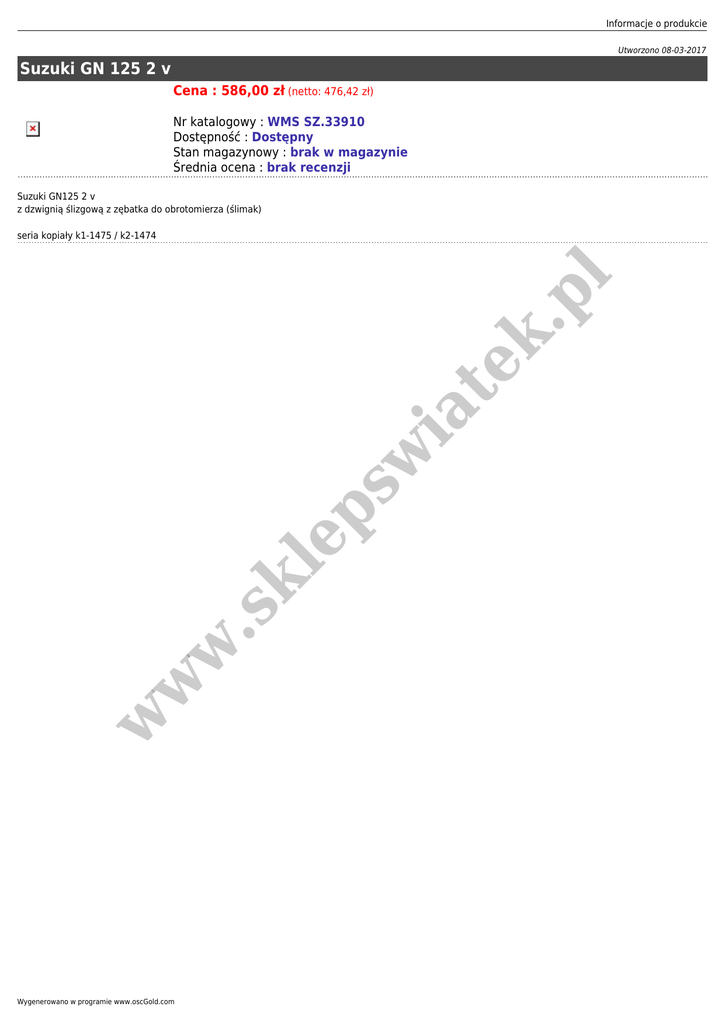 Informacje o produkcie Utworzono 08-03-2017 Suzuki GN 125 2 v Cena : 586,00 zł (netto: 476,42 zł) Nr katalogowy : WMS SZ.33910 Dostępność : Dostępny Stan magazynowy : brak w magazynie Średnia ocena : brak recenzji Suzuki GN125 2 v z dzwignią ślizgową z zębatka do obrotomierza (ślimak) w w w .s kl ep sw ia te k. pl seria kopiały k1-1475 / k2-1474 Wygenerowano w programie www.oscGold.com