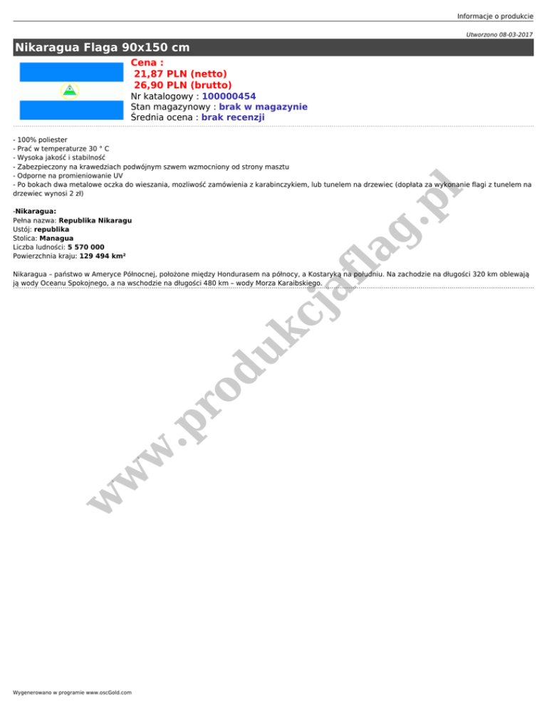 Informacje o produkcie Utworzono 08-03-2017 Nikaragua Flaga 90x150 cm Cena : 21,87 PLN (netto) 26,90 PLN (brutto) Nr katalogowy : 100000454 Stan magazynowy : brak w magazynie Średnia ocena : brak recenzji .p l - 100% poliester - Prać w temperaturze 30 ° C - Wysoka jakość i stabilność - Zabezpieczony na krawedziach podwójnym szwem wzmocniony od strony masztu - Odporne na promieniowanie UV - Po bokach dwa metalowe oczka do wieszania, mozliwość zamówienia z karabinczykiem, lub tunelem na drzewiec (dopłata za wykonanie flagi z tunelem na drzewiec wynosi 2 zł) af la g -Nikaragua: Pełna nazwa: Republika Nikaragu Ustój: republika Stolica: Managua Liczba ludności: 5 570 000 Powierzchnia kraju: 129 494 km² w w w .p ro du kc j Nikaragua – państwo w Ameryce Północnej, położone między Hondurasem na północy, a Kostaryką na południu. Na zachodzie na długości 320 km oblewają ją wody Oceanu Spokojnego, a na wschodzie na długości 480 km – wody Morza Karaibskiego. Wygenerowano w programie www.oscGold.com
