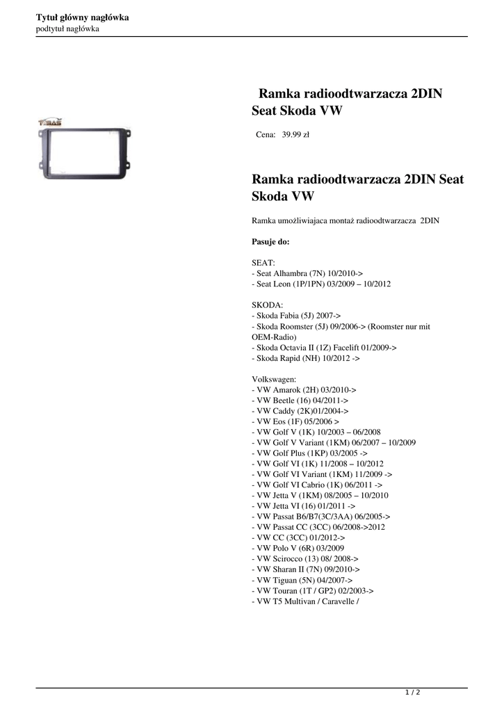 Tytuł główny nagłówka podtytuł nagłówka Ramka radioodtwarzacza 2DIN Seat Skoda VW Cena: 39.99 zł Ramka radioodtwarzacza 2DIN Seat Skoda VW Ramka umożliwiajaca montaż radioodtwarzacza 2DIN Pasuje do: SEAT: - Seat Alhambra (7N) 10/2010-> - Seat Leon (1P/1PN) 03/2009 – 10/2012 SKODA: - Skoda Fabia (5J) 2007-> - Skoda Roomster (5J) 09/2006-> (Roomster nur mit OEM-Radio) - Skoda Octavia II (1Z) Facelift 01/2009-> - Skoda Rapid (NH) 10/2012 -> Volkswagen: - VW Amarok (2H) 03/2010-> - VW Beetle (16) 04/2011-> - VW Caddy (2K)01/2004-> - VW Eos (1F) 05/2006 > - VW Golf V (1K) 10/2003 – 06/2008 - VW Golf V Variant (1KM) 06/2007 – 10/2009 - VW Golf Plus (1KP) 03/2005 -> - VW Golf VI (1K) 11/2008 – 10/2012 - VW Golf VI Variant (1KM) 11/2009 -> - VW Golf VI Cabrio (1K) 06/2011 -> - VW Jetta V (1KM) 08/2005 – 10/2010 - VW Jetta VI (16) 01/2011 -> - VW Passat B6/B7(3C/3AA) 06/2005-> - VW Passat CC (3CC) 06/2008->2012 - VW CC (3CC) 01/2012-> - VW Polo V (6R) 03/2009 - VW Scirocco (13) 08/ 2008-> - VW Sharan II (7N) 09/2010-> - VW Tiguan (5N) 04/2007-> - VW Touran (1T / GP2) 02/2003-> - VW T5 Multivan / Caravelle / 1/2 Tytuł główny nagłówka podtytuł nagłówka 2/2 Powered by TCPDF (www.tcpdf.org)