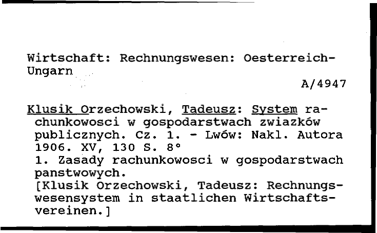 wirtschaft: Rechnungswesen: OesterreichUngarn A/4947 Klusik Orzechowski, Tadeusz: Svstem rachunkowosci w gospodarstwach zwiazk6w publicznych. Cz. 1. - Lw6w: Nakl. Autora 1906. XV, 130 S. 8° 1. Zasady rachunkowosci w gospodarstwach panstwowych. [Klusik Orzechowski, Tadeusz: Rechnungswesensystem in staatlichen wirtschaftsvereinen.]