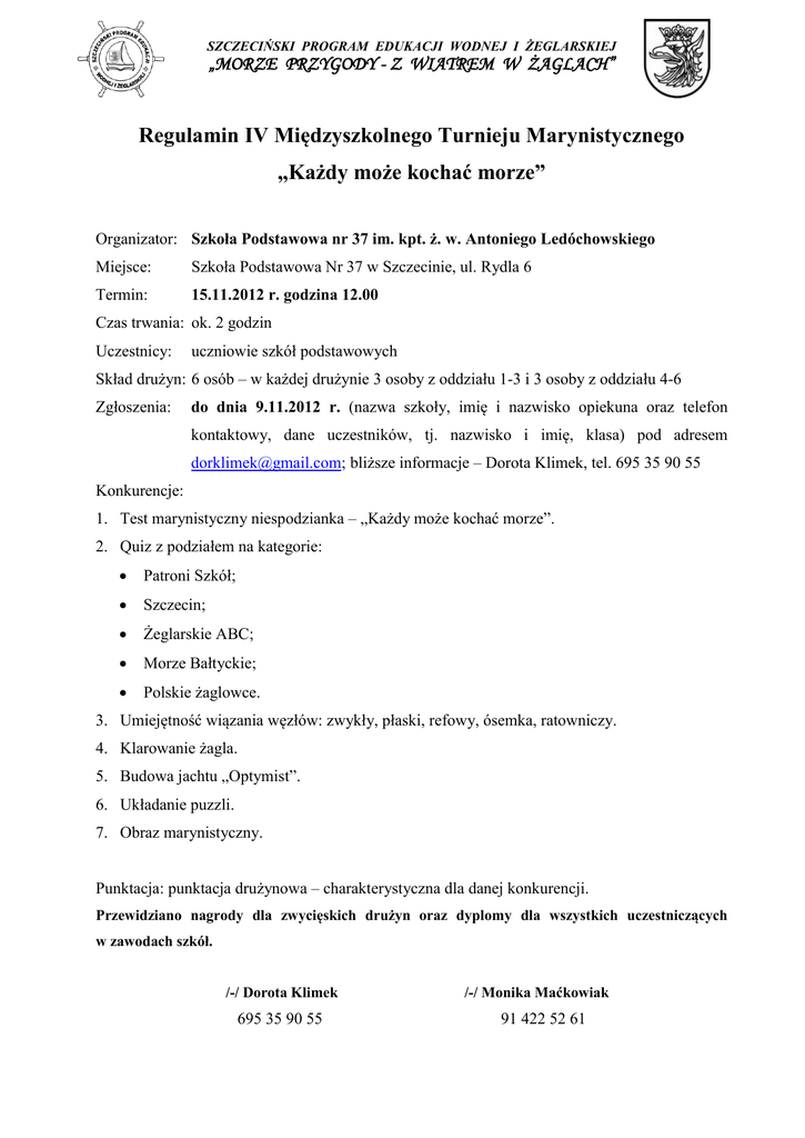 SZCZECIŃSKI PROGRAM EDUKACJI WODNEJ I ŻEGLARSKIEJ „MORZE PRZYGODY - Z WIATREM W ŻAGLACH” Regulamin IV Międzyszkolnego Turnieju Marynistycznego „Każdy może kochać morze” Organizator: Szkoła Podstawowa nr 37 im. kpt. ż. w. Antoniego Ledóchowskiego Miejsce: Szkoła Podstawowa Nr 37 w Szczecinie, ul. Rydla 6 Termin: 15.11.2012 r. godzina 12.00 Czas trwania: ok. 2 godzin Uczestnicy: uczniowie szkół podstawowych Skład drużyn: 6 osób – w każdej drużynie 3 osoby z oddziału 1-3 i 3 osoby z oddziału 4-6 Zgłoszenia: do dnia 9.11.2012 r. (nazwa szkoły, imię i nazwisko opiekuna oraz telefon kontaktowy, dane uczestników, tj. nazwisko i imię, klasa) pod adresem [email protected]; bliższe informacje – Dorota Klimek, tel. 695 35 90 55 Konkurencje: 1. Test marynistyczny niespodzianka – „Każdy może kochać morze”. 2. Quiz z podziałem na kategorie: Patroni Szkół; Szczecin; Żeglarskie ABC; Morze Bałtyckie; Polskie żaglowce. 3. Umiejętność wiązania węzłów: zwykły, płaski, refowy, ósemka, ratowniczy. 4. Klarowanie żagla. 5. Budowa jachtu „Optymist”. 6. Układanie puzzli. 7. Obraz marynistyczny. Punktacja: punktacja drużynowa – charakterystyczna dla danej konkurencji. Przewidziano nagrody dla zwycięskich drużyn oraz dyplomy dla wszystkich uczestniczących w zawodach szkół. /-/ Dorota Klimek 695 35 90 55 /-/ Monika Maćkowiak 91 422 52 61