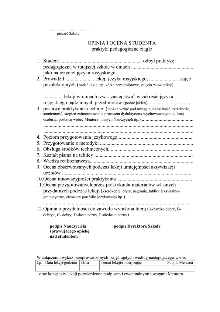 ..................................... pieczęć Szkoły OPINIA I OCENA STUDENTA praktyki pedagogiczne ciągłe 1. Student ............................................................... odbył praktykę pedagogiczną w tutejszej szkole w dniach ................................................ jako nauczyciel języka rosyjskiego. 2. Prowadził ...................... lekcji języka rosyjskiego, ....................... zajęć pozalekcyjnych (podać jakie, np. kółka przedmiotowe, zajęcia w świetlicy) ..................................................................................................................., ............... lekcji w ramach tzw. „zastępstwa” w zakresie języka rosyjskiego bądź innych przedmiotów (podać jakich) .................................. 3. postawę praktykanta cechuje: (można wziąć pod uwagę punktualność, rzetelność, sumienność, stopień zainteresowania procesem dydaktyczno-wychowawczym, kulturę osobistą, postawę wobec Mentora i innych Nauczycieli itp.) ........................................ .................................................................................................................... .................................................................................................................... 4. Poziom przygotowania językowego........................................................... 5. Przygotowanie z metodyki ........................................................................ 6. Obsługa środków technicznych.................................................................. 7. Kształt pisma na tablicy ............................................................................ 8. Wiedza realioznawcza................................................................................ 9. Ocena obserwowanych podczas lekcji umiejętności aktywizacji uczniów ..................................................................................................... 10. Ocena innowacyjności praktykanta .......................................................... 11. Ocena przygotowanych przez praktykanta materiałów własnych przydatnych podczas lekcji (kserokopie, płyty, nagrania, tablice leksykalnogramatyczne, elementy portfolio językowego itp.) ......................................... .................................................................................................................. 12. Opinia o przydatności do zawodu wyrażona literą (A-bardzo dobry, Bdobry+, C- dobry, D-dostateczny, E-niedostateczny) ............................................... podpis Nauczyciela sprawującego opiekę nad studentem podpis Dyrektora Szkoły W załączeniu wykaz przeprowadzonych zajęć ujętych według następującego wzoru: Lp. Data lekcji/godzina klasa Temat lekcji/rodzaj zajęć Podpis Mentora oraz konspekty lekcji potwierdzone podpisem i ewentualnymi uwagami Mentora.