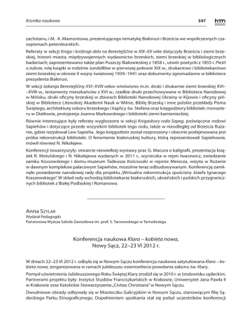 Kronika naukowa 347 zachstanu, i M. A. Mamontowa, prezentującego tematykę Białorusi i Brześcia we współczesnych czasopismach petersburskich. Referaty w sekcji Kniga i knižnoje delo na Berestejščine w XIX–XX veke dotyczyły Brześcia i ziemi brzeskiej, historii miasta, międzywojennych wydawnictw brzeskich, ziemi brzeskiej w bibliologicznych badaniach; zaprezentowano także plan Puszczy Białowieskiej z 1858 r., utwór poetycki z 1855 r. Pieśń o żubrze, rolę książki w rodzinie Jundziłłów w pierwszej połowie XIX w., drukarstwo i bibliotekarstwo ziemi brzeskiej w okresie II wojny światowej 1939–1941 oraz dokumenty zgromadzone w bibliotece prezydenta Białorusi. W sekcji Izdanija Berestejščiny XVI–XVIII vekov omówiono m.in. druki i drukarnie ziemi brzeskiej XVI– –XVIII w., testamenty mieszkańców z XVI w., rzadkie druki przechowywane w Bibliotece Narodowej w Mińsku, druki oficyny brzeskiej w zbiorach Biblioteki Narodowej Ukrainy w Kijowie i oficyny pińskiej w Bibliotece Litewskiej Akademii Nauk w Wilnie, Biblię Brzeską i inne polskie przekłady Pisma Świętego, architekturę soboru brzeskiego i kaplicy św. Stefana oraz księgozbiory bibliotek: monasteru w Diatłowie, protojereja Joanna Markowskiego i biblioteki ziemi kamienieckiej. Równie interesujące były referaty wygłoszone w sekcji Knigasbory roda Sapeg, poświęcone rodowi Sapiehów i dotyczące przede wszystkim bibliotek tego rodu, także w nieodległej od Brześcia Rużanie, gdzie rezydował Lew Sapieha. Jego księgozbiór został rozproszony i obecnie podejmowana jest próba rekonstrukcji biblioteki. O fenomenie białoruskiej kultury, którą reprezentowali Sapiehowie, mówił również N. Nikołajew. Konferencji towarzyszyły: otwarcie niewielkiej wystawy prac G. Macura o kaligrafii, prezentacja książek R. Motulskiego i N. Nikołajewa wydanych w 2011 r., wycieczka w rejon Iwacewicz, zwiedzanie zamku Kossowskiego i domu-muzeum Tadeusza Kościuszki w rejonie Merecza, wizyta w Rużanie w dawnym kompleksie pałacowym Sapiehów, mozolnie teraz odbudowywanym. Konferencję zamknęło posiedzenie narodowej rady dla projektu „Wirtualna rekonstrukcja spuścizny Józefa Ignacego Kraszewskiego”. W skład rady wchodzą bibliotekarze białoruskich, ukraińskich i polskich przygranicznych bibliotek z Białej Podlaskiej i Romanowa. Anna SZYLAR Wydział Pedagogiki Państwowa Wyższa Szkoła Zawodowa im. prof. S. Tarnowskiego w Tarnobrzegu Konferencja naukowa Klara – kobieta nowa, Nowy Sącz, 22–23 VI 2012 r. W dniach 22–23 VI 2012 r. odbyła się w Nowym Sączu konferencja naukowa zatytułowana Klara – kobieta nowa, zorganizowana w ramach jubileuszu osiemsetlecia powołania zakonu św. Klary. Pomysł uświetnienia Jubileuszowego Roku Świętej Klary zrodził się w 2010 r. w środowisku sądeckim. Partnerami projektu były: Instytut Studiów Franciszkańskich w Krakowie, Uniwersytet Jana Pawła II w Krakowie oraz Katolickie Stowarzyszenie „Civitas Christiana” w Nowym Sączu. Dwudniowe obrady odbywały się w Miasteczku Galicyjskim w Nowym Sączu, stanowiącym filię Sądeckiego Parku Etnograficznego. Dopełnieniem spotkania stał się pobyt uczestników konferencji 348 Kronika naukowa w Starym Sączu, połączony ze zwiedzaniem Muzeum Regionalnego „Domu na Dołkach”, udziałem we mszy w kościele klasztornym klarysek pw. Trójcy Świętej oraz spotkaniem z ksienią i siostrami zakonnymi w rozmównicy klasztornej. Konferencja stanowiła miejsce dyskusji naukowej badaczy z ośrodków akademickich z kraju i spoza jego granic: z Uniwersytetu Papieskiego w Rzymie, Instytutu Studiów Franciszkańskich w Krakowie, Uniwersytetu Wrocławskiego, Katolickiego Uniwersytetu Lubelskiego, Uniwersytetu Jana Pawła II z Krakowa i jego oddziału w Tarnowie oraz Polskiej Akademii Nauk. Obrady otworzyła ksieni klasztoru klarysek w Starym Sączu, s. Teresa Izworska, która podczas teletransmisji skierowanej do uczestników konferencji powiedziała: Jubileusz to wielki dar, ale i zadanie nie tylko dla Zakonu Sióstr Klarysek. Nasza Święta Założycielka ma wiele do powiedzenia współczesnemu człowiekowi, gdyż jak niegdyś mówił bł. Ojciec Święty Jan Paweł II „święci się nie starzeją” i ciągle są dla nas drogowskazami na szlakach doczesnego pielgrzymowania. Nad problematyką klariańską, osnutą wokół życia i działalności św. Klary, a w jej kontekście klarysek z klasztoru w Starym Sączu, dyskutowano podczas dwudniowych obrad. Za myśl przewodnią pierwszego dnia konferencji przyjęto sentencję „Clara Claris praeclara meritis...”, drugiego zaś „Święta Klara duchowa przewodniczka życia konwentu starosądeckich klarysek”. Referaty i komunikaty wygłosiło 13 prelegentów. O. Stanisław Mazgaj (Święta Klara „Kobieta nowa” – rys biograficzny), przedstawiając zarys biografii Klary, podkreślił aktualność jej przesłania duchowego. Ks. Felice Accrocca (Chiara e la vita comunitaria a S. Damiano. Klara i życie wspólnotowe w S. Damiano) omówił życie Klary we wspólnocie w San Damiano, podkreślając jej związek duchowy z myślą i posłannictwem św. Franciszka. Dopełnienie tej części obrad stanowił referat Teresy Paszkowskiej: Klara – radykalna strażniczka paradoksalnego przywileju. Tematyka kolejnych wystąpień koncentrowała się wokół szeroko rozumianej kultury i tradycji klariańskiej. Igor Borkowski (Jak umiera klaryska. Ars bene moriendi w świetle dokumentów klasztoru starosądeckiego i tradycji klariańskiej) zaprezentował zwyczaje związane z tzw. sztuką umierania, a Olga Miriam Przybyłowicz (Niecodzienna codzienność. Obłóczyny i profesja w zakonie klarysek (XIII–XVII w.) skoncentrowała swoje rozważania na przepisach i tradycji dotyczącej przyjmowania kandydatek do zakonu oraz składania przez nie ślubów wieczystych. Z kolei Patrycja Gąsiorowska (Życie codzienne klasztorów klarysek w średniowieczu) omówiła ich codzie