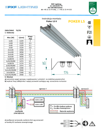 PXF Lighting ul. Jutrzenki 73 02-230 Warszawa +48 22 33 44 000, +48 22 33 44 033 Instrukcja montażu Poker LS II 230V/50HZ T5/T8 1. Gabaryty Moc [W] L[mm] Waga [kg] 3 3,5 3,1 3,6 6 7 6,2 7,2 3 3,5 3,1 3,6 6 7 6,2 7,2 1x36 1229 1x58 1529 2x36 1229 2x58 1529 2x1x36 2458 2x1x58 3058 2x2x36 2458 2x2x58 3058 1x28/54 1174 1x35/49/80 1474 2x28/54 1174 2x35/49/80 1474 2x1x28/54 2348 2x1x35/49/80 2948 2x2x28/54 2348 2x2x35/49/80 2948 2. Montaż a) ostrożnie wyjąć oprawę z opakowania i umieścić na stabilnej powierzchni b) wybrać fazę odbłyśnika i wpiąć przewód zasilający wg. oznaczenia na kostce c) podłączyć przewody zasilania linii wg oznaczeń w kostkę K3 zasilania zewnętrznego PXF Lighting ul. Jutrzenki 73 02-230 Warszawa +48 22 33 44 000, +48 22 33 44 033 d) montaż łączników i boczków zamykających (końcówek): - w pierwszą oprawę linii wsunąć klapę zamykającą i przykręcić od góry wkrętami - analogicznie wsunąć łączniki w oprawy, nałożyć maskownice połączenia opraw a następnie skręcić połączenie za pomocą ośmiu wkrętów - elektryczne połączenie między sąsiednimi oprawami realizowane jest za pomocą kostki męskiej i żeńskiej e) zamocowanie świetlówek: - świetlówki odpowiedniej mocy wsunąć do oprawy, po delikatnym docisku wcisnąć w oprawki - przekręcić świetlówki wzdłuż osi o 90° f) regulacja zawieszenia: - regulacja wysokości zawieszenie odbywa się poprzez przekręcanie uchwytów, które znajdują się na środku łączników liniowych i końcówek !! Rozstaw uchwytów do zawieszenia wynosi tyle ile długość oprawy do której są mocowane. Wszystkie łączniki i końcówki mus być podwieszone !! - wyważenie oprawy odbywa się poprzez przepięcie łańcuszka na sąsiednie oczko zębatki uchwytu 3. Postanowienia końcowe: Podłączenie opraw do sieci mogą wykonywać tylko osoby z odpowiednimi uprawnieniami. Dokonywanie jakichkolwiek czynności wewnątrz oprawy przy włączonym zasilaniu grozi porażeniem elektrycznym. Producent nie ponosi odpowiedzialności za wady wynikłe z niestosowania zaleceń niniejszej instrukcji Producent zastrzega sobie możliwość zmian konstrukcji produktu. Nie instalować oprawy w pomieszczeniach pozbawionych obiegu powietrza. Aby zachować bezpieczeństwo funkcjonowania oprawy, należy postępować zgodnie z instrukcją montażu. Zgodnie z przepisami ustawy z dnia 29 lipca 2005r. o zużytym sprzęcie elektrycznym i elektronicznym zabronione jest umieszczanie z innymi odpadami zużytego sprzętu oznakowanego symbolem przekreślonego kosza. Użytkownik, który zamierza pozbyć się produktu, jest obowiązany do oddania zużytego sprzętu elektrycznego lub elektronicznego do punktu zbierania zużytego sprzętu. Punkty zbierania prowadzone są między innymi przez sprzedawców hurtowych i detalicznych tego sprzętu, przez gminne jednostki organizacyjne prowadzące działalność z zakresie odbierania odpadów oraz organizacje odzysku. Powyższe obowiązki ustawowe wprowadzone zostały w celu ograniczenia ilości odpadów powstających ze zużytego sprzętu elektrycznego i elektronicznego oraz zapewnienia odpowiedniego poziomu zbierania, odzysku i recyklingu. Szczegóły ustawy znajdują się na stronie: http://www.gios.gov.pl
