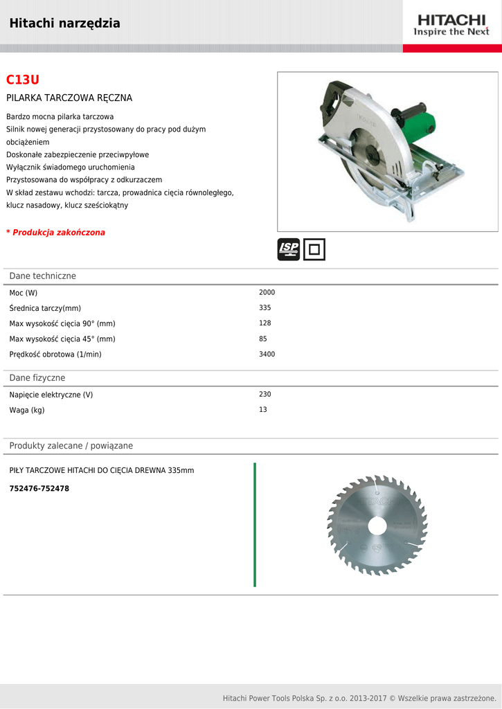 Hitachi narzędzia C13U PILARKA TARCZOWA RĘCZNA Bardzo mocna pilarka tarczowa Silnik nowej generacji przystosowany do pracy pod dużym obciążeniem Doskonałe zabezpieczenie przeciwpyłowe Wyłącznik świadomego uruchomienia Przystosowana do współpracy z odkurzaczem W skład zestawu wchodzi: tarcza, prowadnica cięcia równoległego, klucz nasadowy, klucz sześciokątny * Produkcja zakończona Dane techniczne Moc (W) 2000 Średnica tarczy(mm) 335 Max wysokość cięcia 90° (mm) 128 Max wysokość cięcia 45° (mm) 85 Prędkość obrotowa (1/min) 3400 Dane fizyczne Napięcie elektryczne (V) 230 Waga (kg) 13 Produkty zalecane / powiązane PIŁY TARCZOWE HITACHI DO CIĘCIA DREWNA 335mm 752476-752478 Hitachi Power Tools Polska Sp. z o.o. 2013-2017 © Wszelkie prawa zastrzeżone. Hitachi narzędzia PIŁY TARCZOWE HITACHI DO CIĘCIA ALUMINIUM 752419-752489 Hitachi Power Tools Polska Sp. z o.o. 2013-2017 © Wszelkie prawa zastrzeżone.