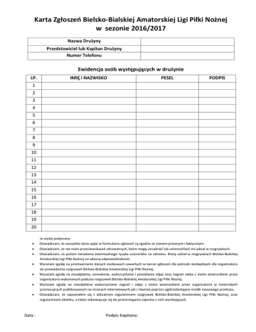 Karta Zgłoszeń Bielsko-Bialskiej Amatorskiej Ligi Piłki Nożnej w sezonie 2016/2017 Nazwa Drużyny Przedstawiciel lub Kapitan Drużyny Numer Telefonu Ewidencja osób występujących w drużynie LP. IMIĘ i NAZWISKO PESEL PODPIS 1 2 3 4 5 6 7 8 9 10 11 12 13 14 15 16 17 18 19 20 Data : Ja wyżej podpisany: Oświadczam, że wszystkie dane ujęte w formularzu zgłoszeń są zgodne ze stanem prawnym i faktycznym. Oświadczam, że nie mam przeciwwskazań zdrowotnych, które mogą utrudniać lub uniemożliwić mi udział w rozgrywkach. Oświadczam, że jestem świadomy ewentualnego ryzyka uszczerbku na zdrowiu. Biorę udział w rozgrywkach Bielsko-Bialskiej Amatorskiej Ligi Piłki Nożnej na własną odpowiedzialność. Wyrażam zgodę na przetwarzanie danych osobowych zawartych w karcie zgłoszeń dla potrzeb niezbędnych dla organizatora do prowadzenia rozgrywek Bielsko-Bialskiej Amatorskiej Ligi Piłki Nożnej. Wyrażam zgodę na nieodpłatne, utrwalenie, wykorzystanie i powielanie zdjęć oraz nagrań video z moim wizerunkiem przez organizatora wykonanych podczas rozgrywek Bielsko-Bialskiej Amatorskiej Ligi Piłki Nożnej. Wyrażam zgodę na nieodpłatne wykorzystanie nagrań i zdjęć z moim wizerunkiem przez organizatora w materiałach promocyjnych publikowanych na stronach internetowych jak i również poprzez ogólnodostępne środki masowego przekazu. Oświadczam, że zapoznałem się z aktualnym regulaminem rozgrywek Bielsko-Bialskiej Amatorskiej Ligi Piłki Nożnej, oraz regulaminem obiektu, a także zobowiązuje się do przestrzegania zapisów z nich wynikających. Podpis Kapitana: