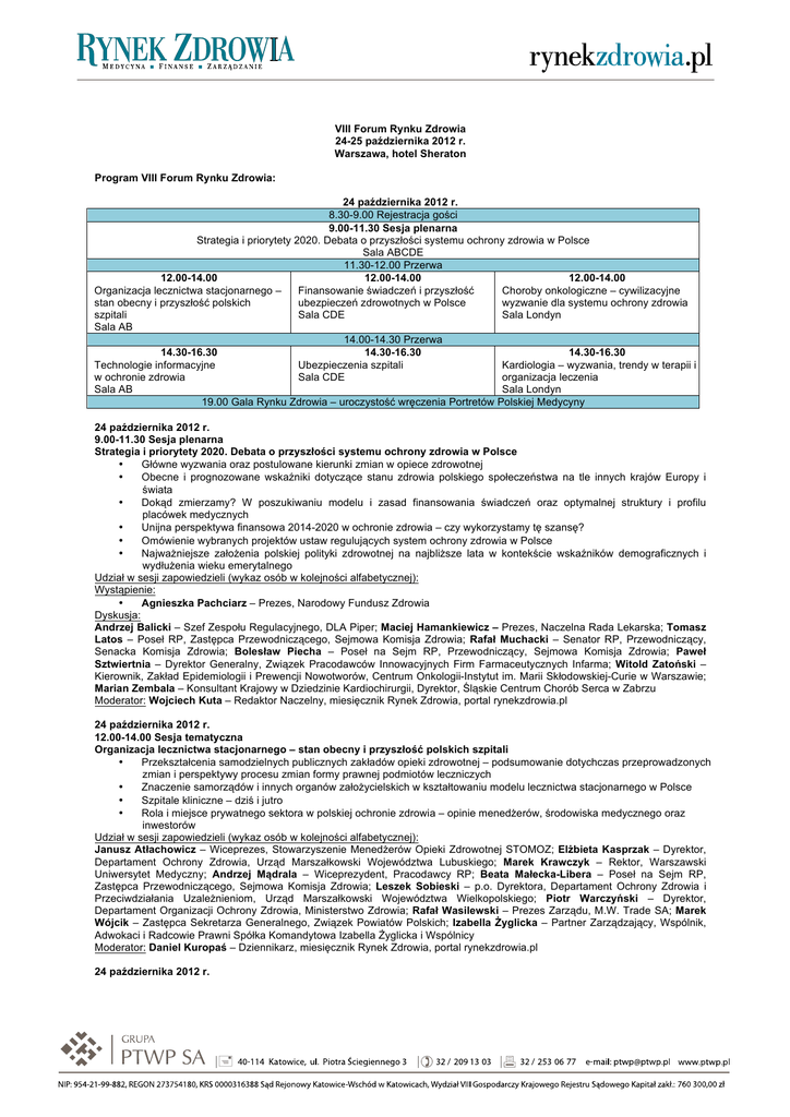VIII Forum Rynku Zdrowia 24-25 października 2012 r. Warszawa, hotel Sheraton Program VIII Forum Rynku Zdrowia: 24 października 2012 r. 8.30-9.00 Rejestracja gości 9.00-11.30 Sesja plenarna Strategia i priorytety 2020. Debata o przyszłości systemu ochrony zdrowia w Polsce Sala ABCDE 11.30-12.00 Przerwa 12.00-14.00 12.00-14.00 12.00-14.00 Organizacja lecznictwa stacjonarnego – Finansowanie świadczeń i przyszłość Choroby onkologiczne – cywilizacyjne stan obecny i przyszłość polskich ubezpieczeń zdrowotnych w Polsce wyzwanie dla systemu ochrony zdrowia szpitali Sala CDE Sala Londyn Sala AB 14.00-14.30 Przerwa 14.30-16.30 14.30-16.30 14.30-16.30 Technologie informacyjne Ubezpieczenia szpitali Kardiologia – wyzwania, trendy w terapii i w ochronie zdrowia Sala CDE organizacja leczenia Sala AB Sala Londyn 19.00 Gala Rynku Zdrowia – uroczystość wręczenia Portretów Polskiej Medycyny 24 października 2012 r. 9.00-11.30 Sesja plenarna Strategia i priorytety 2020. Debata o przyszłości systemu ochrony zdrowia w Polsce • Główne wyzwania oraz postulowane kierunki zmian w opiece zdrowotnej • Obecne i prognozowane wskaźniki dotyczące stanu zdrowia polskiego społeczeństwa na tle innych krajów Europy i świata • Dokąd zmierzamy? W poszukiwaniu modelu i zasad finansowania świadczeń oraz optymalnej struktury i profilu placówek medycznych • Unijna perspektywa finansowa 2014-2020 w ochronie zdrowia – czy wykorzystamy tę szansę? • Omówienie wybranych projektów ustaw regulujących system ochrony zdrowia w Polsce • Najważniejsze założenia polskiej polityki zdrowotnej na najbliższe lata w kontekście wskaźników demograficznych i wydłużenia wieku emerytalnego Udział w sesji zapowiedzieli (wykaz osób w kolejności alfabetycznej): Wystąpienie: • Agnieszka Pachciarz – Prezes, Narodowy Fundusz Zdrowia Dyskusja: Andrzej Balicki – Szef Zespołu Regulacyjnego, DLA Piper; Maciej Hamankiewicz – Prezes, Naczelna Rada Lekarska; Tomasz Latos – Poseł RP, Zastępca Przewodniczącego, Sejmowa Komisja Zdrowia; Rafał Muchacki – Senator RP, Przewodniczący, Senacka Komisja Zdrowia; Bolesław Piecha – Poseł na Sejm RP, Przewodniczący, Sejmowa Komisja Zdrowia; Paweł Sztwiertnia – Dyrektor Generalny, Związek Pracodawców Innowacyjnych Firm Farmaceutycznych Infarma; Witold Zatoński – Kierownik, Zakład Epidemiologii i Prewencji Nowotworów, Centrum Onkologii-Instytut im. Marii Skłodowskiej-Curie w Warszawie; Marian Zembala – Konsultant Krajowy w Dziedzinie Kardiochirurgii, Dyrektor, Śląskie Centrum Chorób Serca w Zabrzu Moderator: Wojciech Kuta – Redaktor Naczelny, miesięcznik Rynek Zdrowia, portal rynekzdrowia.pl 24 października 2012 r. 12.00-14.00 Sesja tematyczna Organizacja lecznictwa stacjonarnego – stan obecny i przyszłość polskich szpitali • Przekształcenia samodzielnych publicznych zakładów opieki zdrowotnej – podsumowanie dotychczas przeprowadzonych zmian i perspektywy procesu zmian formy prawnej podmiotów leczniczych • Znaczenie samorządów i innych organów założycielskich w kształtowaniu modelu lecznictwa stacjonarnego w Polsce • Szpitale kliniczne – dziś i jutro • Rola i miejsce prywatnego sektora w polskiej ochronie zdrowia – opinie menedżerów, środowiska medycznego oraz inwestorów Udział w sesji zapowiedzieli (wykaz osób w kolejności alfabetycznej): Janusz Atłachowicz – Wiceprezes, Stowarzyszenie Menedżerów Opieki Zdrowotnej STOMOZ; Elżbieta Kasprzak – Dyrektor, Departament Ochrony Zdrowia, Urząd Marszałkowski Województwa Lubuskiego; Marek Krawczyk – Rektor, Warszawski Uniwersytet Medyczny; Andrzej Mądrala – Wiceprezydent, Pracodawcy RP; Beata Małecka-Libera – Poseł na Sejm RP, Zastępca Przewodniczącego, Sejmowa Komisja Zdrowia; Leszek Sobieski – p.o. Dyrektora, Departament Ochrony Zdrowia i Przeciwdziałania Uzależnieniom, Urząd Marszałkowski Województwa Wielkopolskiego; Piotr Warczyński – Dyrektor, Departament Organizacji Ochrony Zdrowia, Ministerstwo Zdrowia; Rafał Wasilewski – Prezes Zarządu, M.W. Trade SA; Marek Wójcik – Zastępca Sekretarza Generalnego, Związek Powiatów Polskich; Izabella Żyglicka – Partner Zarządzający, Wspólnik, Adwokaci i Radcowie Prawni Spółka Komandytowa Izabella Żyglicka i Wspólnicy Moderator: Daniel Kuropaś – Dziennikarz, miesięcznik Rynek Zdrowia, portal rynekzdrowia.pl 24 października 2012 r. 12.00-14.00 Sesja tematyczna Finansowanie świadczeń i przyszłość ubezpieczeń zdrowotnych w Polsce • Sytuacja finansowa szpitali w kontekście ostatniego kontraktowania świadczeń przez Narodowy Fundusz Zdrowia • Obecna i przewidywana rola publicznego płatnika w systemie finansowania świadczeń opieki zdrowotnej • Dodatkowe ubezpieczenia zdrowotne – omówienie i ocena założeń projektu ustawy o dodatkowym ubezpieczeniu zdrowotnym; do jakiego modelu ubezpieczeń zmierzamy? • Transgraniczna opieka medyczna – zasady korzystania ze świadczeń opieki zdrowotnej za granicą oraz zwrot kosztów leczenia • Turystyka medyczna – w jakim stopniu promocja polskiej medycyny może wpłynąć na finanse naszych jednostek ochrony zdrowia Udział w sesji zapowiedzieli (wykaz osób w kolejności alfabetycznej): Wystąpienie: • Agnieszka Pachciarz – Prezes, Narodowy Fundusz Zdrowia Dyskusja: Marek Balicki – Dyrektor, Szpital Wolski im. dr Anny Gostyńskiej, Samodzielny Publiczny Zakład Opieki Zdrowotnej; Dorota M. Fal – Doradca Zarządu, Polska Izba Ubezpieczeń; Krystyna Grzenia – Dyrektor, Szpital Specjalistyczny Świętego Wojciecha, Samodzielny Publiczny Zakład Opieki Zdrowotnej w Gdańsku; Tomasz Kaniewski – Broker, Biuro Ubezpieczeń na Życie, EIB SA; Jarosław Kozera – Dyrektor Naczelny, Szpital Uniwersytecki nr 1 im. dr. Antoniego Jurasza w Bydgoszczy; Robert Mołdach – Ekspert ds. Ochrony Zdrowia, Pracodawcy RP; Adam Pustelnik – Ekspert w Dziedzinie Ubezpieczeń; Małgorzata S