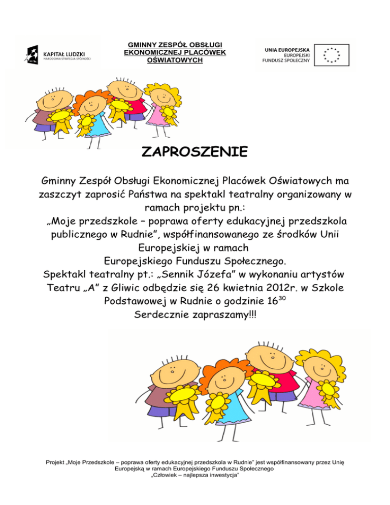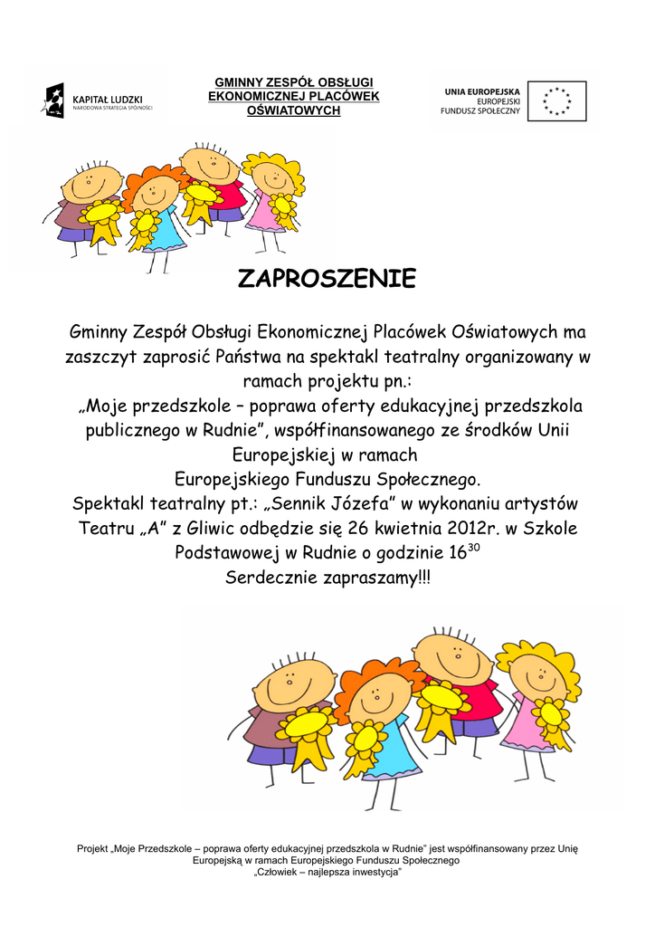 GMINNY ZESPÓŁ OBSŁUGI EKONOMICZNEJ PLACÓWEK OŚWIATOWYCH ZAPROSZENIE Gminny Zespół Obsługi Ekonomicznej Placówek Oświatowych ma zaszczyt zaprosić Państwa na spektakl teatralny organizowany w ramach projektu pn.: „Moje przedszkole – poprawa oferty edukacyjnej przedszkola publicznego w Rudnie”, współfinansowanego ze środków Unii Europejskiej w ramach Europejskiego Funduszu Społecznego. Spektakl teatralny pt.: „Sennik Józefa” w wykonaniu artystów Teatru „A” z Gliwic odbędzie się 26 kwietnia 2012r. w Szkole Podstawowej w Rudnie o godzinie 1630 Serdecznie zapraszamy!!! Projekt „Moje Przedszkole – poprawa oferty edukacyjnej przedszkola w Rudnie” jest współfinansowany przez Unię Europejską w ramach Europejskiego Funduszu Społecznego „Człowiek – najlepsza inwestycja”