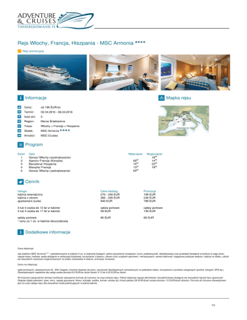 Rejs Włochy, Francja, Hiszpania - MSC Armonia Rejs promocyjny Informacje Cena: od 199 EUR/os Termin: 02.04.2016 - 06.04.2016 Ilość dni: 5 Region: Morze Śródziemne Trasa: Włochy > Francja > Hiszpania Statek: MSC Armonia Armator: MSC Cruises Mapka rejsu Program Dzień 1 2 3 4 5 Opis Genoa/ Włochy (wyokrętowanie) Ajaccio/ Francja (Korsyka) Barcelona/ Hiszpania Marsylia/ Francja Genoa/ Włochy (zaokrętowanie) Wpłynięcie 0800 1600 1300 0900 Wypłynięcie 1800 1400 2200 1900 Cennik Usługa kabina wewnętrzna kabina z oknem apartament (suite) Cena katalog. 279 - 249 EUR 369 - 339 EUR 949 EUR Promocja 199 EUR 249 EUR 799 EUR 3 lub 4 osoba do 12 lat w kabinie 3 lub 4 osoba do 17 lat w kabinie opłaty portowe 59 EUR opłaty portowe 139 EUR opłaty portowe * ceny za 1 os. w kabinie dwuosobowej 80 EUR 80 EUR Dodatkowe informacje Cena obejmuje: rejs statkiem MSC Armonia**** ,zakwaterowanie w kabinie 2 os. w wybranej kategorii, pełne wyżywienie (śniadanie, lunch, podwieczorek, obiadokolację oraz przekąski dostępne w bufecie w ciągu dnia) napoje kawa, herbata, woda dostępne w restauracji bufetowej, korzystanie z basenu, siłowni oraz urządzeń sportowo – rekreacyjnych, serwis kabinowy i bagażowy podczas wejścia i zejścia ze statku, udział we wszystkich imprezach organizowanych na statku (widowiska w teatrze, animacje, koncerty). Cena nie obejmuje: opłat portowych, ubezpieczenia KL, NW i bagażu, kosztów dojazdu do portu, wycieczek fakultatywnych zamawianych na pokładzie statku, korzystania z punktów usługowych (pralnia, fotograf, SPA itp.) Obowiązkowych napiwków dla załogi osoba dorosła 8,5 EUR/os./dzień dzieci 3-13 lat 4,25 EUR/os./dzień. All Inclusive (opcjonalnie) Istnieje możliwość wykupienia formuły all inclusive na czas trwania rejsu. Pakiet obejmuje napoje alkoholowe i bezalkoholowe dostępne we wszystkich barach bez ograniczeń (Napoje objęte pakietem: piwo, wino, napoje gazowane, likiery, koktajle, wódka, koniak, whisky itp.) Koszt pakietu 26 EUR/dzień osoba dorosła i 12 EUR/dzień dziecko. Formuła all inclusive obowiązkowa jest na czas całego rejsu dla wszystkich osób podróżujących w jednej kabinie. 1/2 2/2 Powered by TCPDF (www.tcpdf.org)
