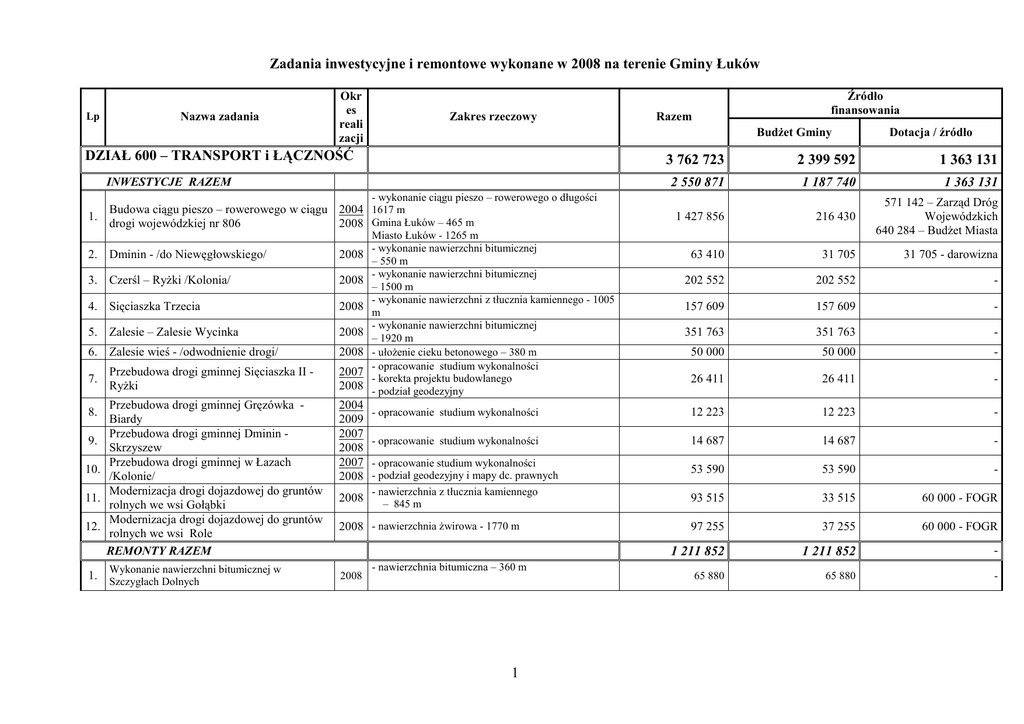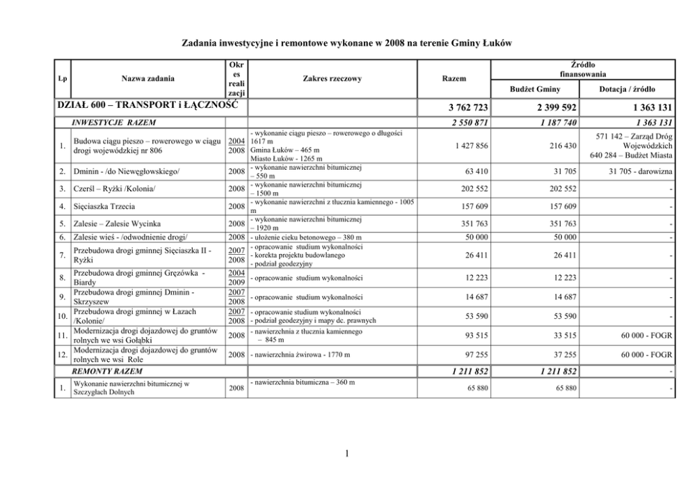Zadania inwestycyjne i remontowe wykonane w 2008 na terenie Gminy Łuków Lp Nazwa zadania Okr es reali zacji Zakres rzeczowy 2. Dminin - /do Niewęgłowskiego/ 2008 3. Czerśl – RyŜki /Kolonia/ 2008 4. Sięciaszka Trzecia 2008 5. Zalesie – Zalesie Wycinka 2008 6. Zalesie wieś - /odwodnienie drogi/ 2008 7. 8. 9. 10. 11. 12. Przebudowa drogi gminnej Sięciaszka II RyŜki 2007 2008 Przebudowa drogi gminnej Gręzówka Biardy Przebudowa drogi gminnej Dminin Skrzyszew Przebudowa drogi gminnej w Łazach /Kolonie/ Modernizacja drogi dojazdowej do gruntów rolnych we wsi Gołąbki Modernizacja drogi dojazdowej do gruntów rolnych we wsi Role REMONTY RAZEM 2004 2009 2007 2008 2007 2008 Wykonanie nawierzchni bitumicznej w 1. Szczygłach Dolnych 2 399 592 1 363 131 2 550 871 1 187 740 1 363 131 1 427 856 216 430 571 142 – Zarząd Dróg Wojewódzkich 640 284 – BudŜet Miasta 63 410 31 705 31 705 - darowizna 202 552 202 552 - 157 609 157 609 - 351 763 351 763 - 50 000 50 000 - 26 411 26 411 - - opracowanie studium wykonalności 12 223 12 223 - - opracowanie studium wykonalności 14 687 14 687 - 53 590 53 590 - 93 515 33 515 60 000 - FOGR 97 255 37 255 60 000 - FOGR 1 211 852 1 211 852 - 65 880 65 880 - - wykonanie ciągu pieszo – rowerowego o długości 1617 m Gmina Łuków – 465 m Miasto Łuków - 1265 m - wykonanie nawierzchni bitumicznej – 550 m - wykonanie nawierzchni bitumicznej – 1500 m - wykonanie nawierzchni z tłucznia kamiennego - 1005 m - wykonanie nawierzchni bitumicznej – 1920 m - ułoŜenie cieku betonowego – 380 m - opracowanie studium wykonalności - korekta projektu budowlanego - podział geodezyjny - opracowanie studium wykonalności - podział geodezyjny i mapy dc. prawnych - nawierzchnia z tłucznia kamiennego 2008 – 845 m 2008 - nawierzchnia Ŝwirowa - 1770 m 2008 Dotacja / źródło 3 762 723 INWESTYCJE RAZEM Budowa ciągu pieszo – rowerowego w ciągu 2004 drogi wojewódzkiej nr 806 2008 Razem BudŜet Gminy DZIAŁ 600 – TRANSPORT i ŁĄCZNOŚĆ 1. Źródło finansowania - nawierzchnia bitumiczna – 360 m 1 2. Remont wyznaczonych odcinków dróg Ŝwirem: Remont wyznaczonych odcinków dróg 3. tłuczniem kamiennym: Remont wyznaczonych 2008 odcinków dróg 4. tłuczniem i Ŝwirem: 5. 6. Remont wyznaczonych tłuczniem i Ŝwirem: Zakup usług pozostałych 2008 2008 odcinków dróg 2008 2008 - Dminin – 470 m - Rzymy Las – 100 m - Rzymy Rzymki – 500 m - Gręzówka – 180 m - Gręzówka – 380 m - Aleksandrów – 750 m - Czerśl – 320 m - StrzyŜew – 710 m - Szczygły Górne – 200 m - Aleksandrów – 250 m - Suchocin – 780 m - Zarzecz Łukowski – 600 m - Jeziory – 380 m - Krynka – 280 m - Aleksandrów – 150 m - Łazy – 350 m - Suleje – 620 m - Świdry – 300 m - Gołąbki – 200 m - Krynka - 250 m - Podgaj – 200 m - śdŜary – 400 m - Aleksandrów, Suchocin – 450 m - Role – 450 m - Role – Borki – 1000 m - StrzyŜew – 1800 m - Świdry – 250 m - Jeziory – 130 m - Role – 300 m - RyŜki Osiedle – 500 m - Wagram – 150 m - profilowanie i równanie dróg - remonty cząstkowe dróg gminnych ustawienie barier przeciwśnieŜnych energochłonnych - wznowienie granic dróg gminnych - profilowanie poboczy - wykonanie wjazdu drogi gruntowej w Sięciaszce Drugiej - odwodnienie drogi w Łazach i Krynce - remont zjazdu w Świdrach - odwodnienie drogi w Sięciaszce Trzeciej - odwodnienie drogi doj. w Turzych Rogach - naprawa drogi gruntowej w Czerśl 2 295 677 295 677 298 641 298 641 - 200 464 200 464 - 51 142 51 142 - 263 265 263 265 - i 7. Zakup materiałów i wyposaŜenia - zakup przystanków autobusowych Gręzówka, Dminin, Rzymy Rzymki, Gołąbki, Łazy Role, RyŜki 2008 - zakup materiałów do wykonania płyt betonowych pod przystanki 36 783 36 783 - 852778 522 068 330 710 87 977 87 977 - 102 606 21 518 81 088 BOŚ 91 887 23 320 68 567 BOŚ 99 183 20 801 78 382 BOŚ 129 919 27 246 102 673 BOŚ 22 852 22 852 - 75 152 75 152 - 25 738 25 738 - 14 640 14 640 - 14 146 14 146 - 2008 - zmontowano 14 sztuk UZT 99 238 99 238 - 2008 - program rozbudowy 62 200 62 200 - 27 240 27 240 - 162 034 162 034 - 1. - mapy do celów projektowych - dokumentacja budowlana na: Uzbrojenie terenu inwestycyjnego w Łazach 2008 - budowę drogi wewnętrznej - budowę sieci wod.-kan. - budowę oświetlenia ulicznego 83 871 83 871 - 2. Zakup gruntu pod boisko w śdŜarach, zamiana działek w Czerśli 18 163 18 163 - DZIAŁ 010 - ROLNICTWO i ŁOWIECTWO 1. Wykonanie wiercenia studziennego na ujęciu - dokumentacja techniczna 2008 - roboty budowlane wody w Sięciaszce Drugiej 2. Rozbudowa sieci wodociąg. w Gołąbkach 2008 3. Rozbudowa sieci wodociąg. w Zalesiu 2008 4. Połączenie sieci wodociąg. w Aleksandrowie 2008 5. Rozbudowa sieci wodociąg. w Czerśli 2008 6. Rozbudowa sieci wodociąg. w Gołaszynie 2008 7. Rozbudowa sieci wodociąg. w Ławkach 2008 (kierunek Zimna Woda) 8. Połączenie sieci wodociąg. Świdry - RyŜki 9. 10. 11. 12. 13. Połączenie sieci wodociąg. Gręzówka Ławki Połączenie sieci wodociąg. Gołaszyn – Wólka Świątkowa Rozbudowa siecie kanalizacyjnych w RyŜkach, Czerśli, Sięciaszce II i Łazach Koncepcja gospodarki wodno – ściekowej w Gminie Łuków Budowa przyzagrodowych oczyszczalni ścieków w Gminie Łuków 2008 2008 2008 - dokumentacja budowlana - 1480 mb sieci - dokumentacja budowlana - 1392 mb sieci - dokumentacja budowlana - 998 mb sieci - dokumentacja budowlana - 1162 mb sieci - dokumentacja budowlana - 327,5 mb sieci - dokumentacja budowlana - 1085 mb sieci - dokumentacja budowlana - 314 mb sieci (tylko na osiedlu w Świdrach) - dokumentacja budowlana - część dokumentacji budowlanej - mapy do celów projektowych 2008 - część dokumentacji budowlanej DZIAŁ 700 – GOSPODARKA MIESZKANIOWA 2008 - 3 3. Zakup nieruchomości w miejscowościach Krynka i Dąbie 2008 - 60 000 60 000 2 307 066 1 857 066 450 000 76 860 76 860 - 1 053 220 603 220 450 000– poŜyczka WFOŚ 1 094 386 1 094 386 - 2008 -