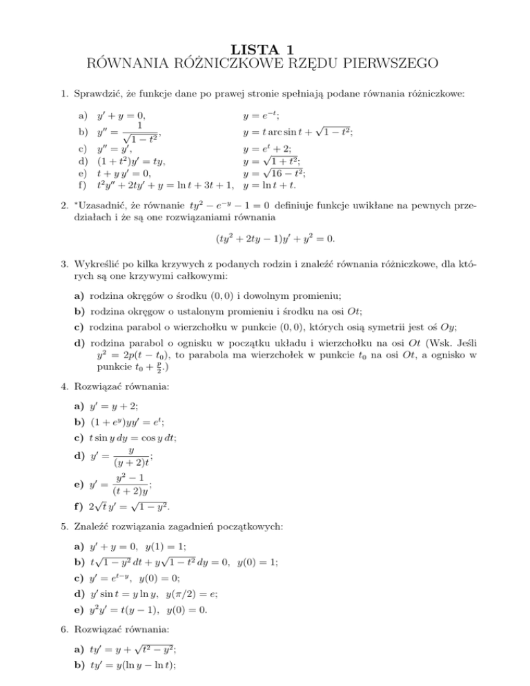 LISTA 1 RÓWNANIA RÓŻNICZKOWE RZĘDU PIERWSZEGO