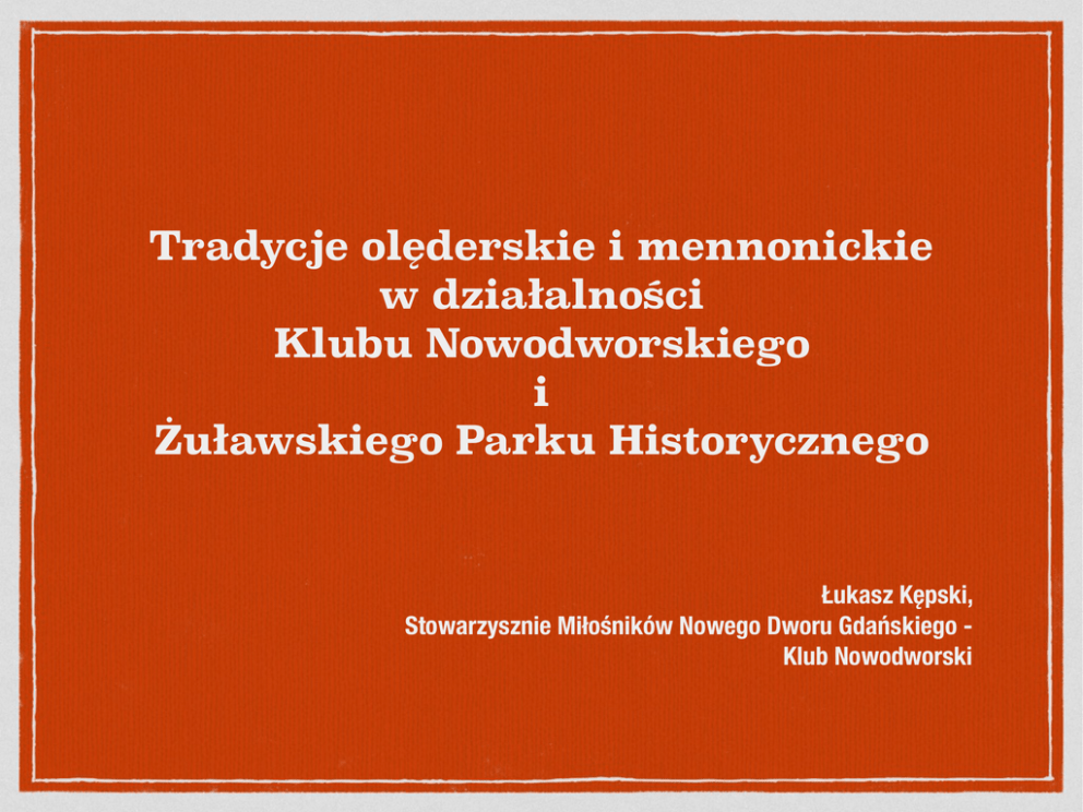 Tradycje olęderskie i mennonickie w działalności Klubu Nowodworskiego i Żuławskiego Parku Historycznego Łukasz Kępski, Stowarzysznie Miłośników Nowego Dworu Gdańskiego Klub Nowodworski Klub Nowodworski Powstał w 1991 r. Główne cele: ochrona dziedzictwa kulturowego i naturalnego delty Wisły Ostatenie działania: Żuławy. Lubię to!, DeltaWolntariat oraz najważniejszy projekt prowadzony od 1994 r. Żuławski Park Historyczny Muzeum Żuławskie „Dlaczego mennonici, dlaczego my?” Mennonici i olędrzy w naszych działaniach Wystawy i popularyzacja Na polskim polderze i Cmentarz Jedenastu Wsi w Cyganku/ Żelichowie, Partner przy wystawie „Na szlaku mennonitów” dla ŻOKiS w Cedrach Wielkich (2007 r.), Partner przy wystawie „Mennonici na Żuławach. Ocalone dziedzictwo” (2008 r.), Wystawy i popularyzacja Działalność wydawnicza i publicystyczna ( G. Gola, M. Opitz i Ł. Kępski) Wykłady w kraju i zagranicą o tematyce mennonickiej ( Kafejka Historyczna, UTW i Freundschaftsverein Tczew Witten e.V.) Film „Z dziejów Polskiej Tolerancji - Mennonici na Żuławach” (2014 r.) EuMen.net Wspólnie możemy więcej Działania edukacyjne MultiRegion i wątki mennonickie, Lekcje muzealne, Współpraca ze szkołami (Zespół Szkół nr 1 i 2 w Nowym Dworze Gdańskim, Zespół Szkół w Kmiecinie). Ochrona dziedzctwa Szlak mennonitów, Lapidarium Cmentarz Jedenastu Wsi w Cyganku/Żelichowie, Konserwacja zabytkowych płyt. Współpraca międzynarodowa Międzynarodowe Spotkania Mennonitów na Żuławach (następne 22 - 24 lipca 2017 r.) EuMen.net projekt przyszłościowy Polska USA - Niemcy - Holandia „Jest dobrze, ale mogłoby być lepiej.”