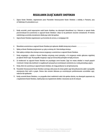 REGULAMIN ZAJĘĆ KARATE SHOTOKAN 1. Zajęcia Karate Shotokan, organizowane przez Poznańskie Stowarzyszenie Karate Shotokan z siedzibą w Poznaniu, przy ul. Radziwoja 24, prowadzone są w: ……………………………………………………………………………………………………… 2. Każdy uczestnik, przed rozpoczęciem nauki karate shotokan, ma obowiązek skonsultować się z lekarzem w sprawie braku przeciwwskazań do uczestnictwa w zajęciach Karate Shotokan i złożyć na tej podstawie stosowne oświadczenie. W imieniu małoletniego uczestnika oświadczenie składa jego rodzic lub opiekun. 3. Zajęcia Karate Shotokan organizowane są od września do czerwca, w następujące dni: ……………………………………………………………………………………………………… 4. Warunkiem uczestnictwa w zajęciach Karate Shotokan jest opłacenie składki miesięcznej w kwocie …………… 5. Opłaty za Karate Shotokan przyjmowane są z góry za miesiąc do 5 dnia każdego miesiąca. 6. Brak wpłaty za kolejne dwa miesiące oznacza rezygnację z uczestnictwa w zajęciach Karate Shotokan. 7. Osoby rezygnujące z udziału w Karate Shotokan otrzymują zwrot pieniędzy, o ile rezygnacja została zgłoszona najpóźniej po upływie dwóch zajęć. W przypadku rezygnacji z zajęć po trzeciej lekcji pieniądze nie będą zwracane. 8. Za nieobecność na zajęciach Karate Shotokan nie przysługuje zwrot kosztów. Zajęć nie można odrabiać w innych grupach i terminach. Istnieje taka możliwość w wyjątkowych sytuacjach po wcześniejszym umówieniu się z osobą prowadzącą zajęcia. 9. Osoby, które nie uczestniczą w zajęciach karate shotokan, nie mogą przebywać na sali gimnastycznej. 10. Poznańskie Stowarzyszenie Karate Shotokan zastrzega sobie prawo do zmian godzin zajęć lub podwyższenia opłat w przypadku zmniejszenia ilości osób w grupie. Zmiana taka zostanie dokonana po wcześniejszym poinformowaniu uczestników zajęć, rodziców lub opiekunów. 11. Każdy uczestnik Karate Shotokan, a w przypadku dzieci małoletnich rodzic lub opiekun dziecka, ma obowiązek zapoznania się z regulaminem Karate Shotokan, etykietą dojo oraz regulaminem obiektu i stosowania się do ich wskazań. Poznańskie Stowarzyszenie Karate Shotokan, © Podmiot autorski 2011 www.karate-shotokan.com.pl, [email protected]