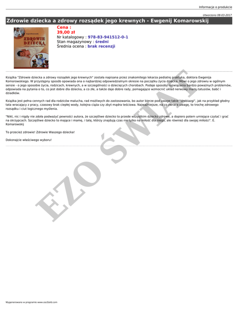 Informacje o produkcie Utworzono 08-03-2017 Zdrowie dziecka a zdrowy rozsądek jego krewnych - Ewgenij Komarowskij Cena : 39,00 zł Nr katalogowy : 978-83-941512-0-1 Stan magazynowy : średni Średnia ocena : brak recenzji IA T Książka "Zdrowie dziecka a zdrowy rozsądek jego krewnych" została napisana przez znakomitego lekarza pediatrę praktyka, doktora Ewgenija Komorowskiego. W przystępny sposób opowiada ona o najbardziej odpowiedzialnym okresie na początku życia dziecka. Mówi o jego zdrowiu w ogólnym sensie - o jego sposobie życia, rodzicach, krewnych, a w szczególności o dziecięcych chorobach. Podaje sposoby rozwiązania bardzo poważnych problemów, odpowiada na pytania o to, co jest dobre dla dziecka, a co złe, a także daje dobre rady, pomagające wzmocnić układ nerwowy mam, tatusiów, babć i dziadków. Książka jest pełna cennych rad dla rodziców malucha, rad możliwych do zastosowania, bo autor bierze pod uwagę takie "drobiazgi", jak na przykład głodny tata wracający z pracy, czasowy brak ciepłej wody, kolejna ciąża czy zbyt mądra teściowa. Najważniejsze, na co zwraca uwagę, to trochę zdrowego rozsądku i ciut logicznego myślenia. To przecież zdrowie! Zdrowie Waszego dziecka! EZ O Dokonajcie właściwego wyboru! ŚW "Nikt, nic i nigdy nie zdoła podważyć pewności autora, że szczęśliwe dziecko to przede wszystkim dziecko zdrowe, a dopiero potem umiejące czytać i grać na skrzypcach. Szczęśliwe dziecko to mające i mamę, i tatę, którzy znajdują czas nie tylko na miłość dla niego, ale również dla swojej miłości". E. Komarowskij Wygenerowano w programie www.oscGold.com