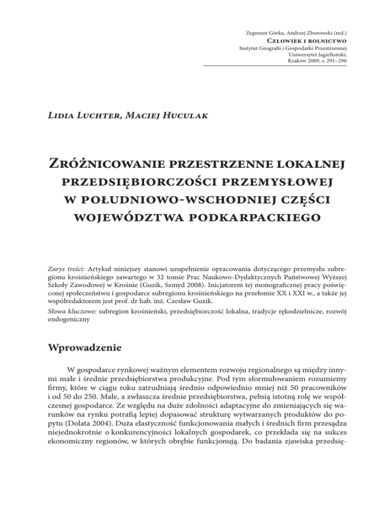 Zygmunt Górka, Andrzej Zborowski (red.) Człowiek i rolnictwo Instytut Geografii i Gospodarki Przestrzennej Uniwersytet Jagielloński, Kraków 2009, s. 291–296 Lidia Luchter, Maciej Huculak Zróżnicowanie przestrzenne lokalnej przedsiębiorczości przemysłowej w południowo-wschodniej części województwa podkarpackiego Zarys treści: Artykuł niniejszy stanowi uzupełnienie opracowania dotyczącego przemysłu subregionu krośnieńskiego zawartego w 32 tomie Prac Naukowo-Dydaktycznych Państwowej Wyższej Szkoły Zawodowej w Krośnie (Guzik, Szmyd 2008). Inicjatorem tej monograficznej pracy poświęconej społeczeństwu i gospodarce subregionu krośnieńskiego na przełomie XX i XXI w., a także jej współredaktorem jest prof. dr hab. inż. Czesław Guzik. Słowa kluczowe: subregion krośnieński, przedsiębiorczość lokalna, tradycje rękodzielnicze, rozwój endogeniczny Wprowadzenie W gospodarce rynkowej ważnym elementem rozwoju regionalnego są między innymi małe i średnie przedsiębiorstwa produkcyjne. Pod tym sformułowaniem rozumiemy firmy, które w ciągu roku zatrudniają średnio odpowiednio mniej niż 50 pracowników i od 50 do 250. Małe, a zwłaszcza średnie przedsiębiorstwa, pełnią istotną rolę we współczesnej gospodarce. Ze względu na duże zdolności adaptacyjne do zmieniających się warunków na rynku potrafią lepiej dopasować strukturę wytwarzanych produktów do popytu (Dolata 2004). Duża elastyczność funkcjonowania małych i średnich firm przesądza niejednokrotnie o konkurencyjności lokalnych gospodarek, co przekłada się na sukces ekonomiczny regionów, w których obrębie funkcjonują. Do badania zjawiska przedsię- Lidia Luchter, Maciej Huculak biorczości produkcyjnej najczęściej stosowanym miernikiem jest liczba firm zarejestrowanych w systemie Regon. Niestety, nie wszystkie firmy, które uzyskały numer identyfikacyjny w tym systemie, prowadzą działalność produkcyjną, co niewątpliwie ma wpływ na wiarygodność uzyskanych tym sposobem danych statystycznych i prowadzonego na ich podstawie wnioskowania. Duże zmiany pojawiają się zwłaszcza w grupie firm handlowych i turystycznych, w mniejszym zakresie procesowi rotacji podlegają firmy przemysłowe (Sobala-Gwosdz 2005). Wskaźnik przedsiębiorczości skonstruowano, odnosząc liczbę firm przemysłowych do liczby mieszkańców w wieku produkcyjnym. Analiza przedsiębiorczości zmierza między innymi do odpowiedzi na pytanie, gdzie znajdują się mieszkańcy gotowi ponieść ryzyko inwestycyjne. Wskaźnik ten ma dodatkową ważną nośność informacyjną, ponieważ działalność przemysłowa generuje jeden z najsilniejszych efektów mnożnikowych, przyczyniając się do wzrostu zamożności społeczeństwa (Domański 2001). Struktura przestrzenna lokalnej przedsiębiorczości przemysłowej i jej zmiany w latach 1994–2004 Przedsiębiorczość przemysłowa subregionu krośnieńskiego jest skrajnie zróżnicowania zarówno w obszarach miejskich, jak i wiejskich. W miastach powiatowych osiągnęła ona poziom w granicach 10,4–16,2 firm/1000 mieszkańców, z wyjątkiem Leska, gdzie wartość analizowanego wskaźnika wyniosła 18,8/1000 mieszkańców (ryc. 1). Najwyższą przedsiębiorczość odnotowano w małych miastach: Rymanowie (22,1 firm/1000 mieszkańców), Dukli (21,2) czy Bieczu (16,5), co jest efektem przedsiębiorczości endogenicznej, nawiązującej do długotrwałych tradycji rzemiosła produkcyjnego na tym obszarze. Największą dynamikę zjawiska w okresie 1995–2004 wykazywały miasta Lesko, Zagórz i Biecz (ryc. 1). Stopień rozwoju małych i średnich firm w obszarach wiejskich jest również wysoce nierównomierny. Największą aktywnością w tym zakresie, ponadprzeciętną dla analizowanego subregionu oraz województwa podkarpackiego, charakteryzowały się gminy powiatu bieszczadzkiego i leskiego, z wyjątkiem gmin Czarna i Solina (ryc. 2). Tworzą one zwarty przestrzennie obszar, położony w południowo-wschodniej części subregionu krośnieńskiego. Drugie skupienie w przestrzeni gmin wiejskich o ponadprzeciętnych wartościach wskaźnika obejmuje środkową część powiatu jasielskiego z dominacją w Osieku Jasielskiem, środkową i północną część powiatu krośnieńskiego z maksymalnymi wartościami wskaźnika w gminach Miejsce Piastowe, Krościenko Wyżne oraz graniczące z nimi od wschodu gminy powiatu brzozowskiego na czele z gminą Jasienica Rosielna. Te dwa wyraźne skupienia obszarów o wysokiej aktywności gospodarczej oddzielają gminy powiatu sanockiego, gdzie wskaźniki przedsiębiorczości produkcyjnej należą do najniższych w subregionie, z wyjątkiem gminy Bukowsko (ryc. 2). Szczególnie wysoka koncentracja przedsiębiorczości w gminach sąsiadujących z Krosnem i Jasłem ma charakter spin-off (Jakubowicz 2003, Moń 2005). Wykształceni pracownicy z długoletnim doświadczeniem 292 Zróżnicowanie przestrzenne lokalnej przedsiębiorczości przemysłowej... Ryc. 1. Przedsiębiorczość przemysłowa w miastach subregionu krośnieńskiego 2004 r. i jej dynamika w latach 1995–2004 Fig. 1. Industrial activity in the cities of the Krosno Subregion in 2004 ands its dynamics in the 1995–2004 period Źródło: opracowanie M. Huculak na podstawie Banku Danych Regionalnych, GUS. zawodowym opuścili na początku lat 90. duże państwowe zakłady, huty szkła, zakłady przetwórstwa drzewnego, między innymi z powodu zwolnień grupowych. Nabyte umiejętności wykorzystali zaś we własnych firmach, których założenie stało się możliwe w warunkach gospodarki rynkowej (Adamus, Luchter 1995). Charakterystyczna wysoka przedsiębiorczość występująca w gminach powiatu bieszczadzkiego i leskiego wynika w istotnym zakresie z aktywności endogenicznej, nawiązującej do długoletnich tradycji rzemiosła drzewnego, metalowego, które nie zaginęły pomimo dotkliwych represji związanych z wysiedleniem miejscowej ludności w ramach akcj
