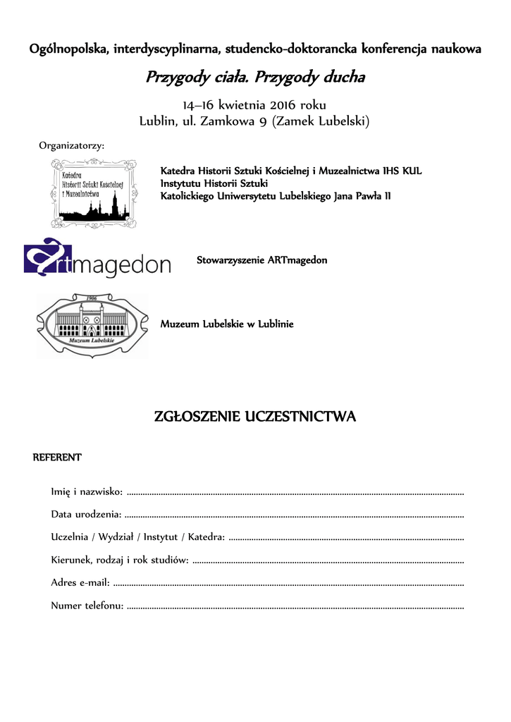 Ogólnopolska, interdyscyplinarna, studencko-doktorancka konferencja naukowa Przygody ciała. Przygody ducha 14–16 kwietnia 2016 roku Lublin, ul. Zamkowa 9 (Zamek Lubelski) Organizatorzy: Katedra Historii Sztuki Kościelnej i Muzealnictwa IHS KUL Instytutu Historii Sztuki Katolickiego Uniwersytetu Lubelskiego Jana Pawła II Stowarzyszenie ARTmagedon Muzeum Lubelskie w Lublinie ZGŁOSZENIE UCZESTNICTWA REFERENT Imię i nazwisko: ..................................................................................................................................................... Data urodzenia: ...................................................................................................................................................... Uczelnia / Wydział / Instytut / Katedra: ........................................................................................................ Kierunek, rodzaj i rok studiów: ........................................................................................................................ Adres e-mail: ........................................................................................................................................................... Numer telefonu: ..................................................................................................................................................... REFERAT Temat referatu: Ramy czasowe omawianego zagadnienia: Abstrakt (do 2000 znaków): Bibliografia: Formularz i wszelkie pytana dotyczące konferencji prosimy wysłać na adres: [email protected] najpóźniej do 20 stycznia 2016 roku. Do 31 stycznia poinformujemy, czyje referaty zostały zakwalifikowane do przedstawienia podczas konferencji. Wkrótce też prześlemy wstępny szczegółowy program. Opłata konferencyjna wynosi 80 zł. Czas wystąpienia nie może przekraczać 20 minut. Najlepsze referaty zostaną opublikowane w zbiorowej monografii. Plik z tekstem do druku, wraz ze skanem recenzji pracownika naukowego w stopniu co najmniej doktora, z podaniem jego afiliacji, będzie można przysłać do 15 czerwca 2016 roku. Decyzje w sprawie publikacji zostaną podjęte i przekazane Państwu do 30 czerwca. Tekst do druku może mieć do 30000 znaków ze spacjami. Jeżeli nie zaistnieją żadne nieprzewidywalne dziś okoliczności, zbiorowa monografia, w której opublikowane zostaną Państwa artykuły, ukaże się jeszcze w 2016 roku. Komitet organizacyjny: dr hab. Bożena Kuklińska, prof. KUL, mgr Marta Gudowska, mgr Arkadiusz Gudowski, Magdalena Kowalska, mgr Olga Pikul, mgr Justyna Woźniak, Irena Zieniewicz, mgr Magdalena Zieniewicz.