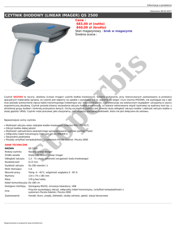 Informacje o produkcie Utworzono 08-03-2017 CZYTNIK DIODOWY (LINEAR IMAGER) QS 2500 Cena : 683,00 zł (netto) 840,09 zł (brutto) bi s Stan magazynowy : brak w magazynie Średnia ocena : st op er Czytnik QS2500 to ręczny, diodowy (Linear Imager) czytnik kodów kreskowych. Solidne wykonanie, przy równoczesnym zastosowaniu w produkcji specjalnych materiałów sprawia, że czytnik jest odporny na upadek z wysokości 1,5 m, odporny na wilgoć i kurz (norma IP42DW), nie wyślizguje się z ręki oraz posiada wzmocnienie złącza kabla transmisyjnego (niełamiące się i nieprzecierające). Charakteryzuje się estetycznym wyglądem i przyjazną w użyciu ergonomiczną obudową. Czytnik posiada klawisz wyzwalania odczytu kodów kreskowych, co ułatwia nakierowanie wiązki laserowej na wybrany kod (np. z określonej grupy kodów) i kontrolę przesyłania danych. Cechą szczególną czytnika jest również duża odległość odczytu kodów i zdolność odczytu kodów o dużej gęstości (RSS). Czytnik może pracować jako stacjonarny, jeśli użyjemy specjalnej podstawki, która nie jest dołączana do zestawu. Najważniejsze cechy czytnika ● ● ● ● ● ● Możliwość odczytu wielu rodzajów kodów kreskowych (również RSS i PDF417) Odczyt kodów słabej jakości Możliwość uaktualniania wewnętrznego oprogramowania czytnika (pamięć Flash) Odłączalny kabel transmisyjny (taki sam jak do QS6000+) Opcjonalna podstawka Posiada certyfikat kompatybilności z systemem Poczta Gdańsk i Poczta 2000 DANE TECHNICZNE NAZWA QS 2500 Rodzaj czytnika Ręczny, Linear Imager Źródło światła Diody LED 660nm Linear Imager Odległość odczytu 1,3 - 71 cm (w zależności od gęstości kodu kreskowego) Rozdzielczość 0,13 mm Szybkość odczytu Do 200 skanów / s Wzór skanujący n.d. Warunki pracy Temp. 0 - 45°C, wilgotność względna 5 - 95 % Wymiary 114 x 74 x 185 mm Masa 179 g bez kabla Kabel komunikacyjny Do 180 cm Dostępne interfejsy Szeregowy RS232, emulacja klawiatury, USB Inne Przycisk wyzwalający odczyt, odłączalny kabel transmisyjny, certyfikat kompatybilności z systemem Poczta Gdańsk i Poczta 2000 Zastosowanie Handel, biuro, urzędy, biblioteki, służba zdrowia, apteki, stacje benzynowe Wygenerowano w programie www.oscGold.com