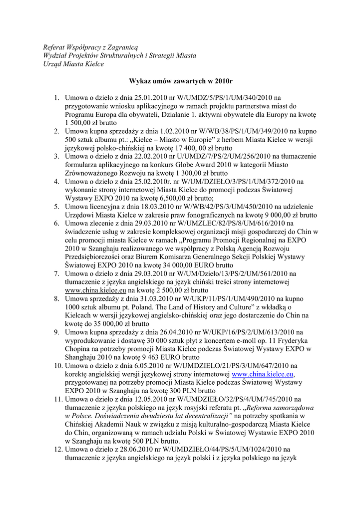 Referat Współpracy z Zagranicą Wydział Projektów Strukturalnych i Strategii Miasta Urząd Miasta Kielce Wykaz umów zawartych w 2010r 1. Umowa o dzieło z dnia 25.01.2010 nr W/UMDZ/5/PS/1/UM/340/2010 na przygotowanie wniosku aplikacyjnego w ramach projektu partnerstwa miast do Programu Europa dla obywateli, Działanie 1. aktywni obywatele dla Europy na kwotę 1 500,00 zł brutto 2. Umowa kupna sprzedaży z dnia 1.02.2010 nr W/WB/38/PS/1/UM/349/2010 na kupno 500 sztuk albumu pt.: „Kielce – Miasto w Europie” z herbem Miasta Kielce w wersji językowej polsko-chińskiej na kwotę 17 400, 00 zł brutto 3. Umowa o dzieło z dnia 22.02.2010 nr U/UMDZ/7/PS/2/UM/256/2010 na tłumaczenie formularza aplikacyjnego na konkurs Globe Award 2010 w kategorii Miasto Zrównoważonego Rozwoju na kwotę 1 300,00 zł brutto 4. Umowa o dzieło z dnia 25.02.2010r. nr W/UM/DZIEŁO/3/PS/1/UM/372/2010 na wykonanie strony internetowej Miasta Kielce do promocji podczas Światowej Wystawy EXPO 2010 na kwotę 6,500,00 zł brutto; 5. Umowa licencyjna z dnia 18.03.2010 nr W/WB/42/PS/3/UM/450/2010 na udzielenie Urzędowi Miasta Kielce w zakresie praw fonograficznych na kwotę 9 000,00 zł brutto 6. Umowa zlecenie z dnia 29.03.2010 nr W/UMZLEC/82/PS/8/UM/616/2010 na świadczenie usług w zakresie kompleksowej organizacji misji gospodarczej do Chin w celu promocji miasta Kielce w ramach „Programu Promocji Regionalnej na EXPO 2010 w Szanghaju realizowanego we współpracy z Polską Agencją Rozwoju Przedsiębiorczości oraz Biurem Komisarza Generalnego Sekcji Polskiej Wystawy Światowej EXPO 2010 na kwotę 34 000,00 EURO brutto 7. Umowa o dzieło z dnia 29.03.2010 nr W/UM/Dzieło/13/PS/2/UM/561/2010 na tłumaczenie z języka angielskiego na język chiński treści strony internetowej www.china.kielce.eu na kwotę 2 500,00 zł brutto 8. Umowa sprzedaży z dnia 31.03.2010 nr W/UKP/11/PS/1/UM/490/2010 na kupno 1000 sztuk albumu pt. Poland. The Land of History and Culture” z wkładką o Kielcach w wersji językowej angielsko-chińskiej oraz jego dostarczenie do Chin na kwotę do 35 000,00 zł brutto 9. Umowa kupna sprzedaży z dnia 26.04.2010 nr W/UKP/16/PS/2/UM/613/2010 na wyprodukowanie i dostawę 30 000 sztuk płyt z koncertem e-moll op. 11 Fryderyka Chopina na potrzeby promocji Miasta Kielce podczas Światowej Wystawy EXPO w Shanghaju 2010 na kwotę 9 463 EURO brutto 10. Umowa o dzieło z dnia 6.05.2010 nr W/UMDZIELO/21/PS/3/UM/647/2010 na korektę angielskiej wersji językowej strony internetowej www.china.kielce.eu, przygotowanej na potrzeby promocji Miasta Kielce podczas Światowej Wystawy EXPO 2010 w Szanghaju na kwotę 300 PLN brutto 11. Umowa o dzieło z dnia 12.05.2010 nr W/UMDZIEŁO/32/PS/4/UM/745/2010 na tłumaczenie z języka polskiego na język rosyjski referatu pt. „Reforma samorządowa w Polsce. Doświadczenia dwudziestu lat decentralizacji” na potrzeby spotkania w Chińskiej Akademii Nauk w związku z misją kulturalno-gospodarczą Miasta Kielce do Chin, organizowaną w ramach udziału Polski w Światowej Wystawie EXPO 2010 w Szanghaju na kwotę 500 PLN brutto. 12. Umowa o dzieło z 28.06.2010 nr W/UMDZIEŁO/44/PS/5/UM/1024/2010 na tłumaczenie z języka angielskiego na język polski i z języka polskiego na język angielski rozmów podczas kręcenia zdjęć do filmu dokumentalnego Michała Jaskólskiego i Lawrence’a Loewingera, związanego z pogromem kieleckim, o roboczym tytule „Nie dla umarłych” w dniach 30.06 – 5.07.2010, na kwotę 1000 PLN brutto. 13. Umowa zlecenie z dnia 17.09.2010 nr W/UMZLEC/401/PS/9/UM/1560/2010 na prowadzenie w języku angielskim czterogodzinnego bloku integracyjnego młodzieży z miast partnerskich Kielc w ramach projektu „Zjednoczeni poprzez trudną historię” w dniu 18.09.2010. Na kwotę 400 PLN brutto. 14. Umowa o dzieło z dnia 25.10.2010 nr W/UMDZIEŁO/108/PS/7/UM/1823/2010 na przetłumaczenie z języka polskiego na język angielski 7 godzin selekcji audiowizualnych materiałów roboczych, stanowiących część bazy montażowej filmu dokumentalnego o Kielcach, o roboczym tytule „Nie dla umarłych”, w reżyserii Michała Jaskulskiego i Lawrence’a Loewingera, produkowanego przez Two Points Films, na kwotę 2000 PLN brutto.