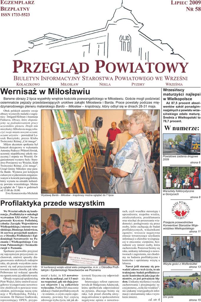 Wernisa¿ w Mi³os³awiu Wrzesiñscy maturzyœci najlepsi Barwne obrazy 2 lipca wype³ni³y wnêtrze koœcio³a poewangelickiego w Mi³os³awiu. Goœcie mogli podziwiaæ w Wielkopolsce osiemnaœcie pejza¿y przedstawiaj¹cych urokliwe zak¹tki Mi³os³awia i Barda. Prace powsta³y podczas miêA¿ 87,5 procent absoldzynarodowego pleneru malarskiego Bardo – Mi³os³aw – krajobrazy, który odby³ siê w dniach 28-31 maja. wentów szkó³ ponadgimObok polskich autorów swoje obrazy wystawi³y malarki z zagranicy - Irmgard Hofman i Anastazja Fietisova. Obrazy, które eksponujemy s¹ podsumowaniem pracy uczestników pleneru. Dziêki nim mieszkañcy Mi³os³awia mog¹ zobaczyæ swoje miasto nowymi oczami, oczami artystów – powiedzia³ Leszek Burzyñski, prezes Klubu Twórczoœci Ró¿nej „Cóœ innego”. Mi³ym akcentem spotkania by³ koncert skrzypcowy w wykonaniu Antoniny Pedrycz i Wiktorii Siwiak, uczennic niepublicznej szko³y muzycznej I stopnia we Wrzeœni. Organizatorami wystawy by³y: Starostwo Powiatowe we Wrzeœni, Klub Twórczoœci Ró¿nej „Cóœ innego”, Urz¹d Gminy Mi³os³aw oraz parafia Bardo. Wystawa jest kolejnym ciekawym wydarzeniem zorganizowanym w koœciele poewangelickim, który wyrasta na oœrodek kulturalny powiatu wrzesiñskiego. Mo¿na j¹ ogl¹daæ do 7 lipca w godzinach od 15.00 do 18.00. Ewa Konarzewska-Michalak nazjalnych z powiatu wrzesiñskiego zda³o maturê. Œrednia z Wielkopolski to 78,7 procent. W numerze: Powiatowe zadania drogowe 2009 strona 6 Warsztaty folklorystyczne w Gorzycach strona 8 Wystawê Bardo - Mi³os³aw - krajobrazy mo¿na ogl¹daæ do 7 lipca Profilaktyka przede wszystkim We Wrzeœni odby³a siê konferencja „Profilaktyka w onkologii wyzwaniem XXI wieku”. Na zaproszenie Krystyny Poœledniej, cz³onka Zarz¹du Województwa Wielkopolskiego, i starosty wrzesiñskiego, Dionizego Jaœniewicza, 16 czerwca przyjechali naukowcy z Oœrodka Profilaktyki i Epidemiologii Nowotworów we Poznaniu i Wielkopolskiego Centrum Pulmonologii i Torakochirurgii w Poznaniu. Spotkanie pozwoli³o przyjrzeæ siê najczêstszym przyczynom zachorowañ, omówiæ sposoby diagnozowania niektórych rodzajów raka, ale przede wszystkim zastanowiæ siê nad przyczynami traktowania tematu choroby jak tabu. Próbowano te¿ wskazaæ sposoby na ograniczenie jej oddzia³ywania. Obrady rozpocz¹³ epidemiolog Piotr Wojtyœ, który omówi³ szczegó³owo wystêpowanie nowotworów z³oœliwych w powiecie wrzesiñskim, porównuj¹c nasz¹ sytuacjê z Wielkopolsk¹, Polsk¹ i œwiatem. Dr Dariusz Godlewski, reprezentuj¹cy OPEN, przypo- W konferencji wziê³o udzia³ wielu prelegentów, m.in. z Oœrodka Profi- laktyki i Epidemiologii Nowotworów we Poznaniu mnia³ z kolei, ¿e 1/3 nowotworów da siê unikn¹æ, zaœ 1/3 mo¿na rozpoznaæ, gdy nie daj¹ jeszcze objawów i s¹ ca³kowicie wyleczalne. Podkreœli³ znaczenie edukacji i badañ profilaktycznych - te ostatnie, o czym czêsto zapominamy, powinny byæ czêœci¹ zdrowego trybu ¿ycia, tak jak ak- tywnoœæ fizyczna czy odpowiednia dieta. Interesuj¹cy referat zaprezentowa³a dr Ma³gorzata Adamczak, która spróbowa³a odpowiedzieæ na pytanie, dlaczego boimy siê raka. Lêk przed chorob¹ utrzymuj¹ utrwalone w spo³eczeñstwie negatywne opinie o nowotwo- rach, czyli wszelkie stereotypy i uprzedzenia; niepe³na wiedza, zniekszta³cenia, przek³amania oraz niechêæ do poszerzania wiadomoœci; pos³ugiwanie siê przez osoby, które zachêcaj¹ do badañ profilaktycznych, wskaŸnikami zgonów; wreszcie negatywne emocje towarzysz¹ce uzyskaniu informacji o chorobie wystêpuj¹cej w otoczeniu: cierpienie, bezradnoœæ czy œmieræ osoby, która zachorowa³a. Poniewa¿ boimy siê raka, unikamy informacji o nowotworach i zagro¿eniu, nie chodzimy na badania profilaktyczne i kontrolne i opóŸniamy wizytê u lekarza. Nawet jeœli staramy siê prowadziæ zdrowy tryb ¿ycia, to nie traktujemy badañ profilaktycznych i kontrolnych jako jego elementów, co jest powa¿nym b³êdem. Unikamy myœlenia o ryzyku zachorowania i przyjmujemy raczej postawê „wolê nie wiedzieæ”, nie szukamy wiarygodnych informacji i uto¿samiamy raka z wyrokiem œmierci. cd. str. 6 Przejêcie przewodnictwa Konwentowi Starostów Województwa Wielkopolskiego strona 11 Wizyta goœci z Wolfenbüttel strona 13 Dni pola strona 15 2 Lipiec 2009 INFORMACJE ABECAD£O Ryszarda Matuszaka dziom nies³ysz¹cym i niedos³ysz¹cym kontakt ze œwiatem zewnêtrznym i pomagaæ im normalnie funkcjonowaæ w spo³eczeñstwie. www.wrzesnia.powiat.pl Przemys³aw Moch, nauczyciel biologii i przysposobienia obronnego w Zespole Szkó³ Zawodowych nr 2, jeden ze zdobywców tytu³u „Nauczyciel z pasj¹”. Najwa¿niejsze s¹ zasady ci¹gu siedemnastu lat pracy obserwowa³em niepokoj¹c¹ zmianê obyczajów. Nie jestem zwolennikiem budowania murów miêdzy nauczycielem a uczniem. Relacje miêdzy nimi powinny byæ zdrowe. Gwarantuj¹ je jasno okreœlone zasady i ich przestrzeganie. Tymczasem uczniowie maj¹ wiêcej praw ni¿ obowi¹zków, to powoduje, ¿e staj¹ siê za bardzo bezpoœredni, nie wyczuwaj¹ granicy m³odzie¿doroœli. Niestety nie uznaj¹ ¿adnych autorytetów, to jest powa¿nym problemem. ¯ jak ¿yczliwoœæ, która jest dla mnie bardzo wa¿n¹ cech¹. Staram siê byæ osob¹ ¿yczliw¹ i mo¿e dziêki temu czêsto spotykam siê z ¿yczliwoœci¹ innych ludzi. Pragnê w swoim imieniu oraz Stowarzyszenia „Jednoœæ” podziêkowaæ tym, którzy pracuj¹ na rzecz osób nies³ysz¹cych za ich ¿yczliwoœæ i zaanga¿owanie. Wrêczenie Ryszardowi Matuszakowi nagrody starosty wrzesiñskiego za szczególne zas³ugi na rzecz osób nies³ysz¹cych i niedos³ysz¹cych A jak autorytet, którym dla mnie jest nasz ukochany Papie¿, Jan Pawe³ II. B jak biurokracja, której nadmiar jest uci¹¿liwy dla ludzi i utrudnia realizacjê wielu ciekawych inicjatyw i przedsiêwziêæ. C jak cz³owiek roku, wyró¿nienie, którego nie traktujê jako wyró¿nienia indywi