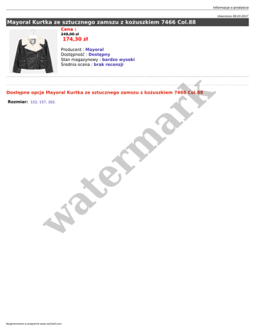 Informacje o produkcie Utworzono 08-03-2017 Mayoral Kurtka ze sztucznego zamszu z kożuszkiem 7466 Col.88 Cena : 249,00 zł 174,30 zł Producent : Mayoral Dostępność : Dostępny Stan magazynowy : bardzo wysoki Średnia ocena : brak recenzji w at Rozmiar: 152, 157, 162. er m ar k Dostępne opcje Mayoral Kurtka ze sztucznego zamszu z kożuszkiem 7466 Col.88 Wygenerowano w programie www.oscGold.com