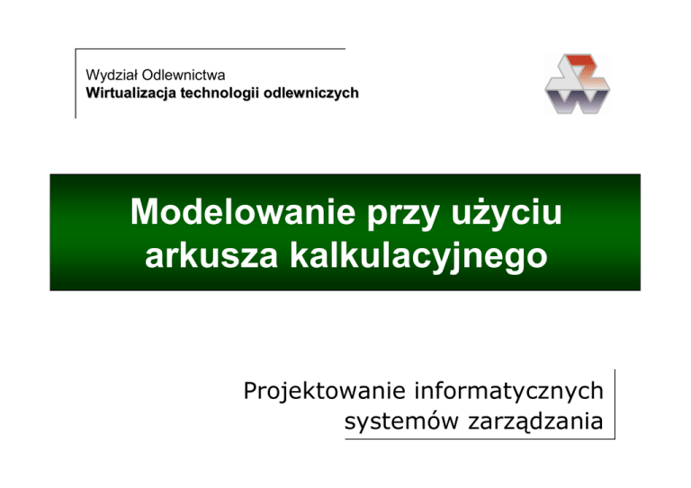 Wydział Odlewnictwa Wirtualizacja technologii odlewniczych Modelowanie przy uŜyciu arkusza kalkulacyjnego Projektowanie informatycznych systemów zarządzania Wprowadzenie Zasady Opis Solvera Przykład Modelowanie przy uŜyciu arkusza kalkulacyjnego Modelowania przy uŜyciu arkusza kalkulacyjnego 2 Arkusze kalkulacyjne są programami ogólnego przeznaczenia słuŜącymi do prowadzenia obliczeń finansowych. Z reguły tego typu działanie wymaga częstego przeliczania wyników, o ile następują jakieś zmiany w danych wejściowych. Tradycyjna metoda - polegająca na ręcznym wpisywaniu danych do odpowiedniego formularza i przeliczaniu ich przy pomocy kalkulatora - jest zbyt wolna i nieefektywna. Arkusz jest elektronicznym następcą płachty papieru podzielonej na rzędy i kolumny wykorzystywanej juŜ w 14 wieku przez kupców z Wenecji i Genui. Pomysł i pierwszy arkusz powstał w 1979 roku; studenci Harvard Business School i M.I.T., Dan Bricklin i Robert Frankston opracowali VisiCalc - elektroniczny arkusz kalkulacyjny. Modelowanie przy uŜyciu arkusza kalkulacyjnego Arkusz kalkulacyjny 3 Arkusz zorganizowany jest jako macierz n kolumn (ponumerowanych od A ...) i m wierszy (1,...,m). KaŜda pozycja (komórka) tej macierzy przedstawionej na ekranie odpowiada polu w pamięci komputera; pole to moŜe zawierać daną numeryczną, tekstową lub formułę obliczeniową. Innymi słowy kaŜdą komórkę charakteryzuje jej adres i zawartość. W obliczeniach odwołujemy się do adresu (nazwy) komórki, przez co mamy dostęp do jej zawartości. Elastyczność arkusza polega na tym, Ŝe komputer pamięta wszystkie dane, formuły i obliczenia, których dokonuje uŜytkownik. Tak więc jeśli zmieni on jakąkolwiek daną lub formułę, wszystkie powiązane dane zostaną natychmiast ponownie przekalkulowane. Pozwala to nie tylko szybko poprawiać ewentualne pomyłki, ale takŜe badać róŜne moŜliwości (ang. what if - co się stanie jeśli). Modelowanie przy uŜyciu arkusza kalkulacyjnego Arkusz kalkulacyjny 4 Zasady modelowania Zasady modelowania przy uŜyciu arkusza nie róŜnią się od ogólnych zasad, jednakŜe arkusz kalkulacyjny - dzięki swemu interfejsowi - stwarza duŜe moŜliwości uporządkowanej i systematycznej pracy. Cykl modelowania: 2. zebranie danych, 3. sformułowanie modelu, 4. weryfikacja modelu, 5. wybór sposobu (algorytmu) rozwiązania problemu, 6. prezentacja wyników (interfejs), 7. zastosowanie modelu. Modelowanie przy uŜyciu arkusza kalkulacyjnego 1. zdefiniowanie problemu, 5 Większość modeli ilościowych zawiera dane wejściowe, zmienne decyzyjne i dane wyjściowe. Dane wejściowe wprowadzają do modelu wartości stałe w trakcie pojedynczego eksperymentu, zmienne decyzyjne to zmienne kontrolowane przez decydenta. Dane wyjściowe są określone przez dane wejściowe i decyzyjne i słuŜą do wyboru pewnej kombinacji wartości zmiennych decyzyjnych, najlepszych z punktu widzenia rozwiązania problemu. Modelowanie przy uŜyciu arkusza kalkulacyjnego Zasady modelowania 6 Przykładem niech będzie prosty model konkurencji cenowej: mamy wyznaczyć cenę sprzedaŜy maksymalizującej zysk naszego przedsiębiorstwa działającego na rynku lokalnym, na którym działa konkurent. Znamy nasz koszt sprzedaŜy oraz rozkład cen konkurenta. W tym przypadku danymi wejściowymi są: koszt sprzedaŜy i rozkład cen konkurenta, zmienną decyzyjną - nasza cena, a danymi wyjściowymi - nasz udział w rynku i nasz zysk ze sprzedaŜy. Nie naleŜy mylić danych wejściowych z decyzyjnymi np. w powyŜszym przypadku często za zmienną decyzyjną uznawana jest cena konkurenta, na którą przecieŜ nie mamy Ŝadnego wpływu. Modelowanie przy uŜyciu arkusza kalkulacyjnego Zasady modelowania 7 Zasady modelowania Modelowanie przy uŜyciu arkusza polega na wprowadzeniu danych wejściowych i decyzyjnych do arkusza oraz powiązaniu ich formułami w celu otrzymania danych wyjściowych. Kiedy model jest gotowy mamy co najmniej trzy moŜliwości: 1. wykonać analizę wraŜliwości, w celu pokazania jak dane wejściowe i zmienne decyzyjne wpływają na wyjścia, 2. znaleźć zestaw danych decyzyjnych (często spełniający nałoŜone ograniczenia), który optymalizuje dane wyjściowe, 3. znaleźć zestaw danych decyzyjnych, który daje rozwiązanie zadowalające. Modelowanie przy uŜyciu arkusza kalkulacyjnego 8 Zasady modelowania Podczas tworzenia modeli w arkuszu naleŜy trzymać się określonych zasad: 1. przejrzysty, logiczny układ arkusza, 2. wyraźne rozdzielenie poszczególnych części modelu (osobno zmienne wejściowe, decyzyjne, ograniczenia i wyjścia), 3. jednoznaczne nazewnictwo części modelu i wszystkich danych, 4. wykorzystanie moŜliwości nazywania komórek i ich zakresów, 5. wykorzystanie moŜliwości formatowania arkusza (kroje i wielkości czcionki, kolory itp.), 6. komentowanie zawartości komórek, 7. wykorzystanie okienek tekstowych do objaśniania załoŜeń. Modelowanie przy uŜyciu arkusza kalkulacyjnego 9 Solver jest tzw. dodatkiem dostarczanym przez firmę Frontline System (nie jest więc produktem Microsoftu). Narzędzie to świetnie nadaje się do rozwiązywania małych i średnich problemów optymalizacyjnych, przede wszystkim liniowych. Frontline System jest producentem róŜnych komercyjnych wersji Solvera m.in. Premium Solvera, który - dzięki wbudowanemu algorytmowi genetycznemu - radzi sobie z problemami nie do rozwiązania przy uŜyciu standardowego Solvera. Modelowanie przy uŜyciu arkusza kalkulacyjnego Solver 10 Solver 1. maksymalnie 200 zmiennych decyzyjnych 2. większość funkcji standardowych (m.in. jeŜeli, max, min) nie moŜe być uŜywanych, jeśli zmienne decyzyjne (pośrednio bądź bezpośrednio) są argumentami tych funkcji; czyni to czasem Solver narzędziem dość niewygodnym (bo trzeba korzystać z róŜnych trików) lub wręcz niepraktycznym. Modelowanie przy uŜyciu arkusza kalkulacyjnego Cechy i ograniczenia 11 Podstawy korzystania prz