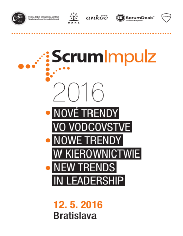 2016 Nové trendy vo vodcovstve Nowe trendy w kierownictwie New trends in leadership 12. 5. 2016 Bratislava ScrumImpulz 2016 „Byť lídrom znamená byť so sebou večne nespokojný. Lídri sú vždy v pohybe, na ceste, menia sa. Snažia sa zlepšovať počas celého svojho života.“ „Być liderem znaczy być zawsze niezadowolonym z siebie. Liderzy są zawsze w ruchu, na drodze, zmieniają się. Starają się doskonalić w całym swoim życiu.” “To be a leader means to be always dissatisfied with yourself. Leaders are always on the move, on the road, they are changing. They are trying to improve all their life.” Alexandre Havard Usporiadatelia úspešnej medzinárodnej konferencie si vás dovoľujú pozvať už na 5. ročník ScrumImpulz 2016. Každoročne sa tejto konferen‑ cie zúčastňuje viac ako 100 ľudí z rôznych krajín Európy aj z iných častí sveta. Hľadať a objavovať inovatívne prístupy k vedeniu, ktoré pomáhajú zvyšovať efektivitu organizácií a skvalitňovať tímovú prácu prostredníctvom prednášok, aktivít a rozhovorov, prichádzajú ľudia z celého sveta. Inová‑ cie sú náročné, ale zároveň predstavujú výzvy a pomáhajú spoločnosti napredovať. Je nespochybniteľné, že inovatívnosť je získaná, nie vrodená. Na základe postupných fáz inovácie vznikli zásadné pravidlá. Počas tejto konferencie sa budeme snažiť prostredníctvom diskusií a ďalších aktivít účastníkom priblížiť aktuálne trendy v inováciách vedenia a manažmentu v teórii a praxi. Cieľom tejto konferencie je vytvoriť priestor na interdisciplinárnu di‑ skusiu medzi vedeckými a odbornými pracovníkmi z akademickej oblasti a z praxe. Oblasť skúmanej problematiky je zameraná na: agilný, projekto‑ vý a strategický manažment. Odborný dialóg bude riešiť aj otázky z oblastí vedenia, tímovej práce, motivácie, psychológie, sociológie a etiky. Prepája‑ nie viacerých vedných odborov a vedecko‑praktické poznatky pomáhajú jedincovi a organizácii orientovať sa na skutočný prínos. Pre vodcovstvo je nevyhnutné poznanie predností a hodnoty človeka, konanie v čase, efek‑ tívne rozhodovanie, ďalej je nevyhnutná správna komunikácia, práca ako cieľavedomá činnosť, princípy inovácií, osobnostné vzdelávanie. Súčasťou konferencie je aj kultúrno‑spoločenský večer tvorený vokálno ‑inštrumentálnou interpretáciou, propagáciou produktov a ochutnávkou nápojov. Zorganizowana już po raz piąty, udana międzynarodowa konferencja na temat nowych trendów w zarządzaniu lączy teorię i praktykę na skalę globalną. Co rok bierze w niej udział ponad 100 osób z różnych krajów Eu‑ ropy i innych części świata. Przyjeżdżają ludzie z całego świata aby szu‑ kać i odkrywać nowe, innowacyjne metody zarządzania, które pomagają zwiększać efektywność organizacji i doskonalić pracę zespołową poprzez wykłady, działania i dyskusje. Innowacje są trudne i niebezpieczne. Nie ma wątpliwości, że innowacyjność jest nabyta, a nie wrodzona. W wyniku ko‑ lejnych faz innowacji powstały podstawowe przepisy. Dzięki tej konferencji możliwe jest uzyskanie aktualnych informacji w tej sprawie, nawiązywanie nowych kontaktów, dzielenie się wiedzą, doświadczeniami i prowadzenie naukowych dyskusji. Celem konferencji jest stworzenie przestrzeni dla interdyscyplinarnej dyskusji między naukowcami i specjalistami ze środowisk akademickich. Obszar badanych problemów koncentruje się na zarządzaniu w obsza‑ rach: aktywny, projektowy, strategiczny. Dotyczy kwestii przywództwa, pracy zespołowej, motywacji, psychologii, socjologii i etyki. Połączenie wielu dyscyplin i wiedza naukowo‑praktyczna pomaga osobom i organi‑ zacji skupić się na realnych korzyściach. Dla przywództwa jest kluczowe zrozumienie wartości osoby, działanie w czasie, efektywne podejmowa‑ nie decyzji, niezbędna jest odpowiednia komunikacja, praca jako celowe działanie, zasady innowacyjne, edukacja osobista. Konferencja to także wydarzenie kulturalno‑społeczne składające się z wokalno‑instrumentalnej interpretacji, propagacji produktów i napojów do degustacji. The organising committee of the successful international conference is inviting you to 5 year ScrumImpulz 2016. Every year is attended by over 100 people from different European countries and other parts of the world. Searching and discovering new innovative approaches to management that help organizations increase efficiency and improve teamwork through lec‑ tures, discussions and activities, are coming people from all over the world. Innovation is difficult and dangerous. There is no doubt that innovation is acquired, not innate. Following successive phases of the innovation were set substantive rules. Through this conference, making new contacts, sharing knowledge, experience and scientific‑technical discussions it is possible to get an update on this issue. The aim of this conference is to create a space for interdisciplinary di‑ scussion between scientists and professionals from academia and practice. Area of research problems is focused on the management of areas: agile, project, strategic. Connecting the issue of leadership, teamwork, motivation, psychology, sociology and ethics help the individual and the organization to focus on real benefits. Interconnecting multiple disciplines and scientific and practical knowledge helps the individual and the organization to focus on real benefits. For leadership is essential understanding the strengths and values of a person, proceeding in time, effective decision making, as well as a purposeful activity, principles of innovation and self‑education. Part of the conference is also a cultural and social event consists of vocal and instrumental interpretation, promotion of products and tasting beverages. ScrumImpulz 2016 Oblasti diskutovaných tém: Stratégie vzdelávania agi