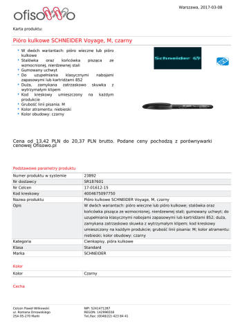 Warszawa, 2017-03-08 Karta produktu: Pióro kulkowe SCHNEIDER Voyage, M, czarny W dwóch wariantach: pióro wieczne lub pióro kulkowe Stalówka oraz końcówka pisząca ze wzmocnionej, nierdzewnej stali Gumowany uchwyt Do uzupełniania klasycznymi nabojami zapasowymi lub kartridżami 852 Duża, zamykana zatrzaskowo skuwka z wytrzymałym klipem Kod kreskowy umieszczony na każdym produkcie Grubość linii pisania: M Kolor atramentu: niebieski Kolor obudowy: czarny Cena od 13,42 PLN do 20,37 PLN brutto. Podane ceny pochodzą z porównywarki cenowej Ofisowo.pl Podstawowe parametry produktu Numer produktu w systemie 23892 Nr dostawcy SR187601 Nr Celcen 17-01612-15 Kod kreskowy 4004675097750 Nazwa produktu Pióro kulkowe SCHNEIDER Voyage, M, czarny Opis W dwóch wariantach: pióro wieczne lub pióro kulkowe; stalówka oraz końcówka pisząca ze wzmocnionej, nierdzewnej stali; gumowany uchwyt; do uzupełniania klasycznymi nabojami zapasowymi lub kartridżami 852; duża, zamykana zatrzaskowo skuwka z wytrzymałym klipem; kod kreskowy umieszczony na każdym produkcie; grubość linii pisania: M; kolor atramentu: niebieski; kolor obudowy: czarny Kategoria Cienkopisy, pióra kulkowe Klasa Standard Marka SCHNEIDER Kolor Kolor Czarny Cecha Celcen Paweł Witkowski ul. Romana Dmowskiego 25A 05-270 Marki NIP: 5241471287 REGON: 142996558 Tel./fax: (0048/22) 423 84 41 Warszawa, 2017-03-08 Karta katalogowa produktu cd. Pióro kulkowe SCHNEIDER Voyage, M, czarny W ofercie od 2015-01 Produkt Pióro kulkowe Typ Klasyczny Wymiary Grubość linii (mm) M Certyfikaty Nowy produkt w ofercie Standard Certyfikaty, normy, patenty ISO 12757-2 Hit Standard Wspólny słownik zamówień CPV 30192121-5 Serdecznie zapraszamy do współpracy zespół. Ofisowo.pl Celcen Paweł Witkowski ul. Romana Dmowskiego 25A 05-270 Marki NIP: 5241471287 REGON: 142996558 Tel./fax: (0048/22) 423 84 41